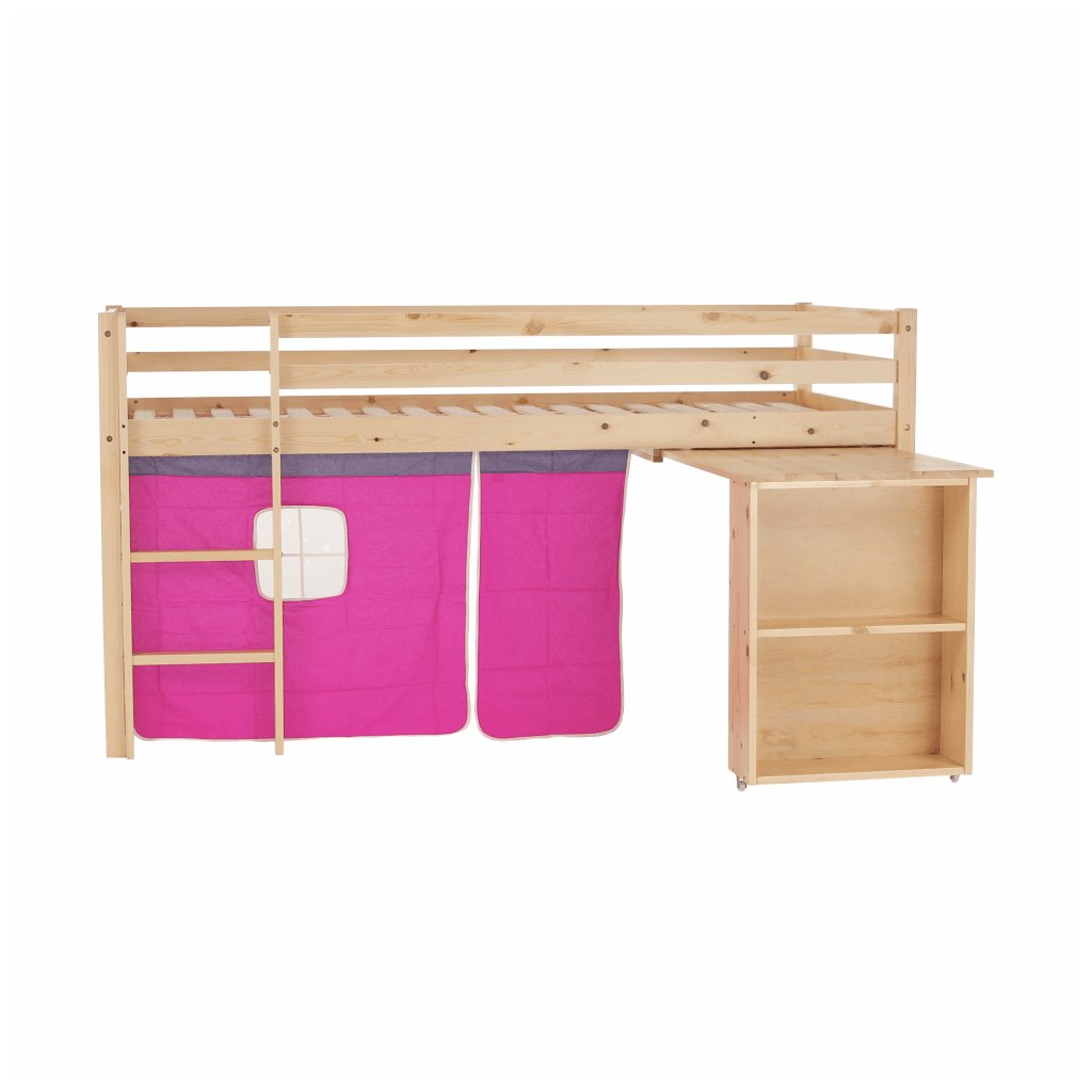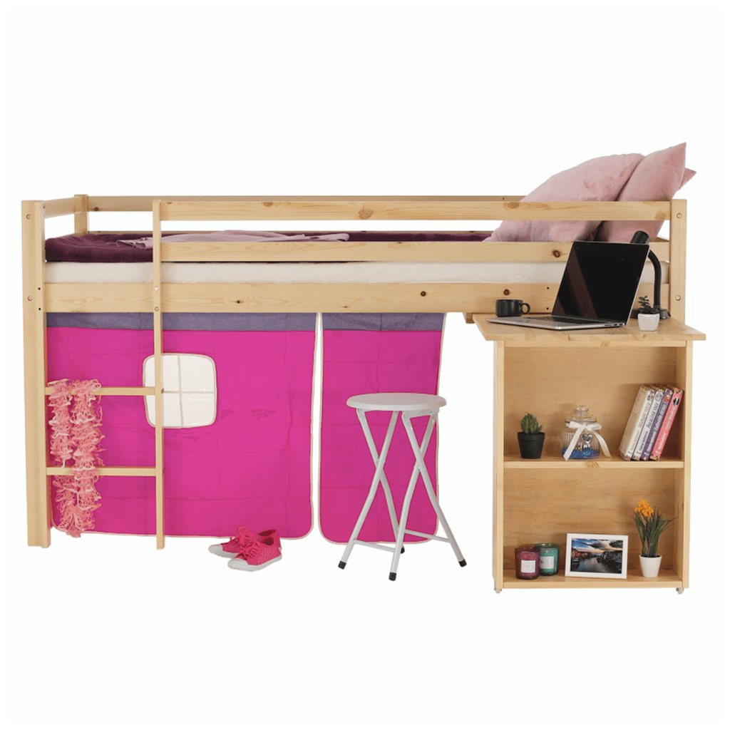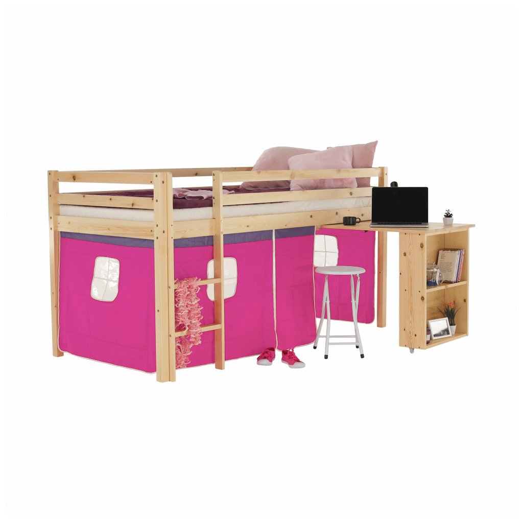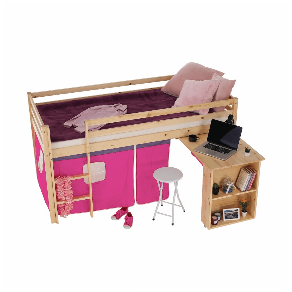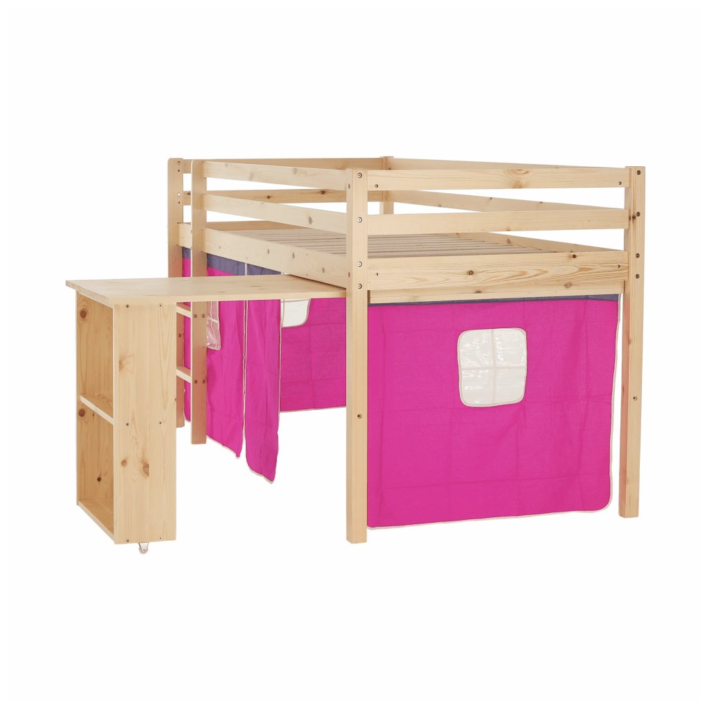 I vy bojujete s nedostatkem místa v pokoji vašeho dítěte? Úsporným řešením může být i postel se zvýšeným lůžkem, jejíž součástí je i PC stůl s regálem . Za růžovým závěsem si vaše dítě založí vlastní pevnost a ukryje všechna svá tajemství. Na kreslení, čtení knih a časopisů, také na školní úkoly zas poslouží šikovný psací stůl , který je z boční strany obohacený o regál se dvěma úložnými plochami . Když je třeba jít spát, malý rošťák šikovně vyběhne do postele po dřevěném žebříku, který lze upevnit na pravou nebo levou stranu postele .