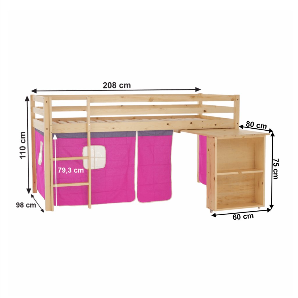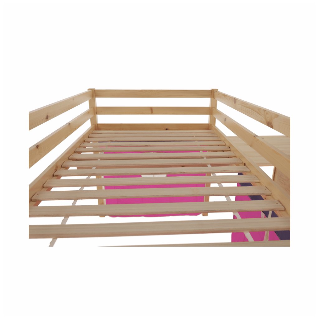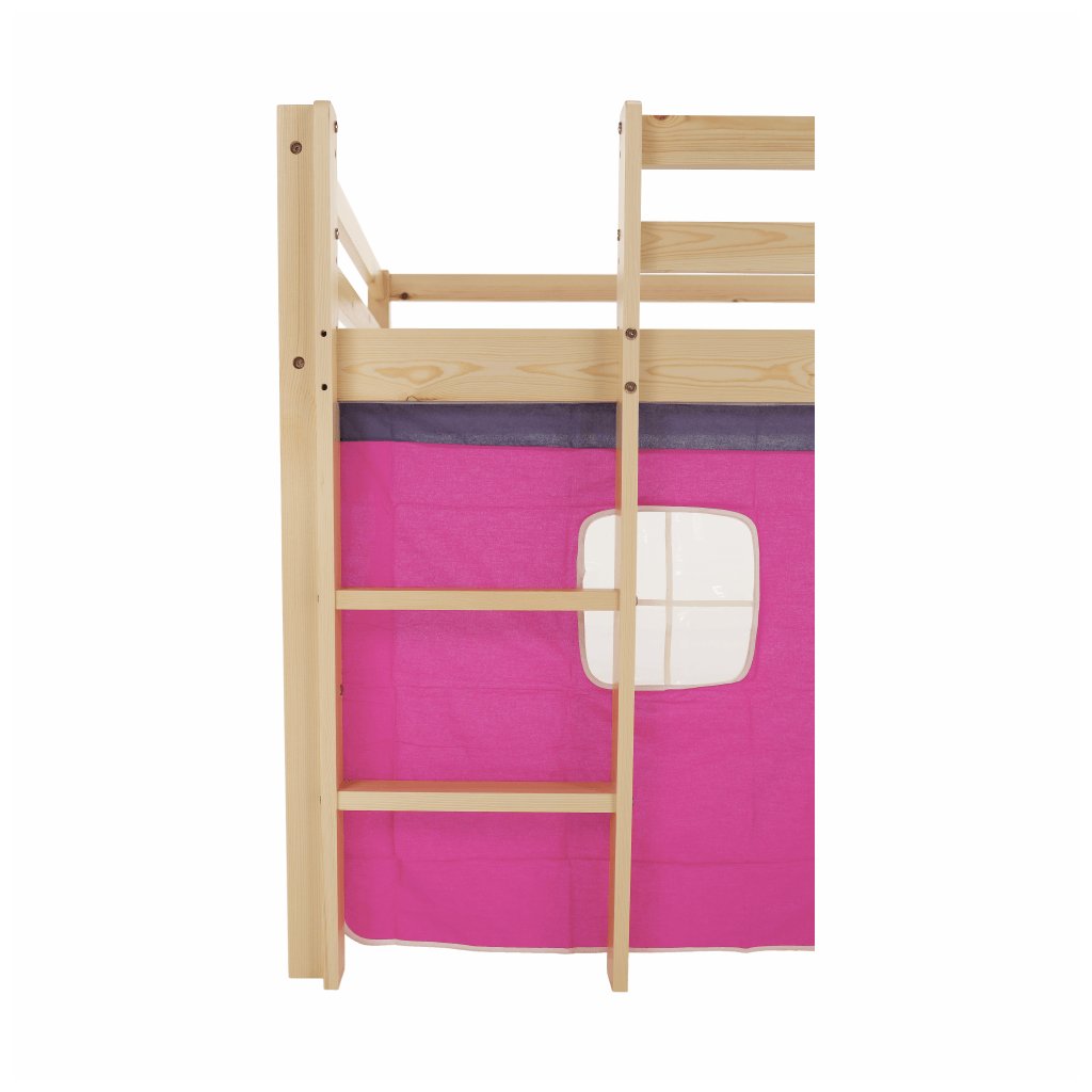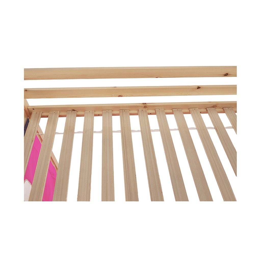 Součástí postele je mimo jiné laťkový rošt z překližky.Maximální výška matrace na horní lůžko: 14 cm. Tloušťka materiálu: 20 mm. Tloušťka materiálu nohou (ŠxH): 50x50 mm Nosnost: 80 kg. Psací stolek s regálem univerzální žebřík. Matraci o velikosti 90x200cm je třeba dokoupit. Postel je vyrobena z borovicového dřeva v přírodní barvě , které je charakteristické tím, že je vysoce kvalitní, lehké, měkké a pružné. Růžový závěs je z kvalitní bavlny .