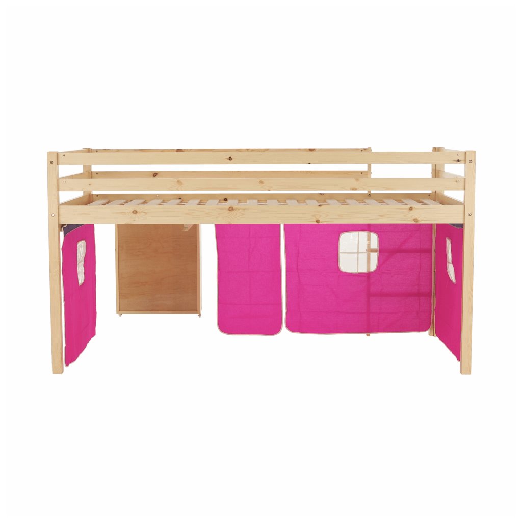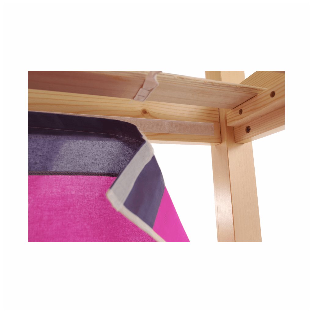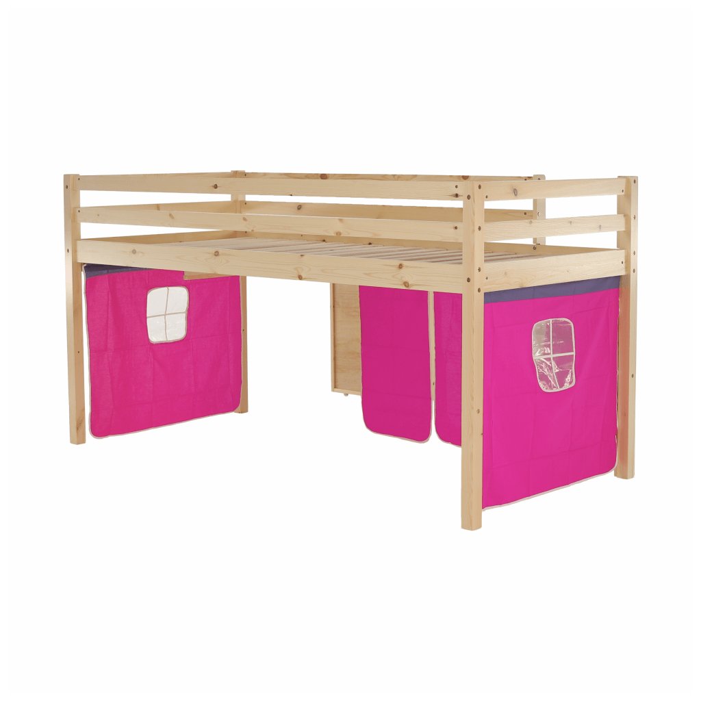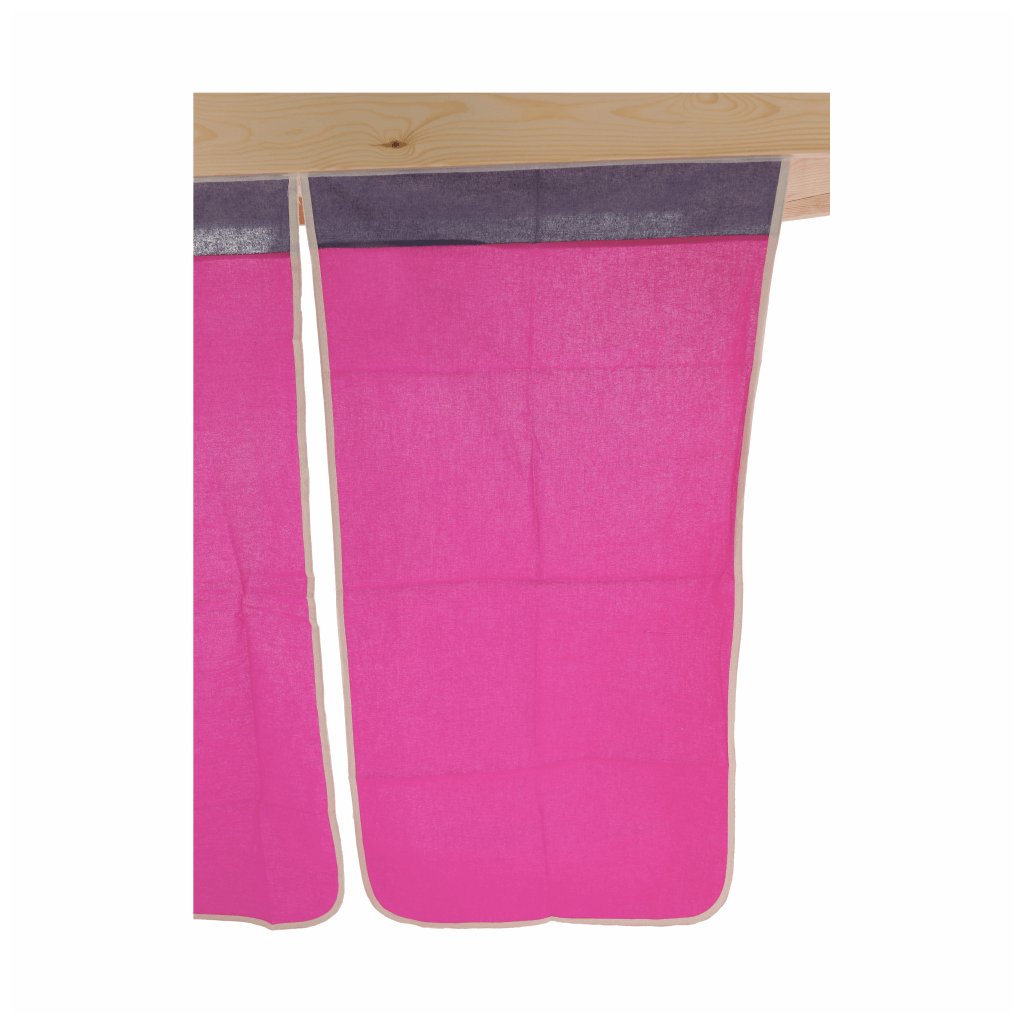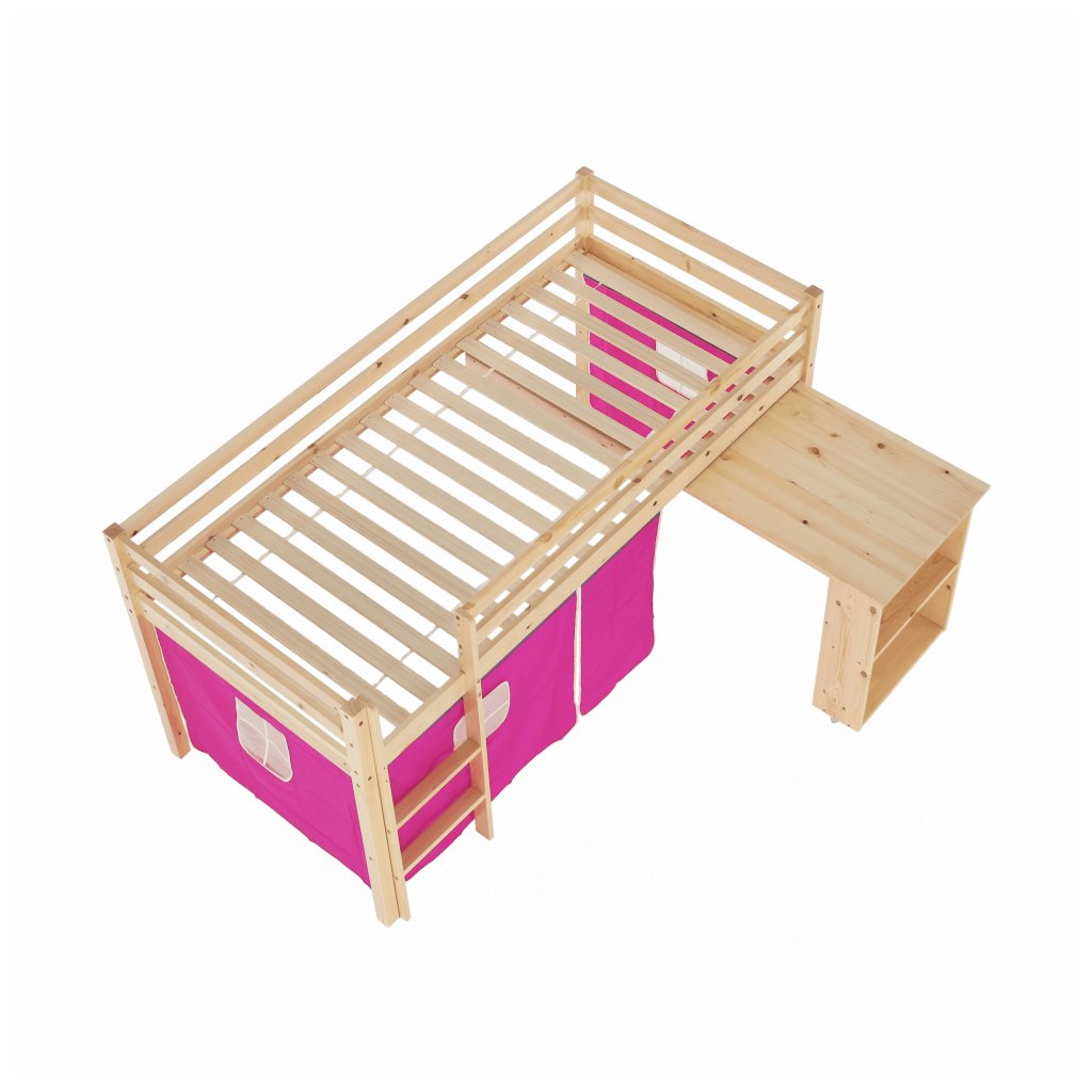 Součástí postele je mimo jiné laťkový rošt z překližky.Maximální výška matrace na horní lůžko: 14 cm. Tloušťka materiálu: 20 mm. Tloušťka materiálu nohou (ŠxH): 50x50 mm Nosnost: 80 kg. Psací stolek s regálem univerzální žebřík. Matraci o velikosti 90x200cm je třeba dokoupit. Postel je vyrobena z borovicového dřeva v přírodní barvě , které je charakteristické tím, že je vysoce kvalitní, lehké, měkké a pružné. Růžový závěs je z kvalitní bavlny .