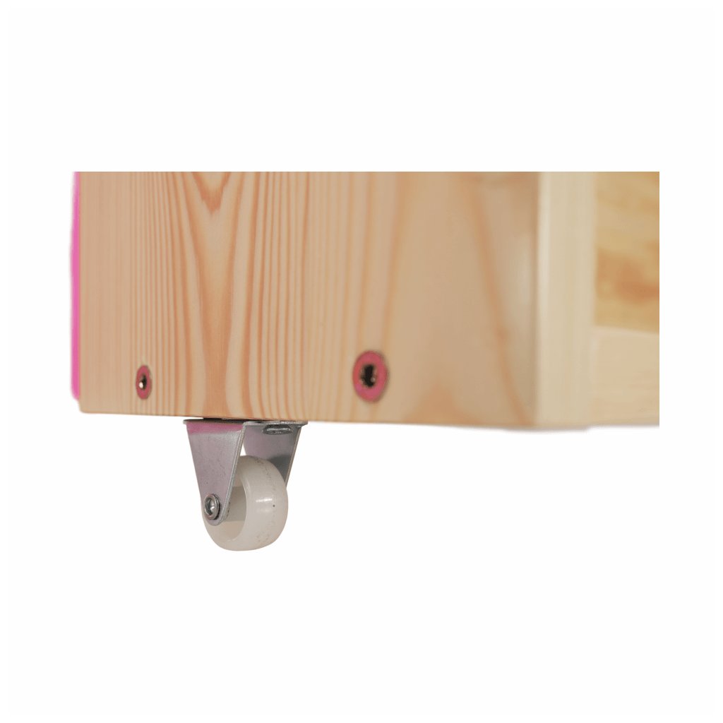 Palanda barva růžová dekor borovice deska dřevo/masiv na nožičkách 90x200 cm s roštem a se zábranou moderní selský styl jednolůžko.