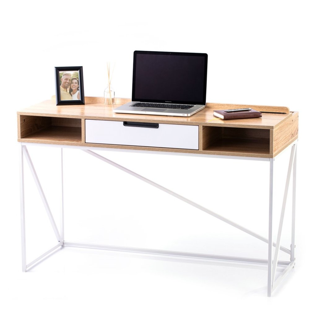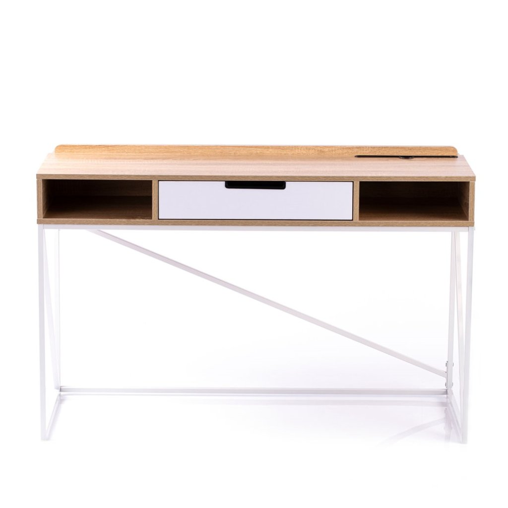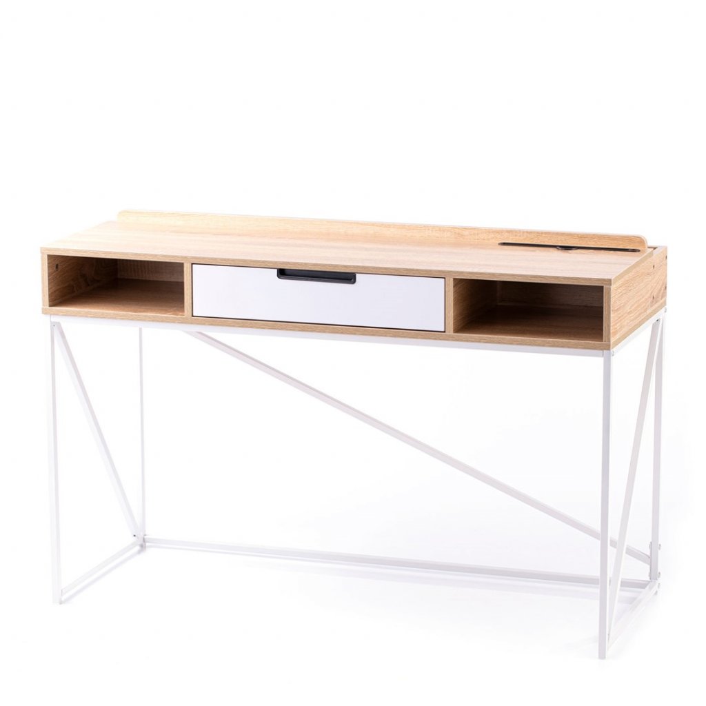 Pracovní stůl v jednoduchém industriálním stylu, v moderním dekoru dub, s kovovou konstrukcí v bílé barvě. Součástí stolu je odkládací prostor v kombinaci jedné zásuvky a dvou poliček. Deska stolu je vyrobena z dřevotřísky potažené melamimen.