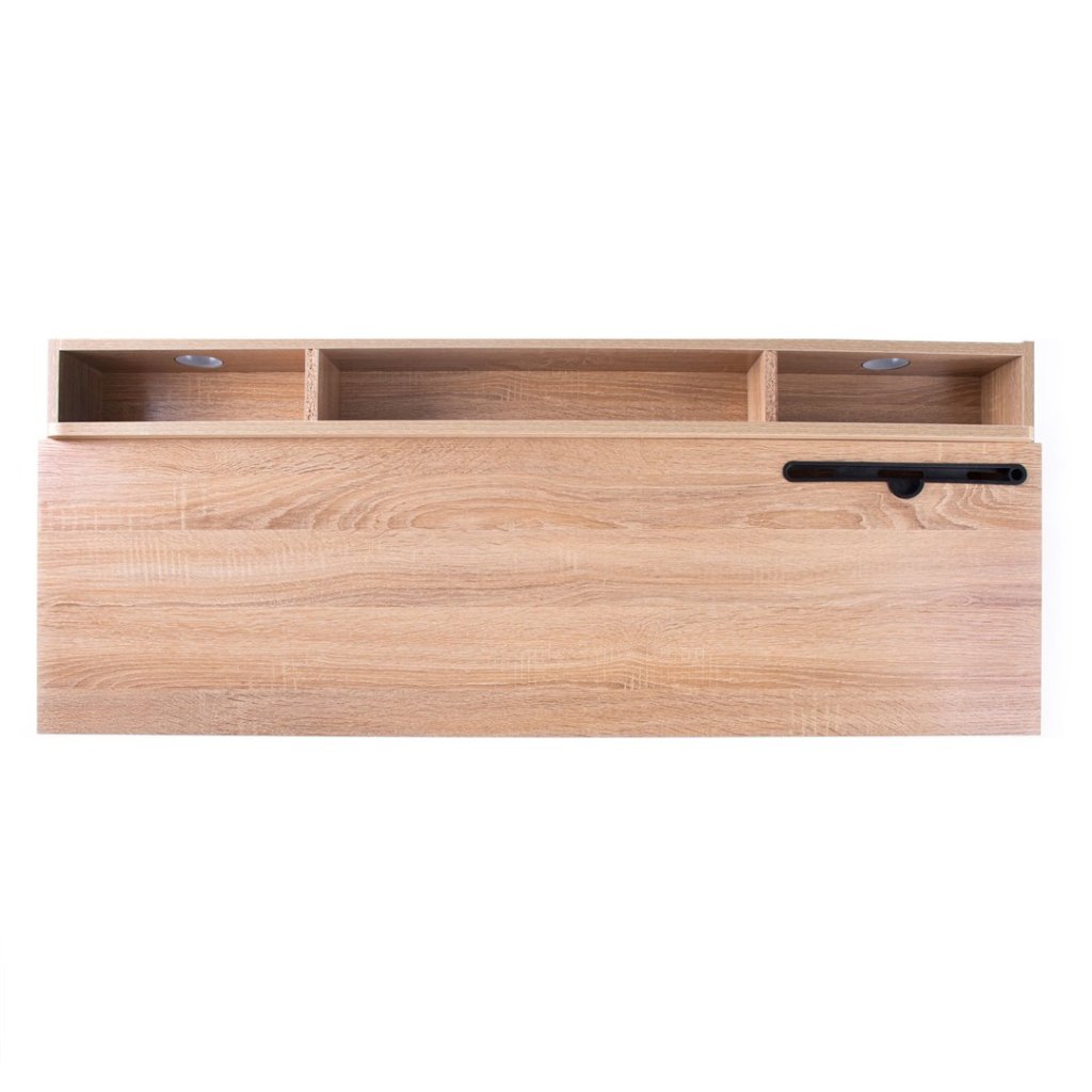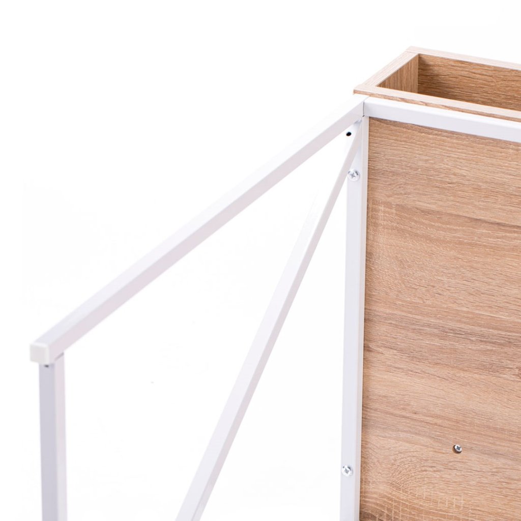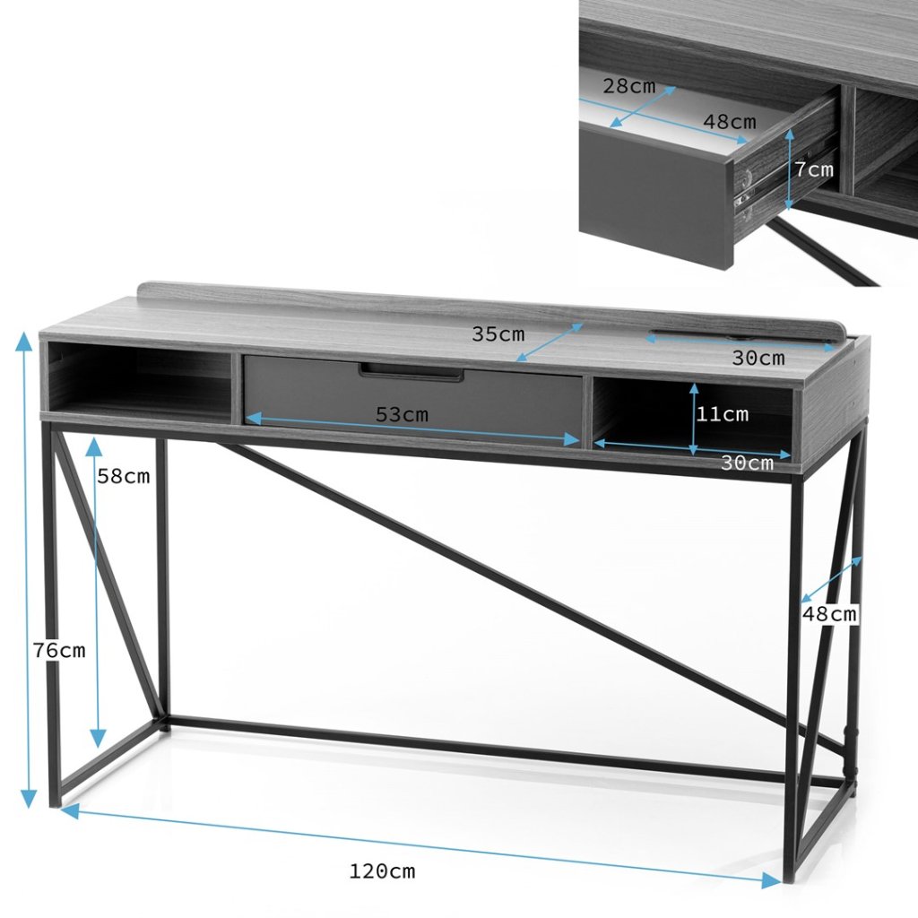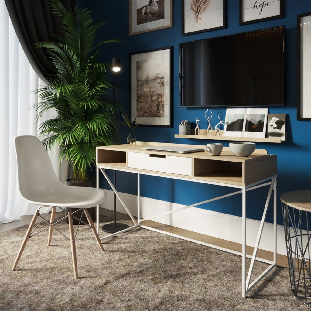 Pracovní stůl v jednoduchém industriálním stylu, v moderním dekoru dub, s kovovou konstrukcí v bílé barvě. Součástí stolu je odkládací prostor v kombinaci jedné zásuvky a dvou poliček. Deska stolu je vyrobena z dřevotřísky potažené melamimen.