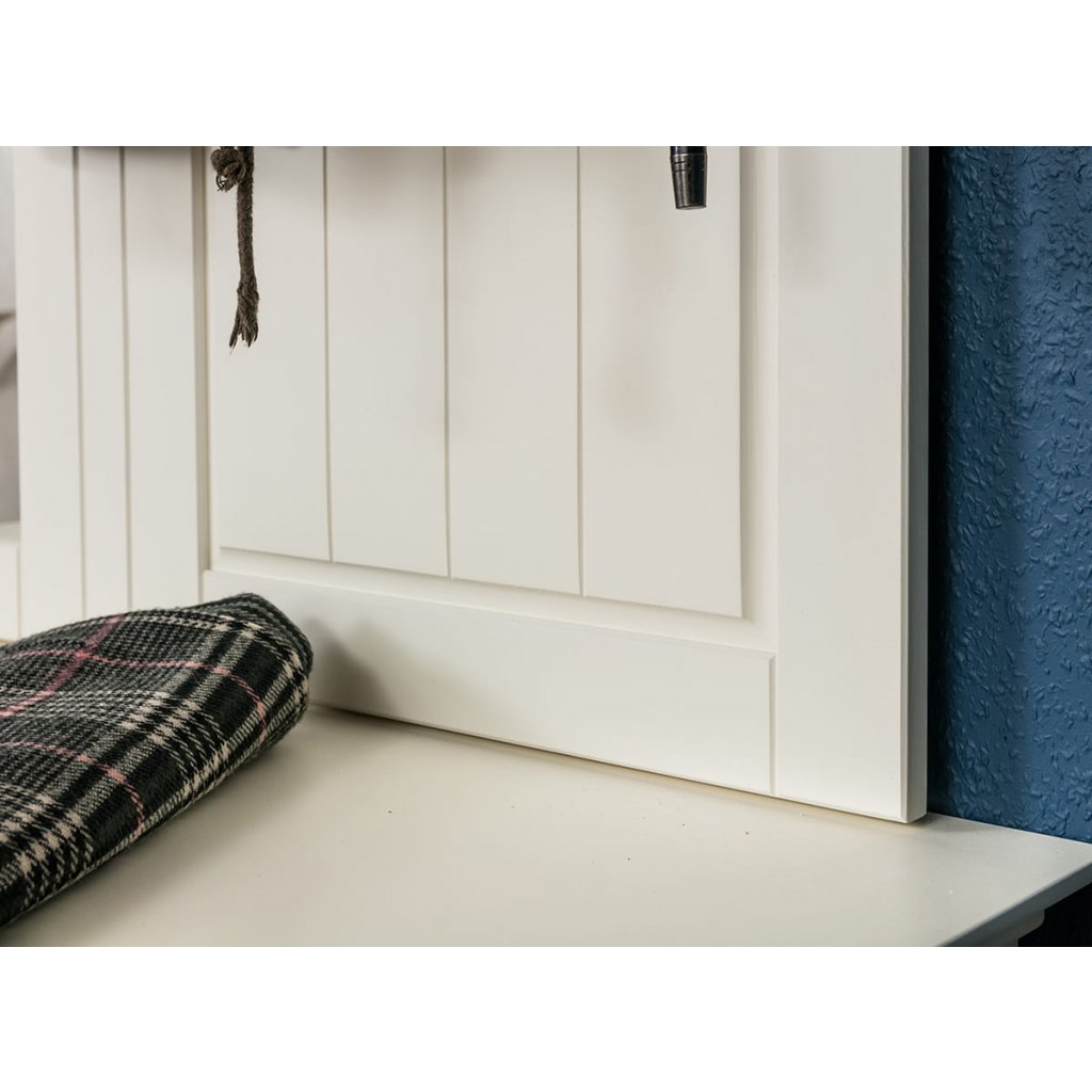 Bílý věšák byl vyroben z borovicového panelu, který byl zakončen jemnými dekoracemi (mlýnky). Vzhledem k tomu, že při výrobě bylo použito vysoce kvalitní přírodní dřevo , má tento výrobek na povrchu krásnou kresbu. Cítíte ho pod konečky prstů, což nábytku dodává přirozenou auru. Na ramínkách jsou tři dvojité háčky , díky kterým uložíte dvakrát tolik bund, kabátů nebo svetrů.