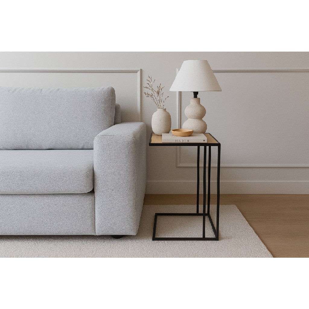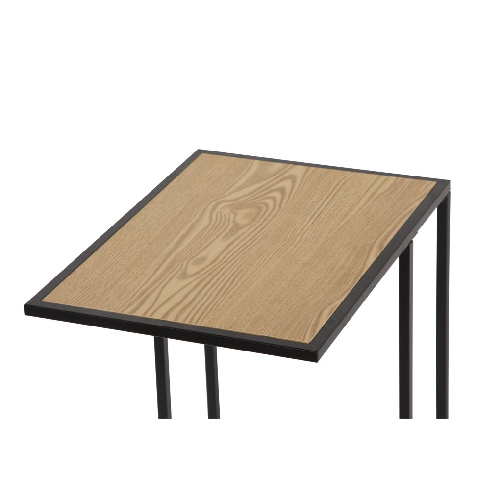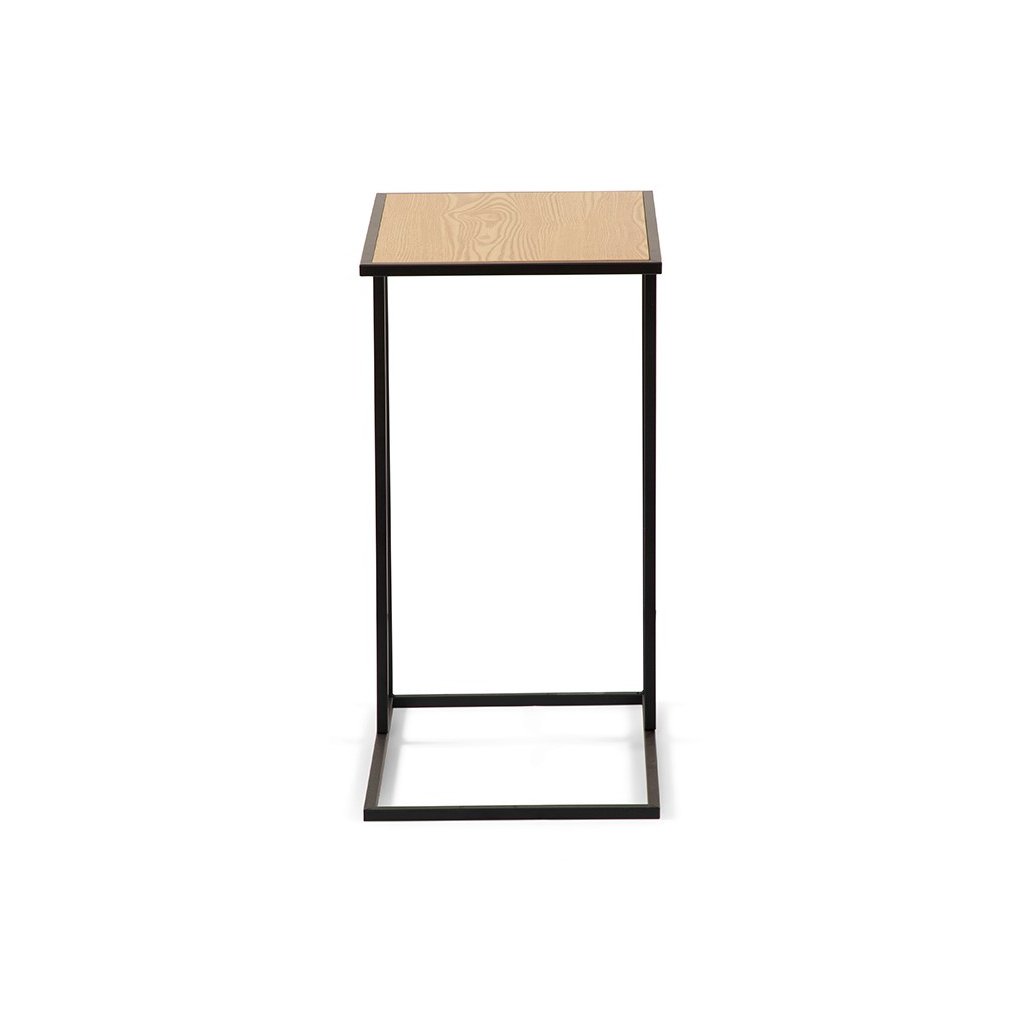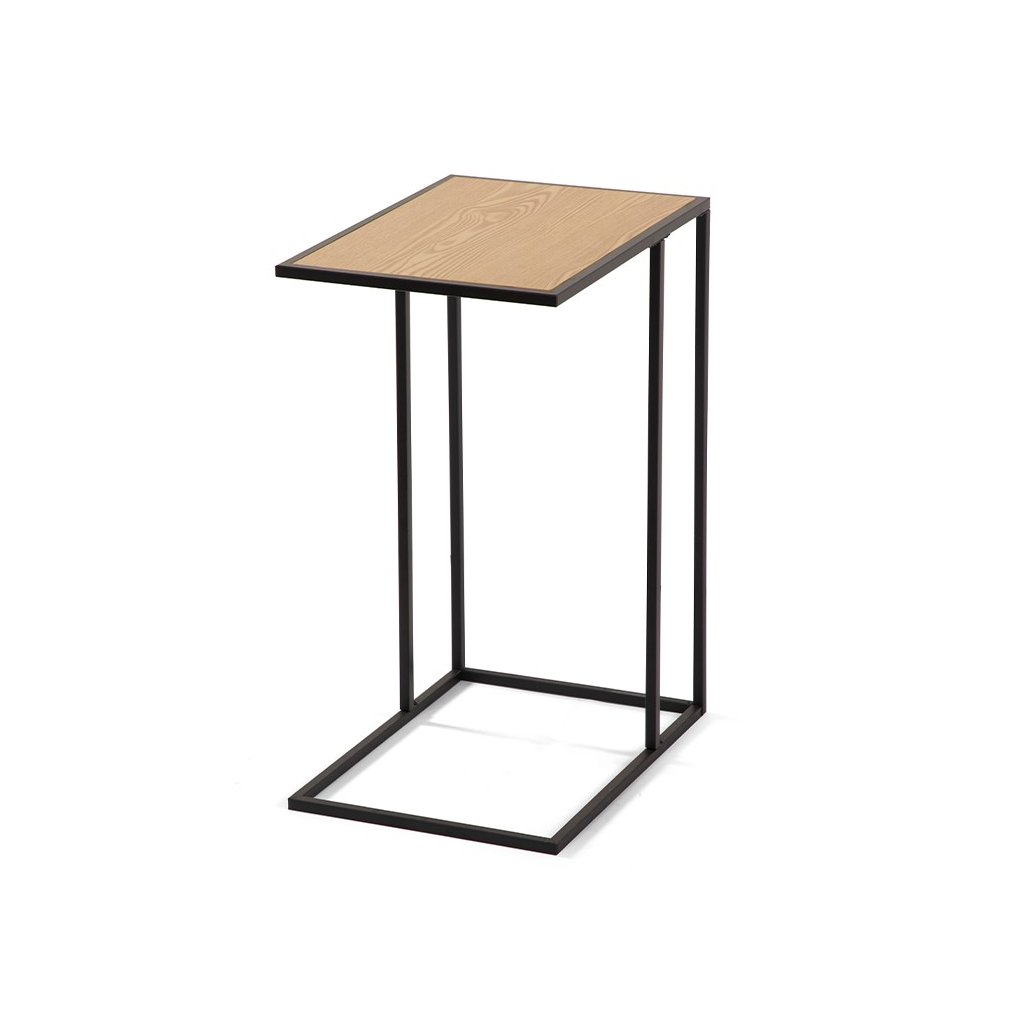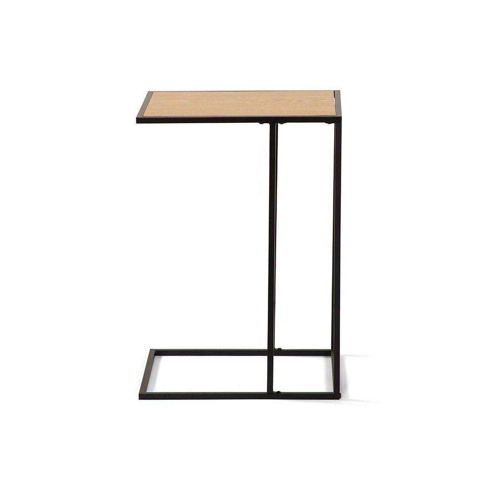 Konferenční stolek s minimalistickým designem. Stolová deska v dekoru přírodního dřeva dodává teplý vzhled. Stabilní kovová konstrukce v černém provedení. Praktický tvar umožňuje snadné zasunutí k sedačce či křeslu. Kombinace jednoduchosti, funkčnosti a elegantního stylu