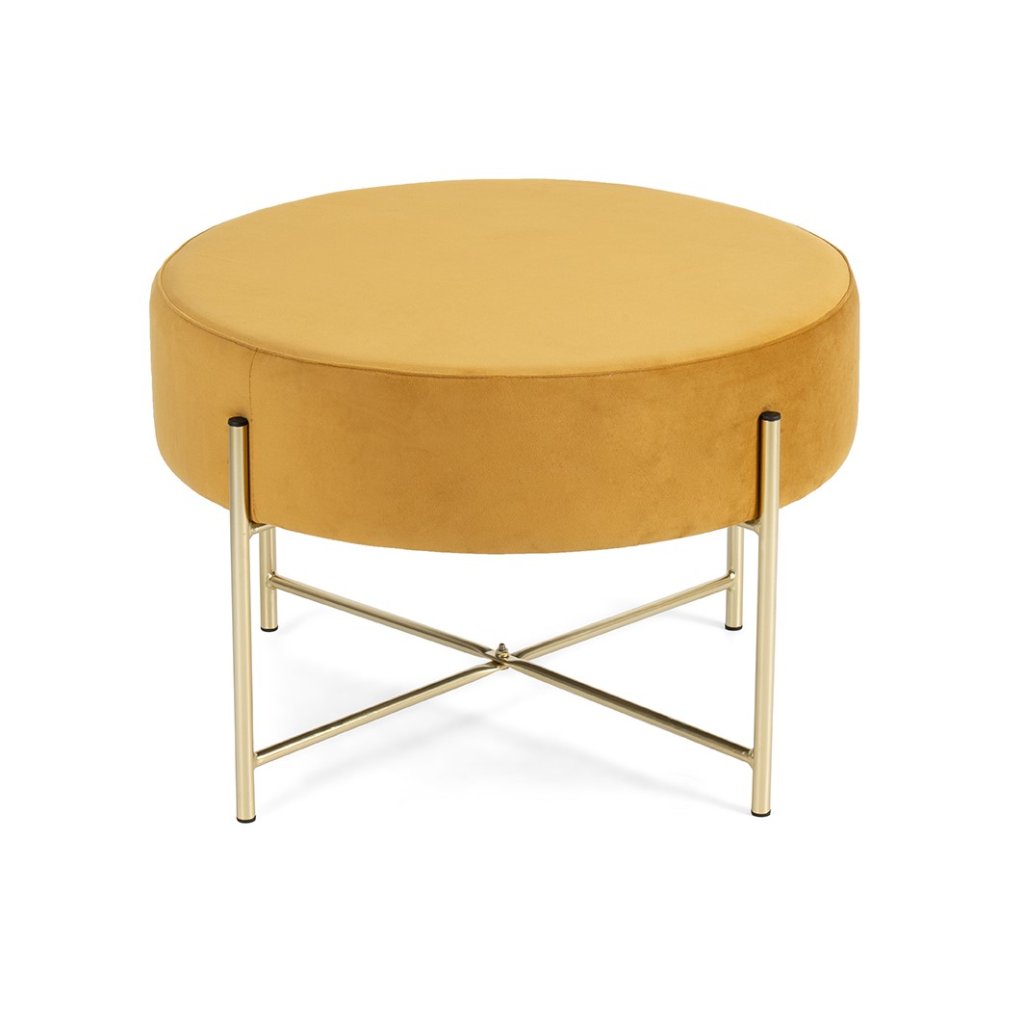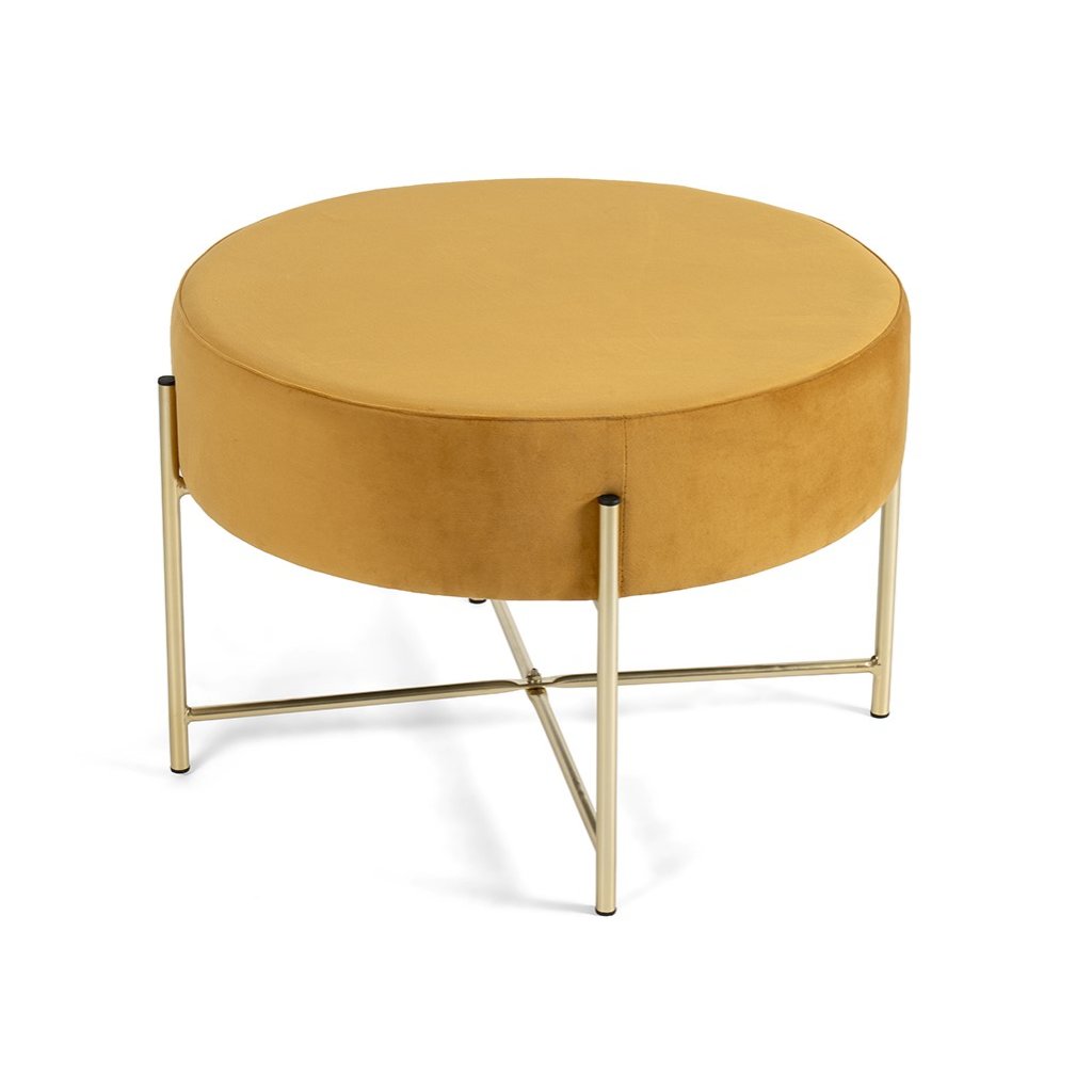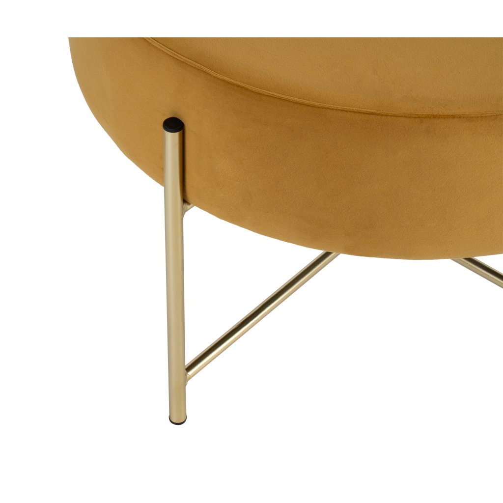 Kulatý taburet je dokonalým spojením moderního designu a praktičnosti. Čalouněný povrch z jemného sametu působí luxusně a příjemně na dotek, zatímco stabilní kovová konstrukce ve zlatém odstínu dodává celé konstrukci nádech elegance a stylu. Taburet se skvěle hodí jako stylový doplněk k sedací soupravě, odkládací stolek nebo extra místo k sezení. Díky svému jednoduchému, ale výraznému vzhledu zapadne do moderního, glamour i minimalistického interiéru.