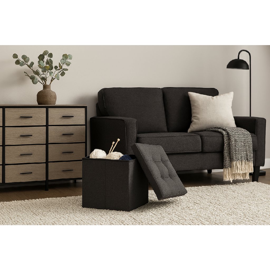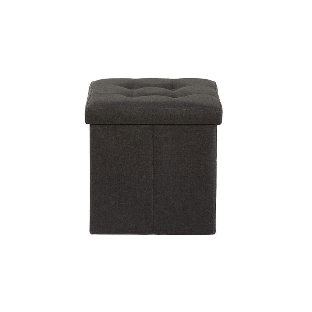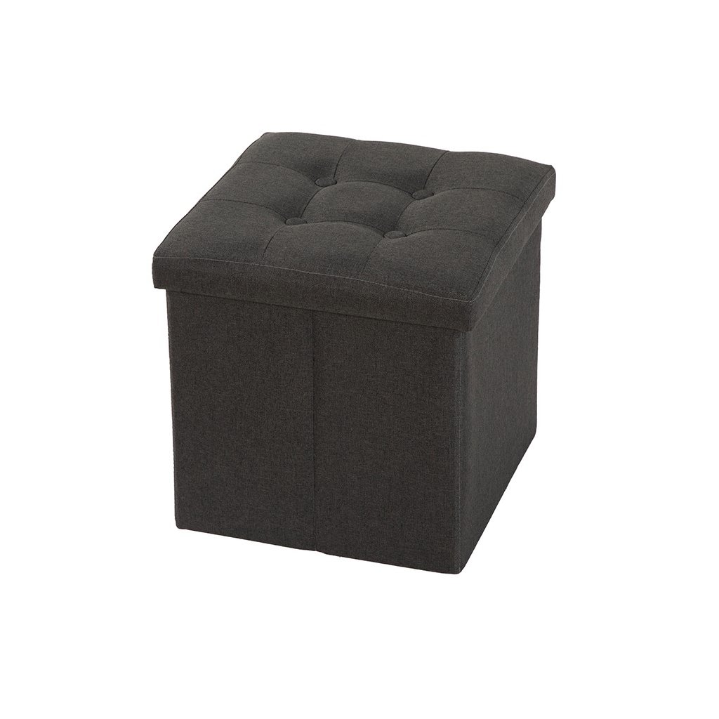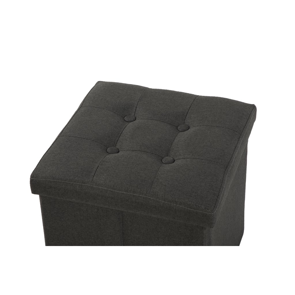 Praktická a elegantní taburetka s funkcí úložného prostoru. Vyrobena z odolné MDF konstrukce potažené kvalitní textilií v tmavě šedé barvě. Víko je čalouněné s jemným prošíváním, které dodává taburetce moderní vzhled. Díky skládacímu provedení lze úl...