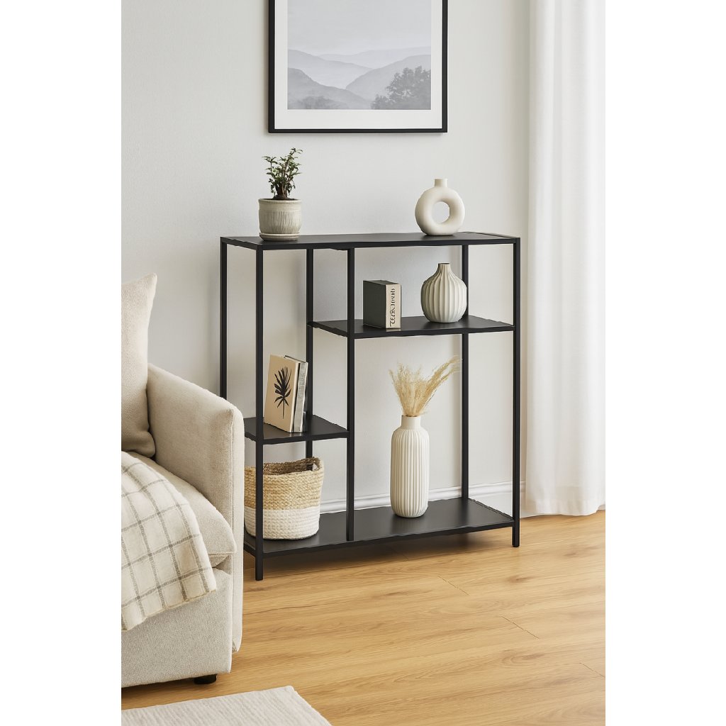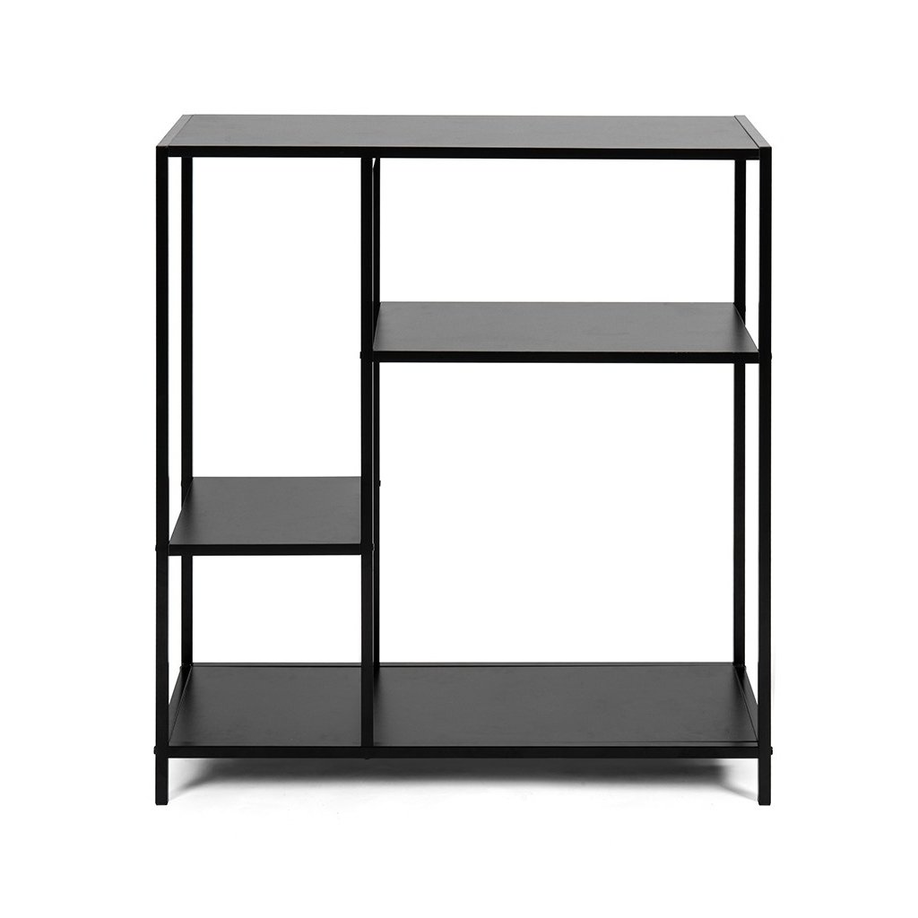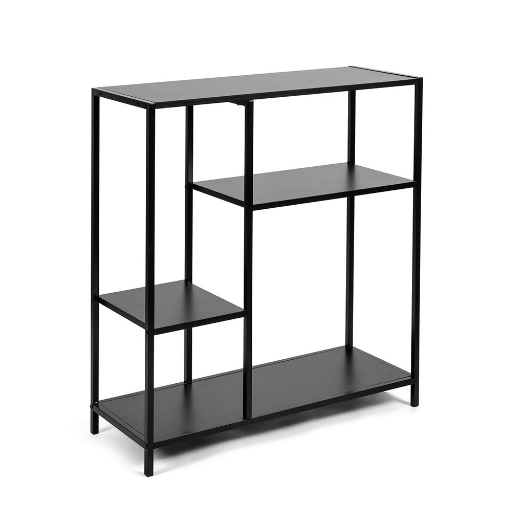 Praktický otevřený regál s kovovým rámem a policemi nabízí funkční úložný prostor s odlehčeným vzhledem. Díky asymetrickému rozložení polic působí zajímavě a zároveň poskytuje místo pro knihy, dekorace nebo doplňky.