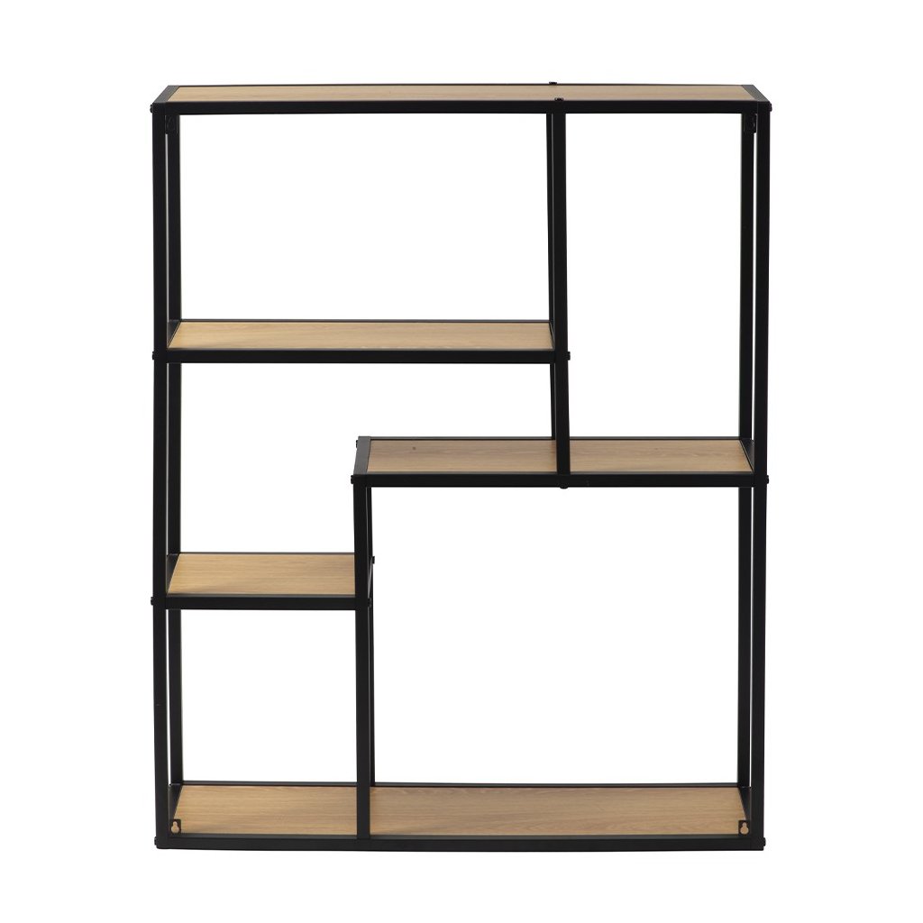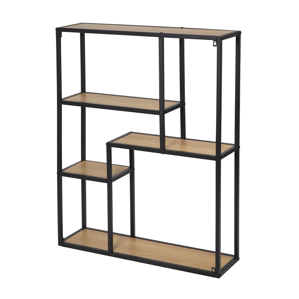 Praktický otevřený regál s kovovým rámem a policemi v dekoru přírodního dřeva nabízí funkční úložný prostor s odlehčeným vzhledem. Díky asymetrickému rozložení polic působí zajímavě a zároveň poskytuje místo pro knihy, dekorace nebo doplňky.