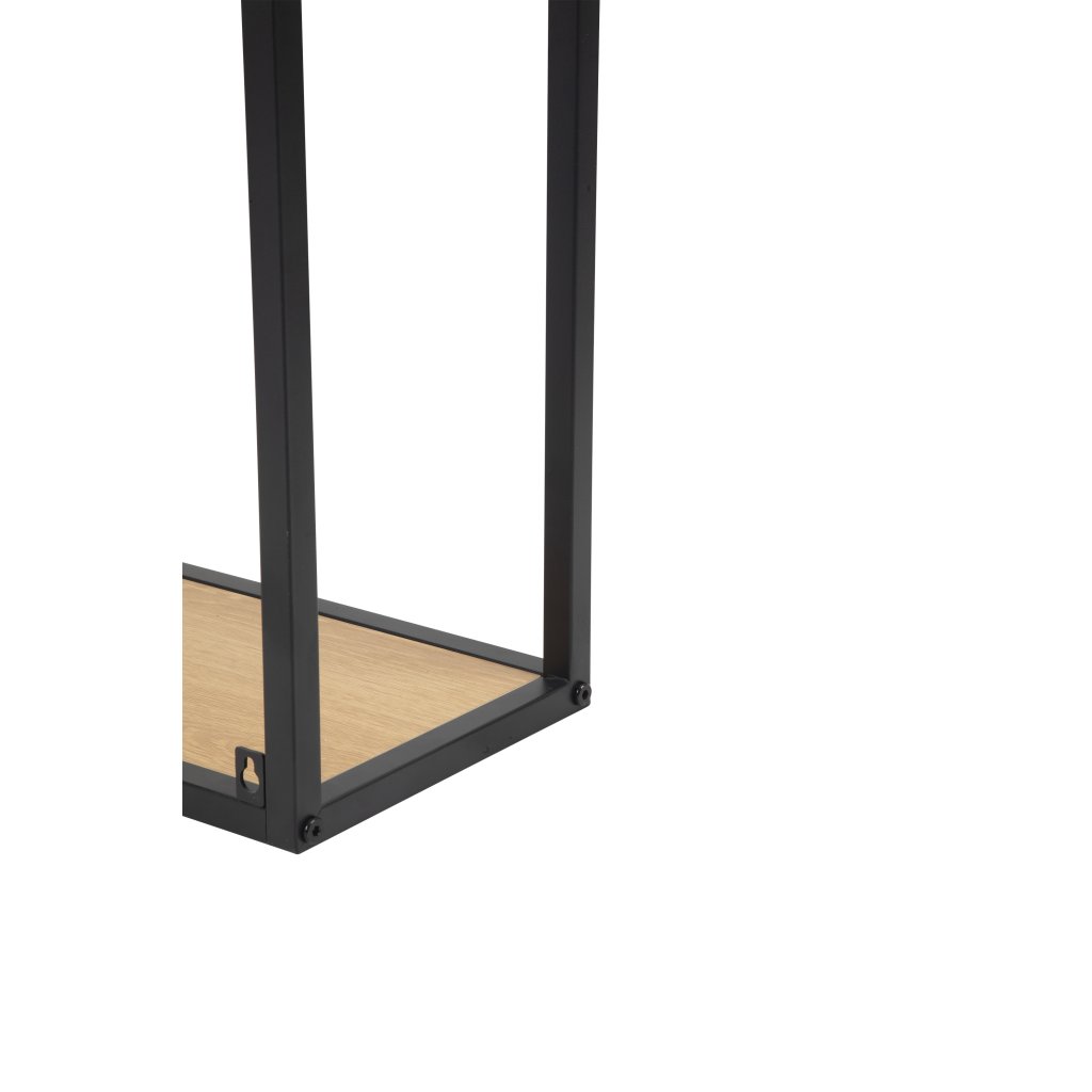 Černá kovová konstrukce zajišťuje stabilitu, zatímco laminované police jsou snadno udržovatelné a odolné vůči běžnému používání. Regál se hodí do obývacího pokoje, pracovny nebo vstupního prostoru.