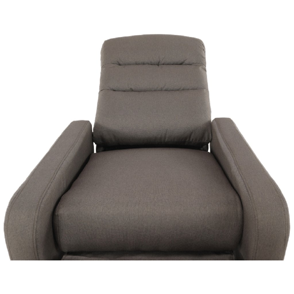 Polohovací, relaxační křeslo čalouněné hnědou látkou.