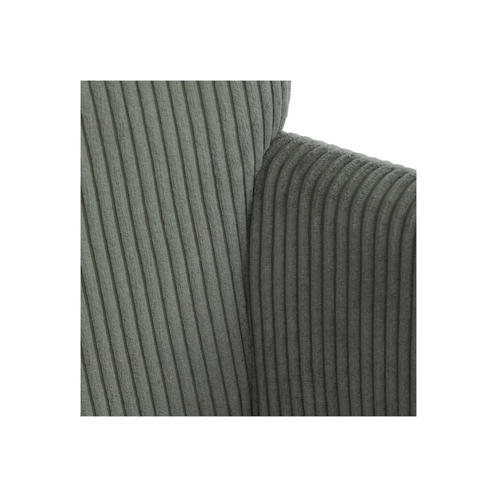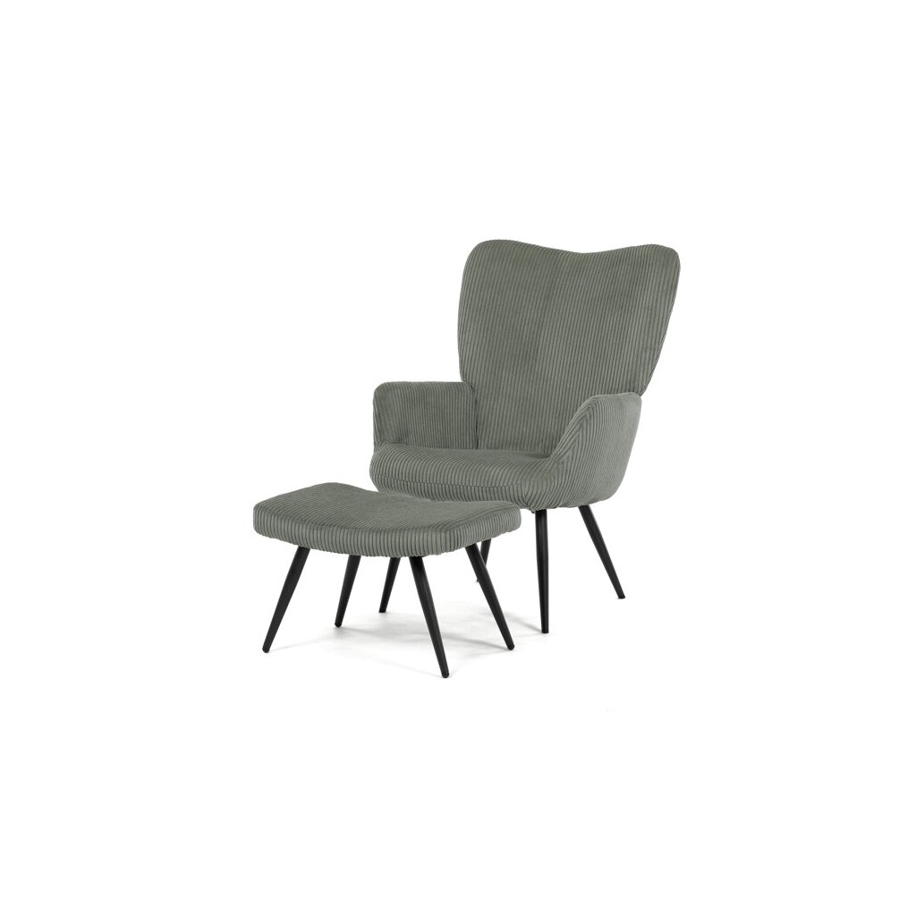 Relaxační křeslo s podnožkou v zeleném manšestru nabízí pohodlné posezení s měkkým, příjemným potahem, který zdůrazňuje strukturu manšestru. Pevné černé kovové nohy zajišťují stabilitu a dlouhou životnost, zatímco integrované područky přispívají k pohodlí při odpočinku. Křeslo není otočné ani rozkládací, ale díky přidanému taburetu umožňuje pohodlné opření nohou a relaxaci. Design kombinuje klasický tvar s moderním materiálem, což jej činí vhodným doplňkem do obývacích pokojů i relaxačních zón. Celková konstrukce je navržena tak, aby poskytovala komfortní sezení s důrazem na pevnost a stabilitu.