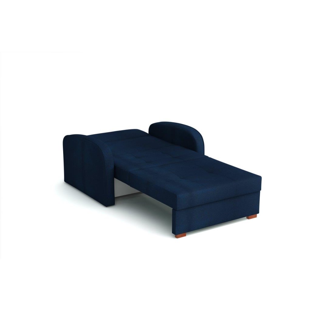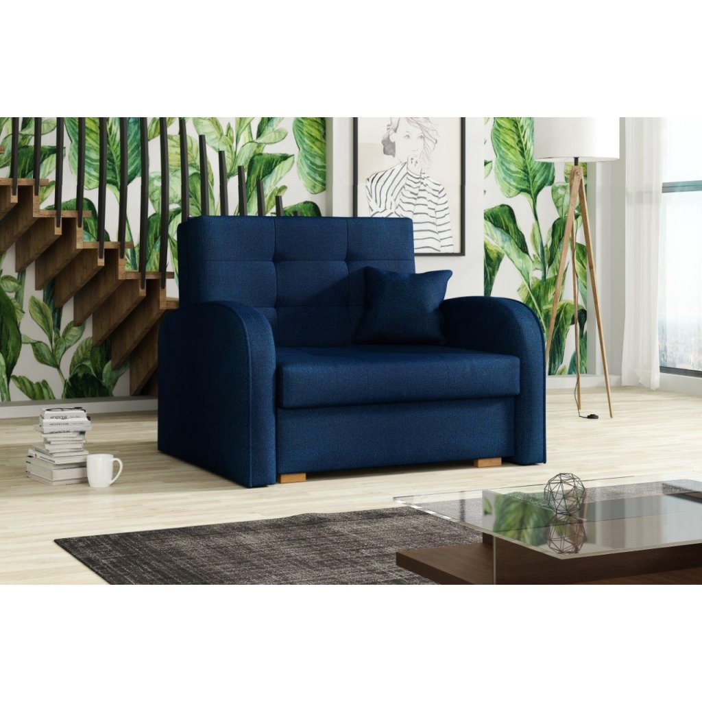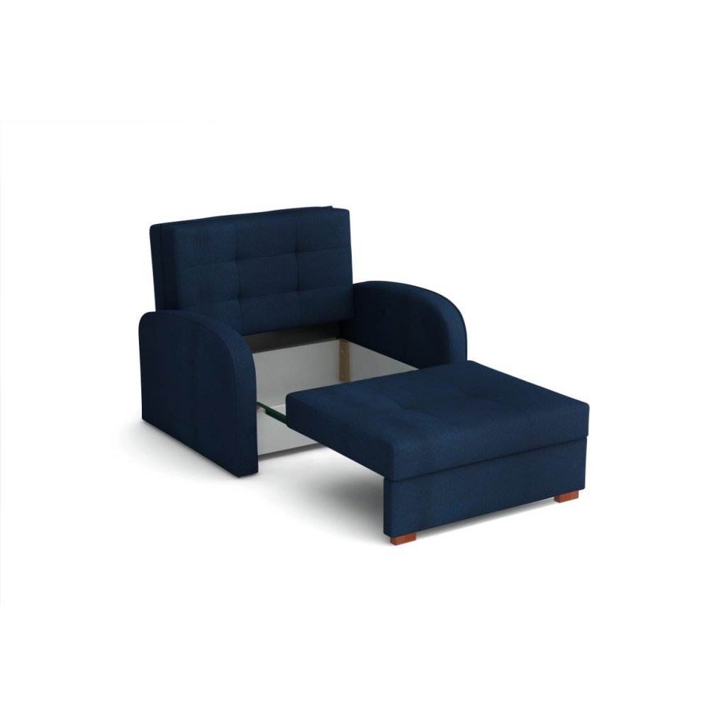 Moderní rozkládací křeslo je vhodné umístit do dětského, studentského či hostinského pokoje. Jednoduchým rozkladem pomocí automatu získáte lůžko vhodné k příležitostnému přespání. Křeslo je velmi měkké a pohodlné, což zaručuje kombinace vlnitých pružin s PUR pěnou. Praktický úložný prostor můžete využít např. na deku či polštář. Křeslo je potaženo kvalitní látkou v modré barvě. V ceně je 1 dekorační polštář. K tomuto křeslu doporučujeme koupit pohovku ve stejném provedení, kterou najdete také v naší nabídce. Pokud by se vám nehodilo toto barevné provedení, z naší široké nabídky si uričtě vyberete jinou barvu. Dodáváme i v jiné velikosti.