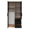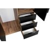 Šatní skříň dvoudveřová se třemi zásuvkami v moderním provedení. Korpus i dvířka jsou z kvalitní LTD desky s MDF dekoračními lištami v kombinaci barev dub wotan/černá doplněné zrcadlem. Uspořádání polic viz. obrázek. Dodáváme v demontovaném stavu.