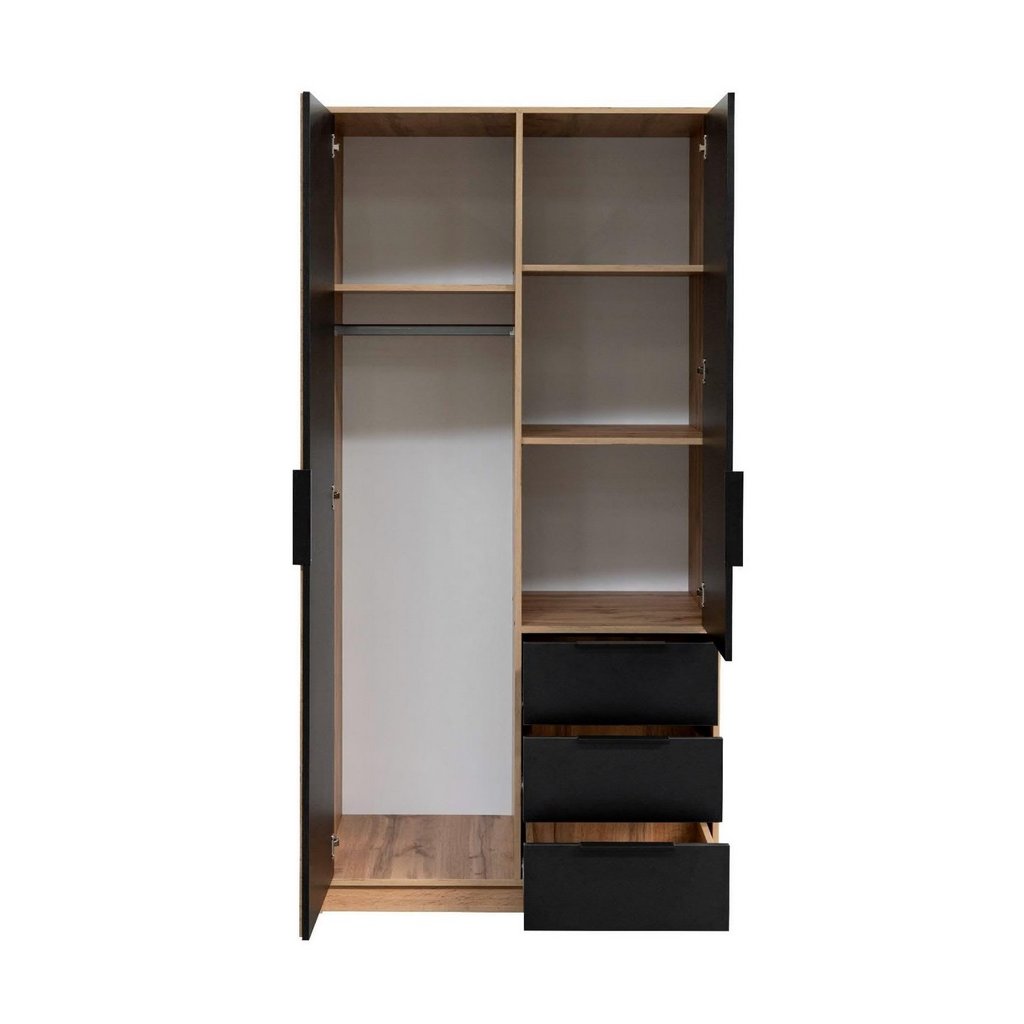 Šatní skříň dvoudveřová se třemi zásuvkami v moderním provedení. Korpus i dvířka jsou z kvalitní LTD desky s MDF dekoračními lištami v kombinaci barev dub wotan/černá doplněné zrcadlem. Uspořádání polic viz. obrázek. Dodáváme v demontovaném stavu.