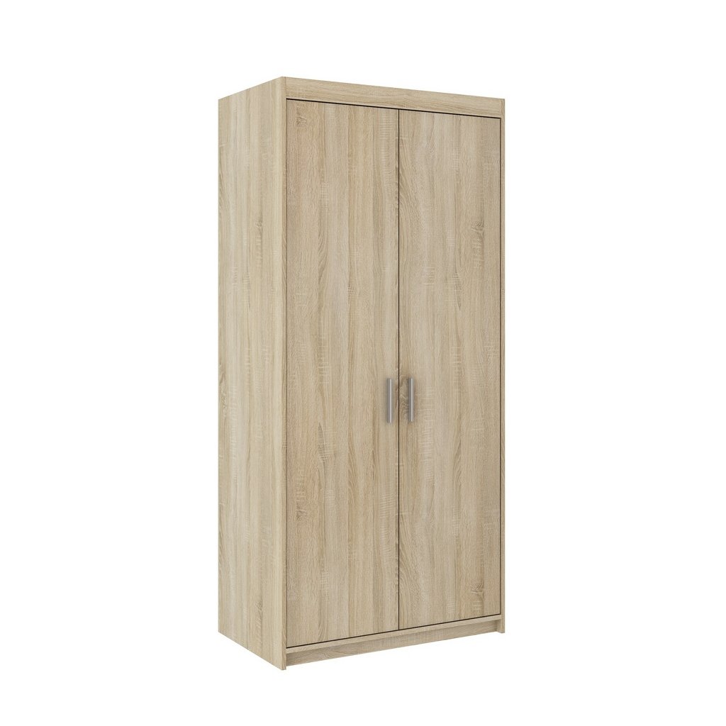 Šatní skříň má velmi jednoduché a zároveň moderní provedení. Skříň je vyrobená z kvalitního lamina v dekoru dub sonoma. Má dvě dveře, které obsahují plastové úchytky. Uvnitř skříně se nachází šatní tyč a několik polic. Na přesné vyobrazení vnitřku skříně se můžete podívat na perokresbě. Pokud se vám nelíbí toto barevné provedení, tak v naší nabídce naleznete skříň v jiné barvě či větším rozměru. Ke skříni lze dokoupit nádstavec, který poskytne další úložný prostor. Přesná šířka skříně je: 89,7 cm a výška: 190,5 cm.