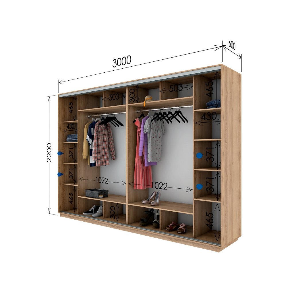 Velká šatní skříň s posuvnými dveřmi nabízí díky své velikosti více úložného prostoru, hodí se do každé ložnice či šatny. Posuvné dveře skvěle šetří místo v prostoru a díky zrcadlům na dveřích bude Vaše ložnice opticky zvětšena a projasněna. Korpus je z kvalitní LTD desky v barvě wenge, posuvné dveře jsou osazeny zrcadly a sklem v barvě šedá a bílá. Nezvyklá výška 220 cm nabídne opravdu dostatek prostoru. Vnitřní rozložení nabízí police a šatní tyč viz. obrázek. Dodáváme v demontovaném stavu. Možnost dokoupení praktických zásuvek do vnitřního prostoru skříně (modrá barva na perokresbě naznačuje, kam lze zásuvky umístit), naleznete v naší nabídce.