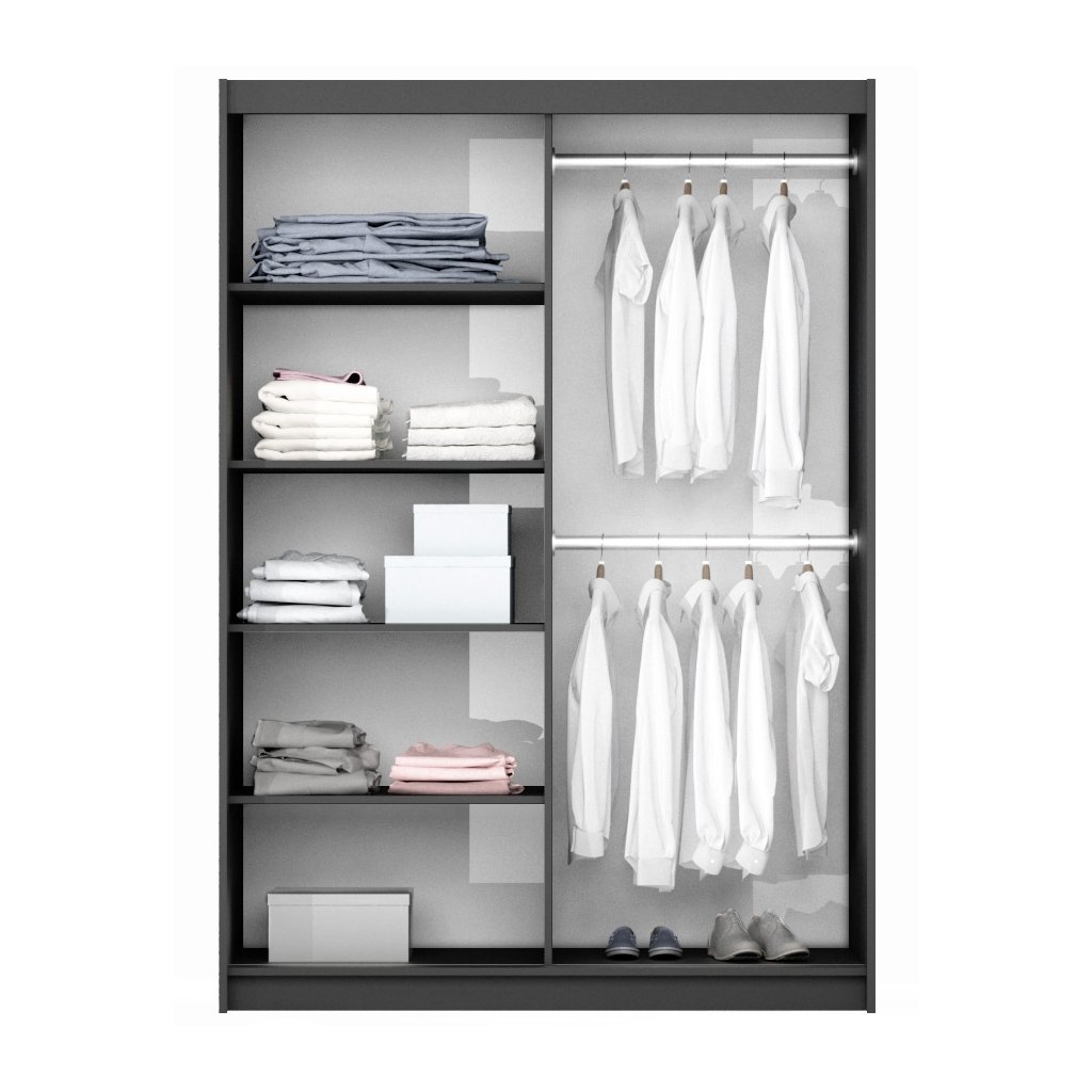 Šatní skříň je navržena v moderním provedení a potěší vás i po praktické stránce, jelikož nebude tolik zasahovat do prostoru, protože má dvoje posuvné dveře. Jedny dveře jsou v bílé barvě a druhé jsou osazené zrcadlem. Díky zrcadlu vám skříň opticky místnost zvětší, ať už půjde o ložnici, šatnu nebo předsíň. Uvnitř skříně naleznete šatní tyče a dostatečný počet polic pro uschování každého druhu oblečení. Na přesné vyobrazení vnitřku skříně se můžete podívat na perokresbě. Korpus je vyroben z kvalitní LTD v bílé barvě. V naší nabídce naleznete skříň i v jiném barevném provedení, nebo v jiných rozměrech.