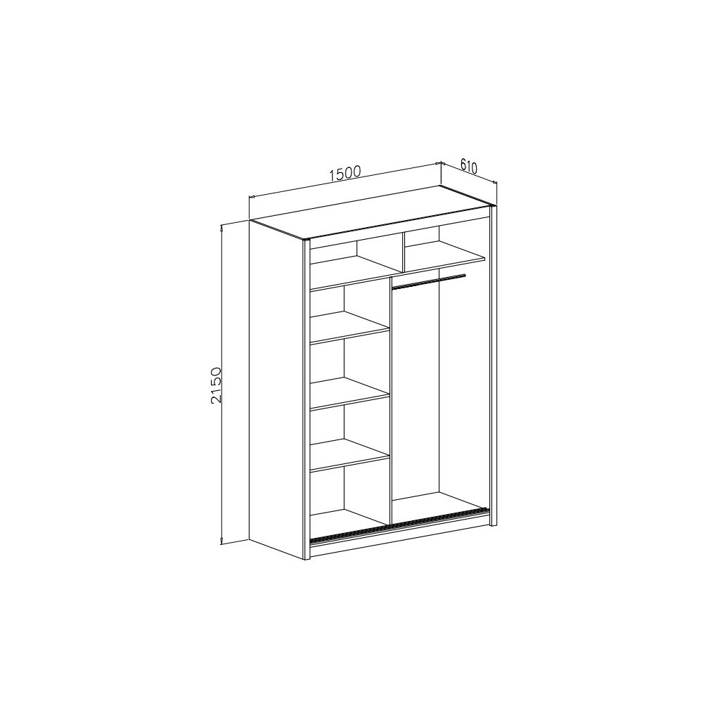 Šatní skříň je široká 150 cm a má dvoje posuvné dveře. Skříň je v jednoduchém ale zároveň velmi moderním provedení. Korpus a dvířka skříně jsou z kvalitního lamina v černé matné barvě. Skříň má jedny dveře celé osazené zrcadlem. Uspořádání polic můžete vidět na perokresbě. Uvnitř se nechází šatní tyč a několik polic. Hrany skříně jsou ohraničené ABS páskou. Pokud se Vám nelíbí toto barevné provedení, tak v naší nabídce naleznete tuto skříň i v jiných barevných variantách a také v jiných rozměrech. Tato skříň patří do sektorové řady, ze které si lze seskládat krásnou a elegantní ložnici.