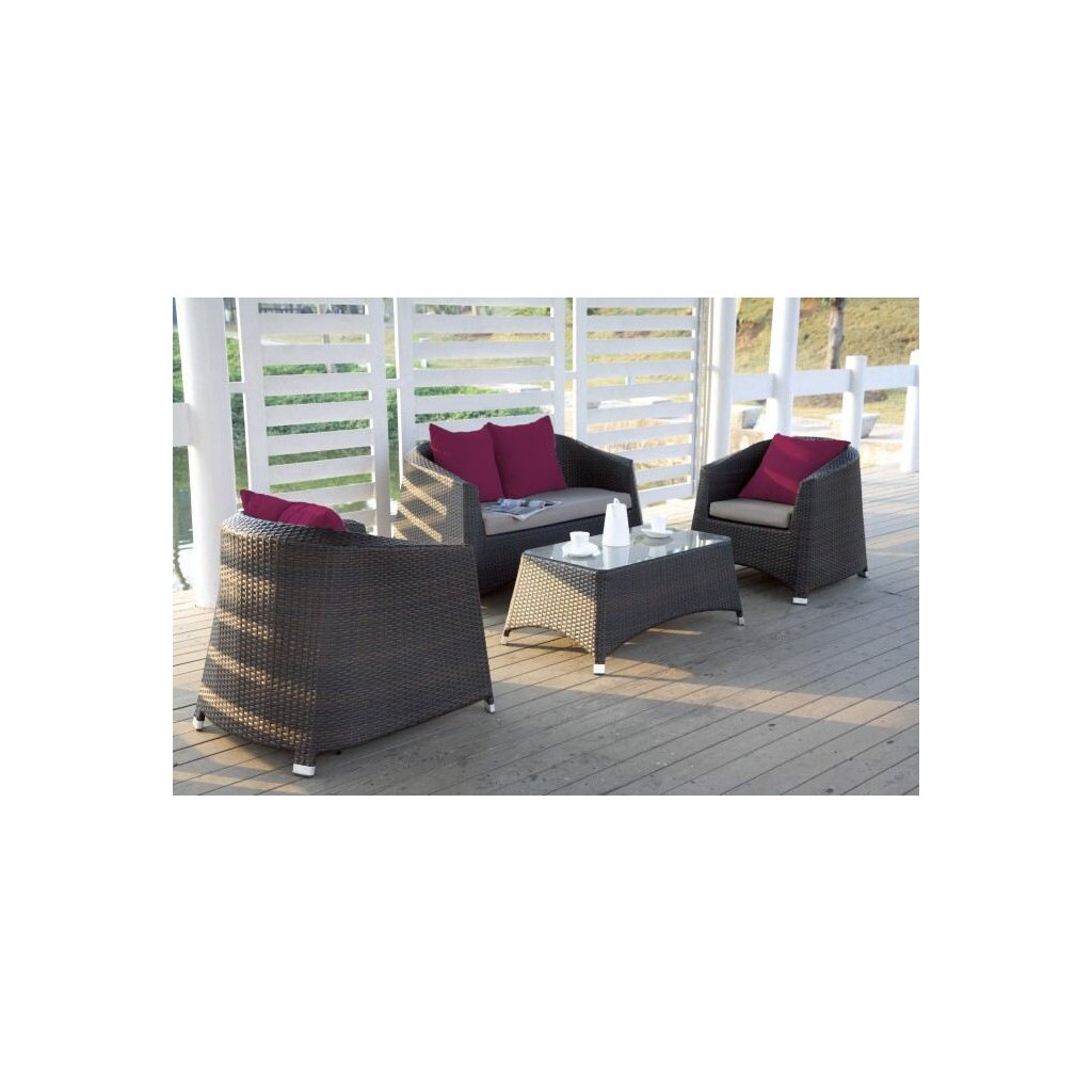 Moderní, pohodlná a prostorná sedací souprava EDINBURGH XL hnědé barvy v sestavě dvě křesla, stolek a pohovka pro dvě osoby. Konstrukce je vyrobena z hliníku, který je opleten šedým PE ratanem. Povrch stolu je z tvrzeného skla. Křesla jsou stohovatelná.