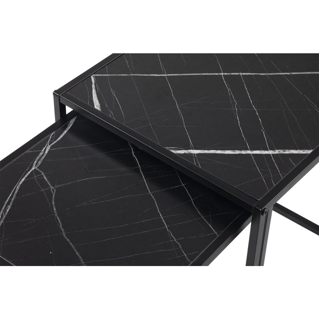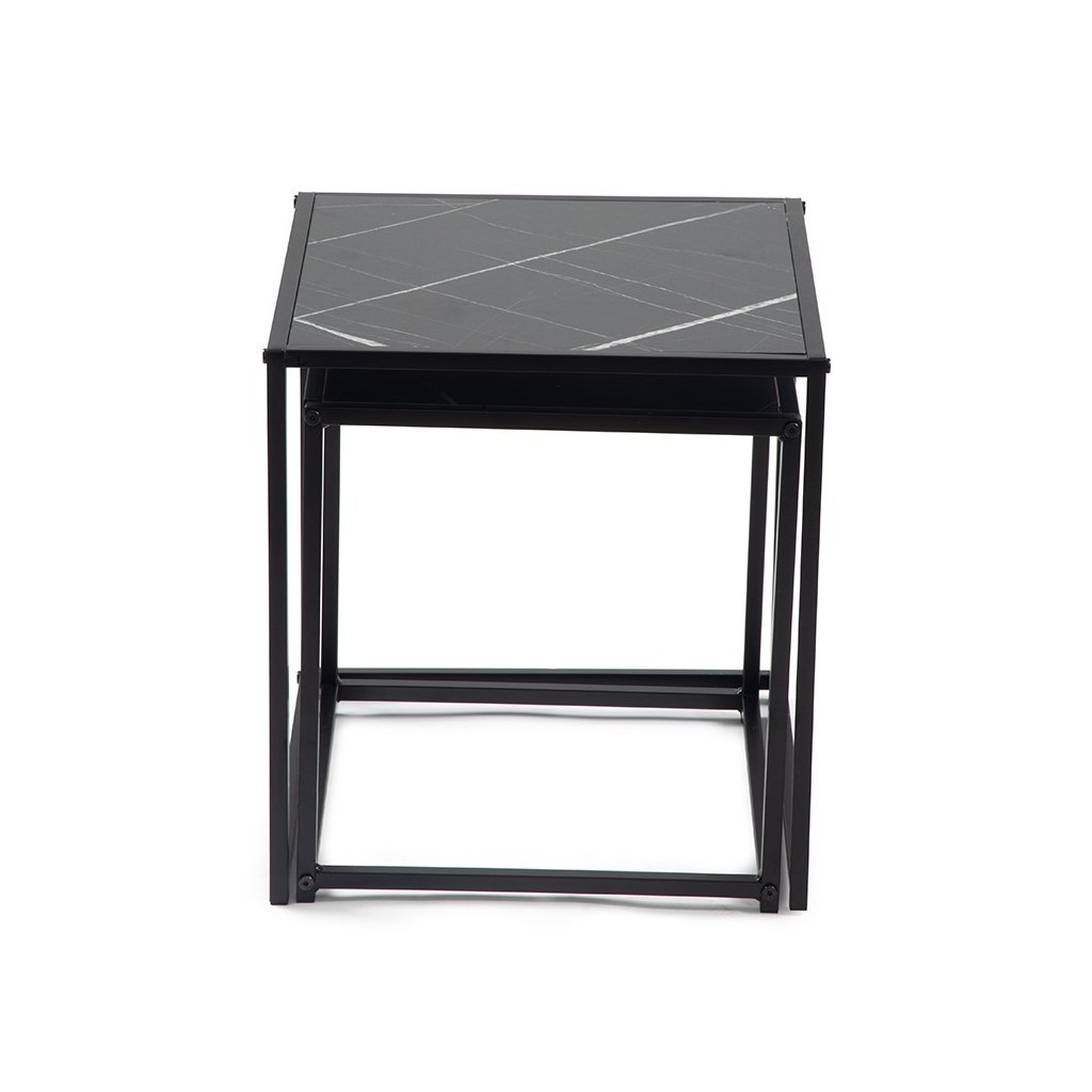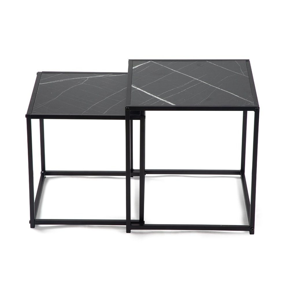 Sada dvou moderních konferenčních stolků s elegantním designem. Stolové desky v černém mramorovém dekoru působí luxusně a stylově. Stabilní kovová konstrukce v černém provedení. Možnost využití samostatně nebo zasunutí jednoho pod druhý pro úsporu místa. Spojuje praktičnost, variabilitu a sofistikovaný vzhled.