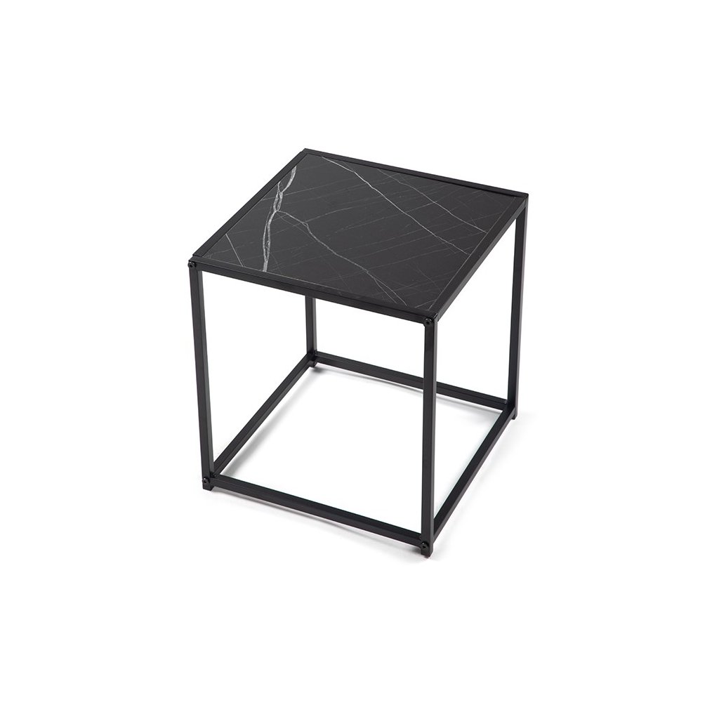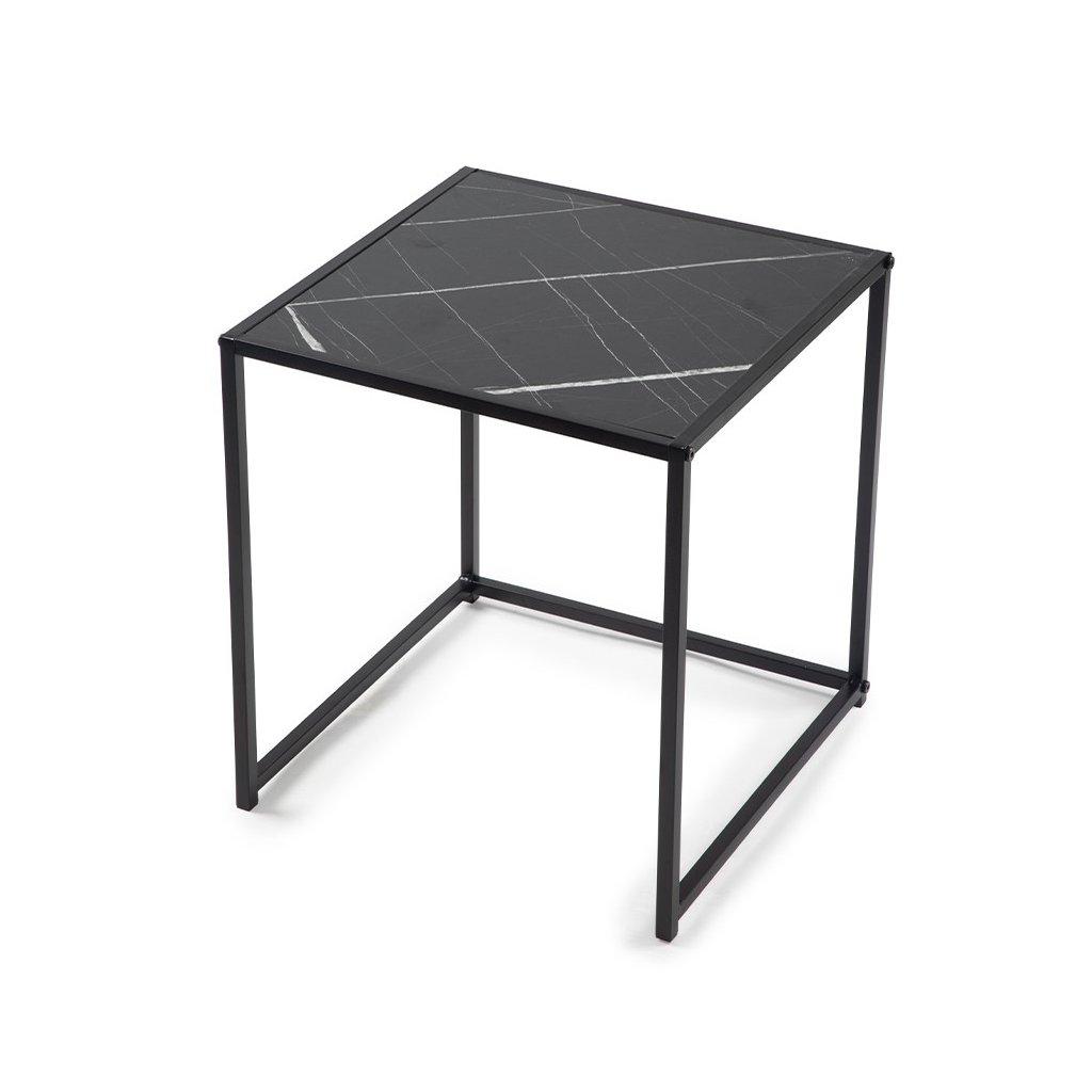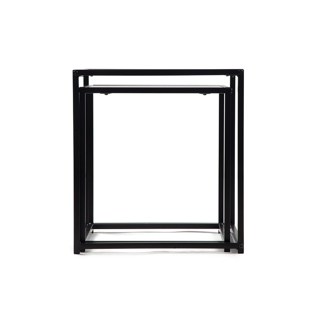 Sada dvou moderních konferenčních stolků s elegantním designem. Stolové desky v černém mramorovém dekoru působí luxusně a stylově. Stabilní kovová konstrukce v černém provedení. Možnost využití samostatně nebo zasunutí jednoho pod druhý pro úsporu místa. Spojuje praktičnost, variabilitu a sofistikovaný vzhled.