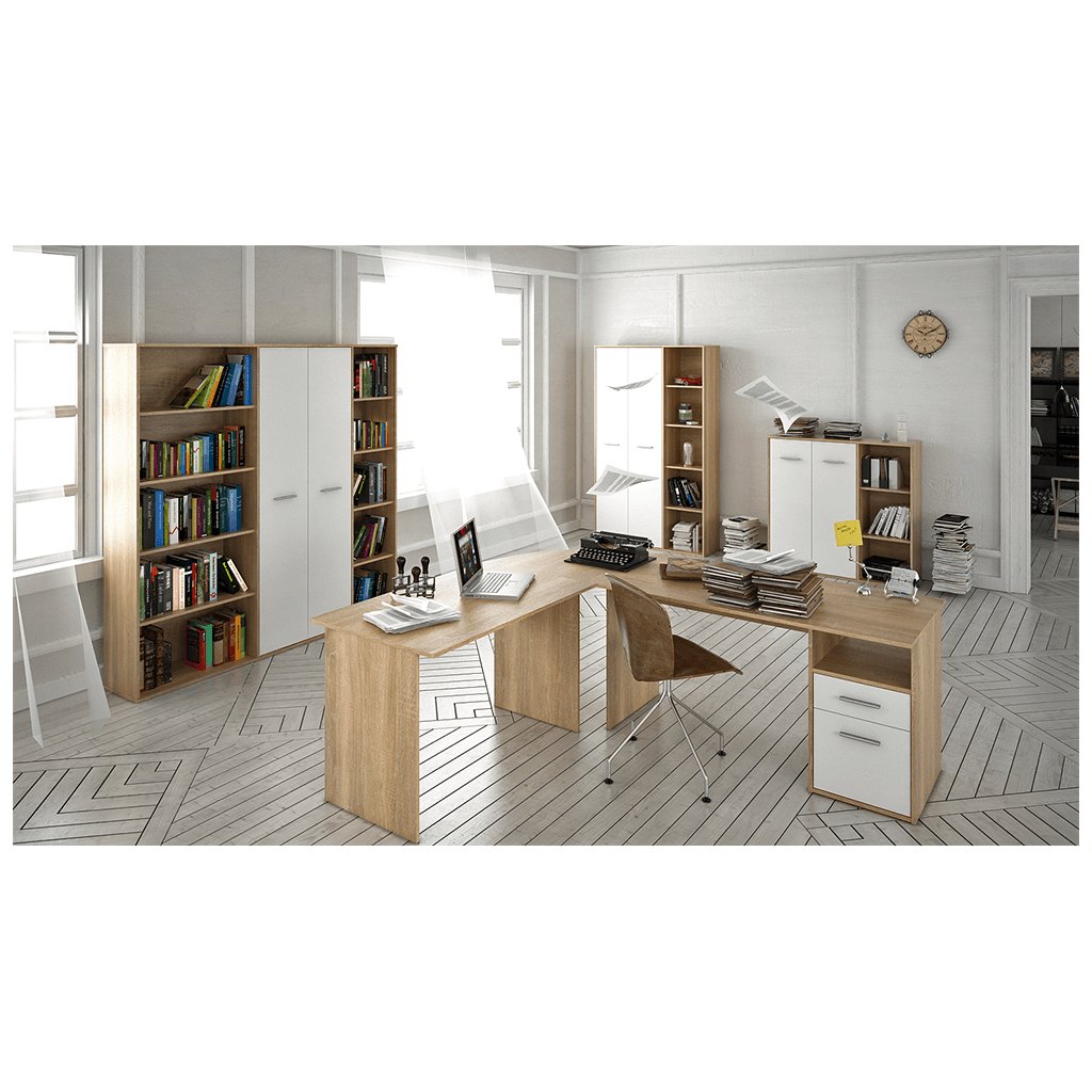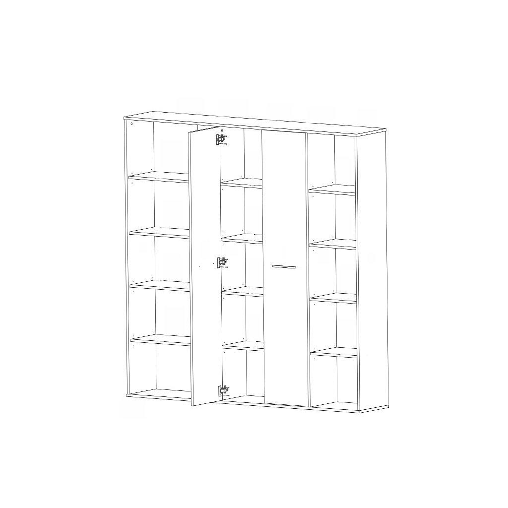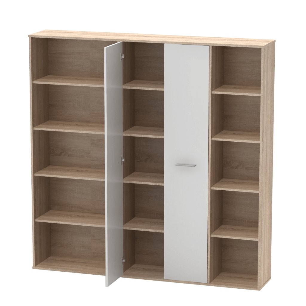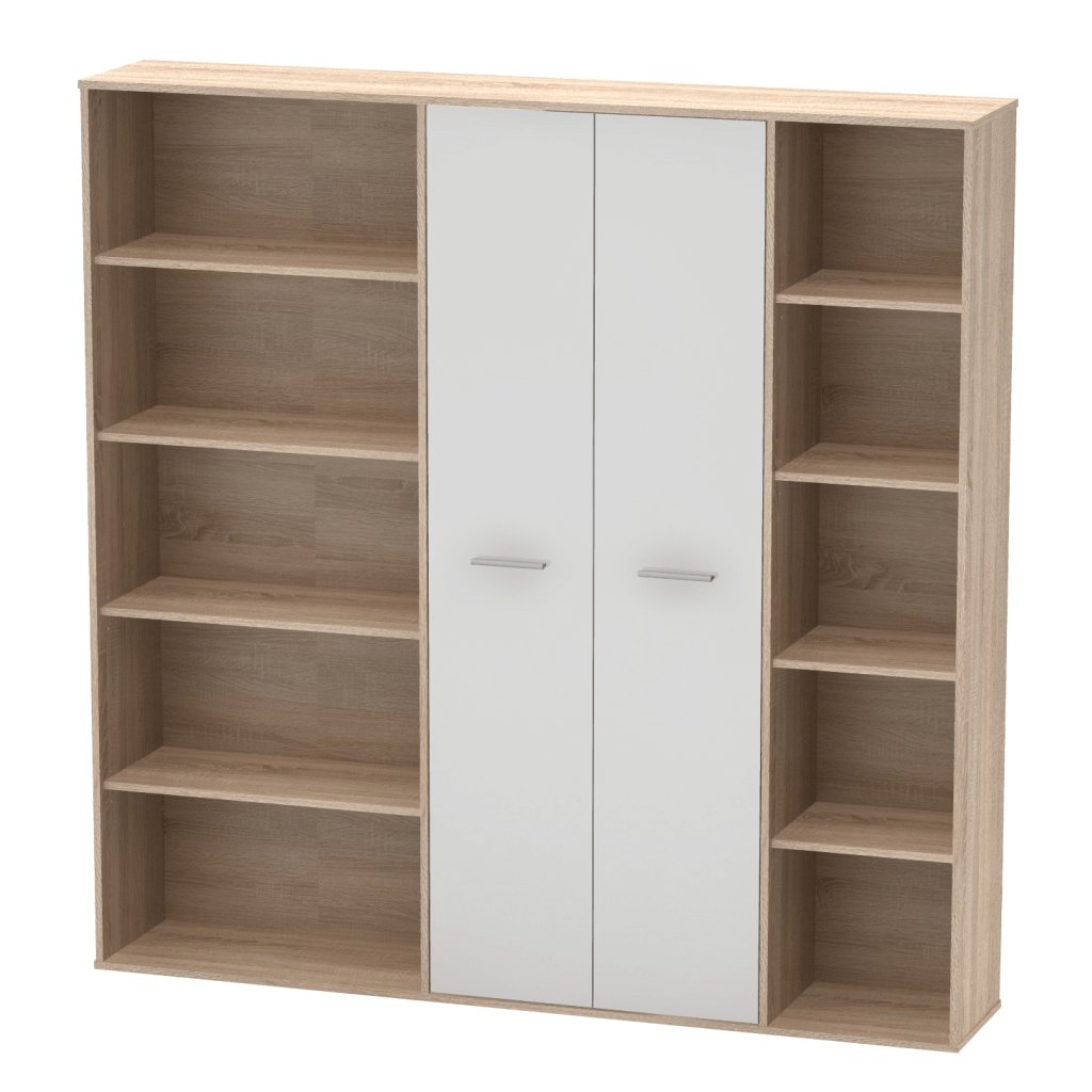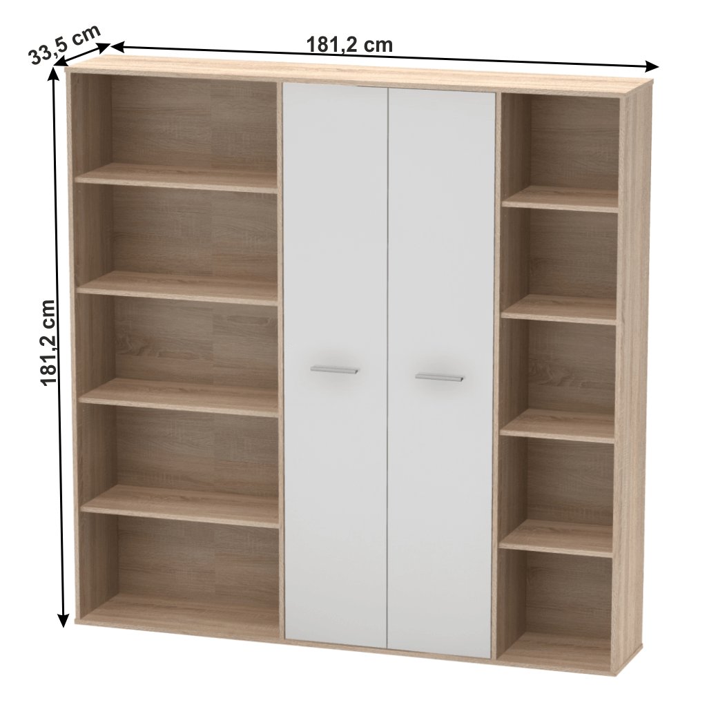 Moderním a nadčasovým kouskem je tato skříň. Která má dvoje dveře a z bočních stran regály. Má veliké množství odkládacího prostoru. Skříň je v dekoru dub sonoma světlý v kombinaci bílé. Je vyrobena z laminovaného DTD materiálu, který má tloušťku 16mm. Bude vynikat ve vaší pracovně.