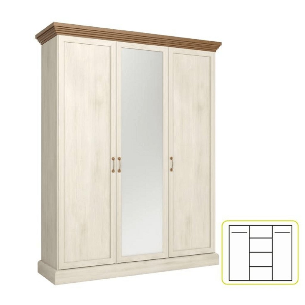 Šatní skříň klasická třídveřová věšáková s policemi se zrcadlem nordická bílá borovice ROYAL S3D