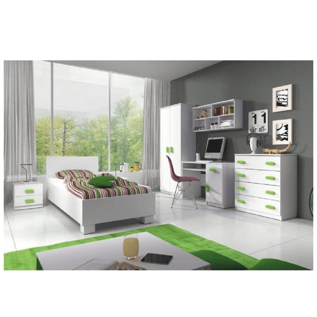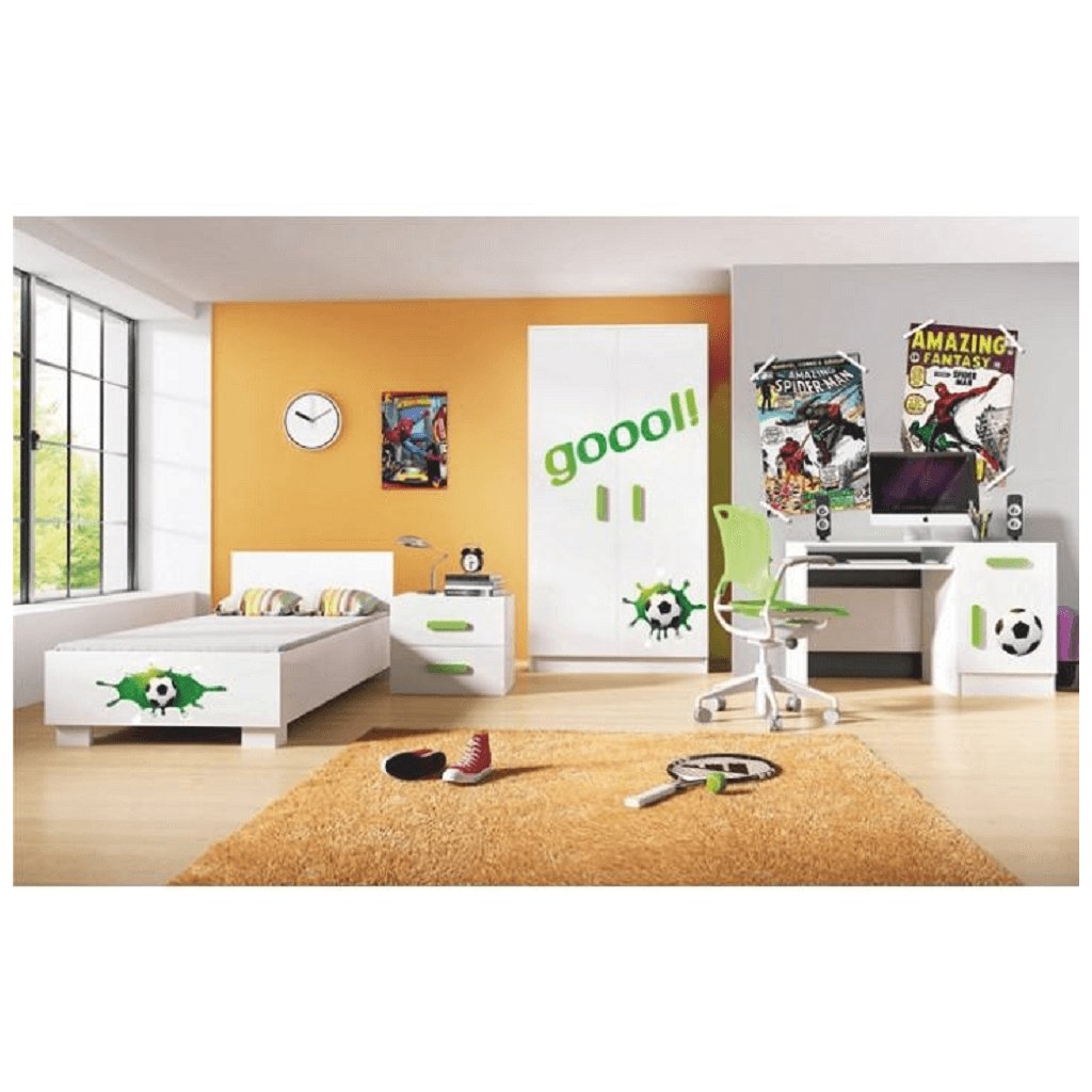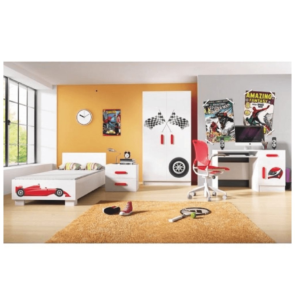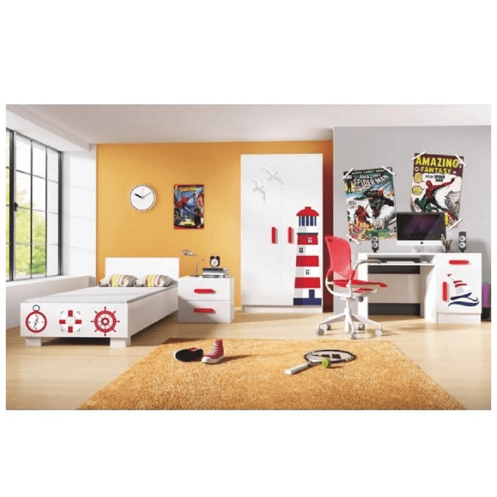 Moderní sektorový nábytek vhodný na zařízení dětských nebo studentských pokojů. Díky kterému si můžete vyskládat sestavu podle svých představ. Je vyrobena z laminovaného DTD materiálu, který je doplněn ABS hranami. Skříň je v bílém provedení, které doplňují barevné úchytky v barvách červené, zelené či oranžové (úchytky je třeba si přiobjednat zvlášť). Tyto barvy si vyberete podle vašeho výběru. Ke skříni je možnost dokoupení originální dekorativní sady nálepek s motivy: formule, fotbal, námořník a sovy. Komponenty ze sektorového systému se objednávají jednotlivě.