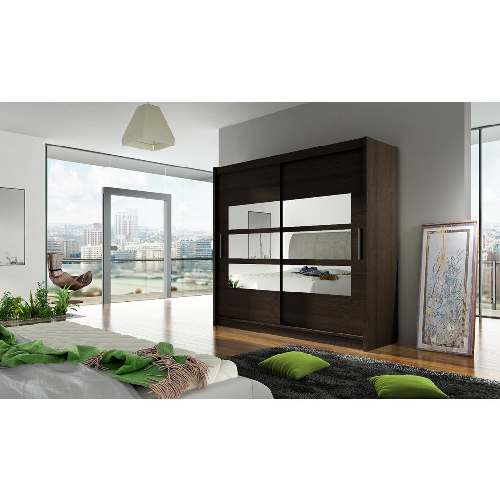 Skříň s posuvnými dveřmi v tmavě hnědé barvě s malými zrcadly se hodí do každého interiéru. Je vyrobena z kvalitního lamina, které je odolné vůči poškrábání a vlhkosti, hrany jsou ukončeny ABS lištou. Vodící lišty jsou vyrobeny z odolného hliníku, tudíž splňují požadavky pro každodenní užívání. Zrcadla, která jsou připevněna na skříni jí dodáváji elegantní vzhled a zároveň prosvětlí a opticky zvětší místnost. Skříň poskytuje dostatek úložného prostoru a díky posuvným dveřím ušetří místo. Skříň je dodávána v demontu. Pokud by se Vám toto provedení nehodilo, dodáváme i v jiných barvách, nebo v provedení bez zrcadla.