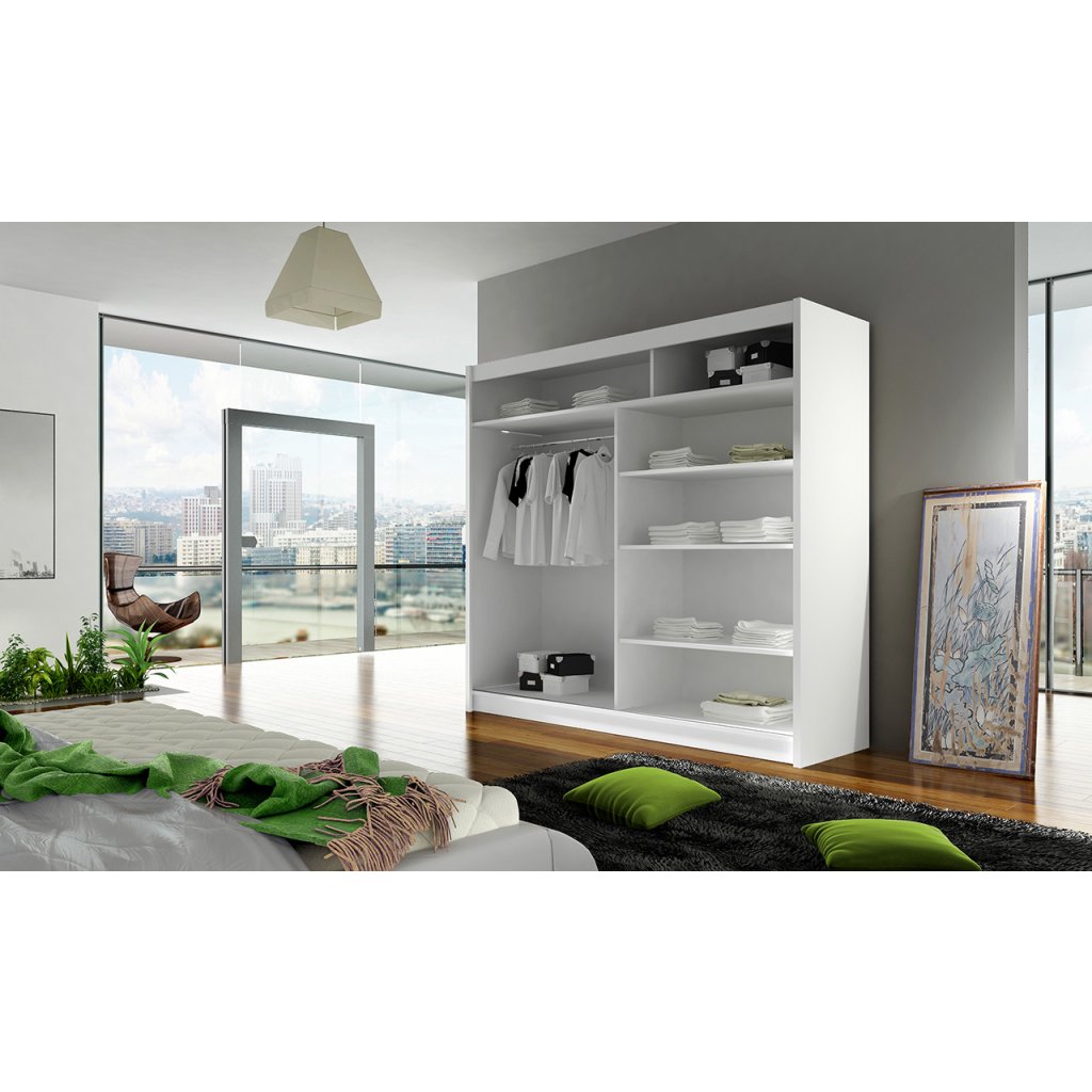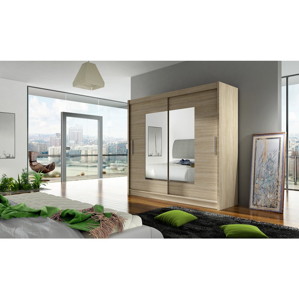 Skříň s posuvnými dveřmi v dekoru dub sonoma se zrcadly se hodí do každého interiéru. Je vyrobena z kvalitního lamina, které je odolné vůči poškrábání a vlhkosti, hrany jsou ukončeny ABS lištou. Vodící lišty jsou vyrobeny z odolného hliníku, tudíž splňují požadavky pro každodenní užívání. Zrcadla na středu dveří místnost prosvětlí a opticky zvětší. Skříň poskytuje dostatek úložného prostoru a díky posuvným dveřím ušetří místo. Skříň je dodávána v demontu. Pokud by se Vám toto provedení nehodilo, dodáváme i v jiných barvách, nebo v provedení bez zrcadla.