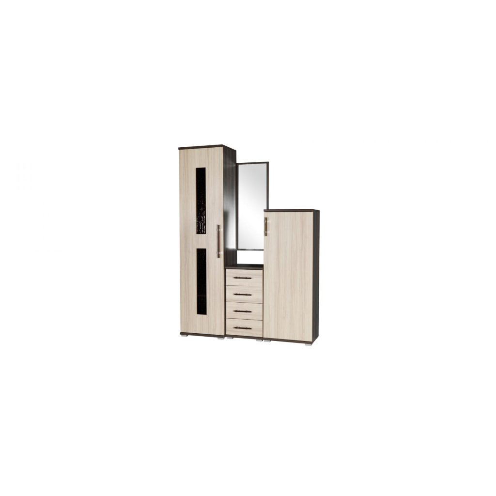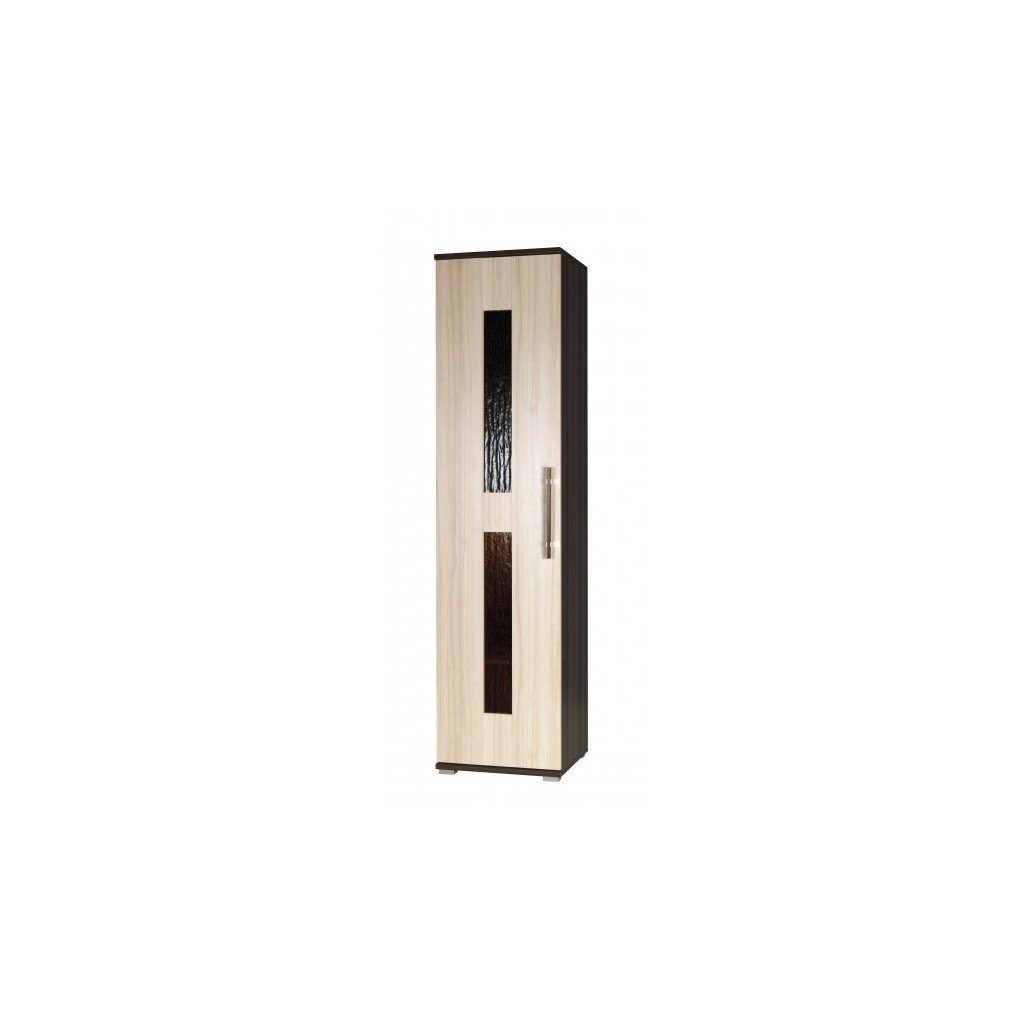 Úzká šatní skříň poskytne dostatek úložného prostoru na oblečení. Za dveřmi se nachází výsuvná tyč na ramínka. Dveře jsou v dekoru jasan světlý doplněné o dekorativní svislé proužky v dekoru jasan tmavý a korpus skříně je v dekoru jasan tmavý. Je vyrobena z kvalitního lamina. Skříň patří do sektorové řady, ze které si lze sestavit ložnici nebo obývací pokoj.