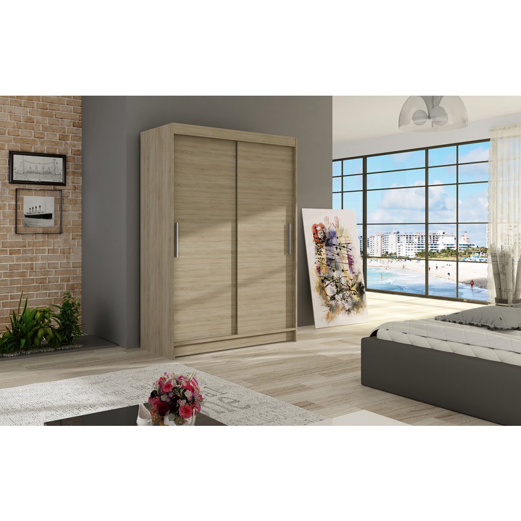 Elegantní a zároveň jednoduchý design šatní skříně osloví i náročnější zákazníky. Skříň je vhodná do ložnice, dětského či studentského pokoje, nebo do předsíně. Na fotografii můžete vidět skříň v dekoru dub sonoma. Je vyrobena z lamina (16 mm), které je odolné vůči poškrábání a vlhkosti, hrany jsou ukončeny ABS lištou. Vodící lišty jsou vyrobeny z odolného hliníku, tudíž splňují požadavky pro každodenní užívání. Skříň poskytuje dostatek úložného prostoru. Skříň obsahuje poličky i tyč na zavěšení ramínek s oblečením. Skříň dodáváme i v jiném barevném provedení, nebo v provedení se zrcadlem.