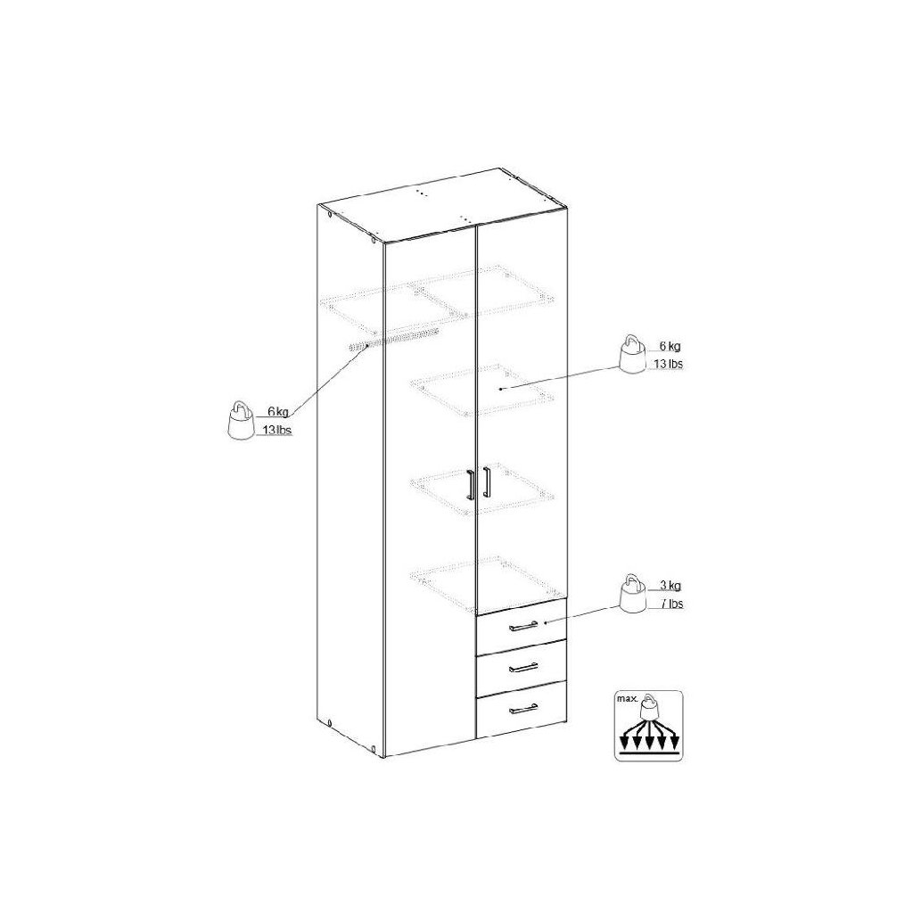 Moderní a praktická šatní skříň od dánského výrobce. Šatní skříň má část policovou se třemi policemi, 3 zásuvky a část šatní s jednou policí a šatní tyčí (viz nákres s doporučeným zatížením). Skříň je vyrobena z lamina o tloušťce 12 mm a má plastové úchytky. Šířka skříně je 77,6 cm, hloubka je 49,5 cm a výška 200,4 cm. Celková váha skříně je 53,8 kg. Dodáváno v demontu se schematickým návodem na montáž.