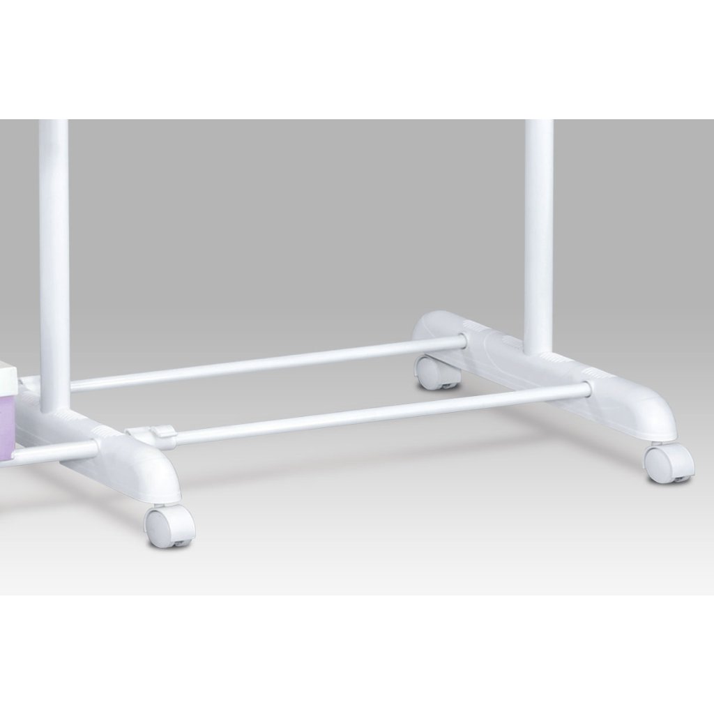Teleskopický stojan (štendr) na šaty na kolečkách. Provedení bílý plast a kovové části s chromovou úpravou.