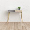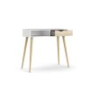 Toaletní stolek je navržený v skandinávském stylu a má velmi jednoduché provedení, které působí elegantním dojmem. Bude se hodit do každého interiéru díky svému jednoduchému a neutrálnímu barevnému zpracování. Stolek je v bílé barvě a jednu zásuvku má v dekoru dub. Místo úchytů má zásuvka obloukový výřez. Stojí na vysokých šikmých dřevěných nožkách taktéž v dekoru dub. Nábytek je vyrobený z kvalitního lamina (18 mm). Toaletní stolek patří do sektorové řady, ze které si lze složit stylový obývací pokoj, ložnici, předsíň či jídelnu. Přesná hloubka je: 43,5 cm.