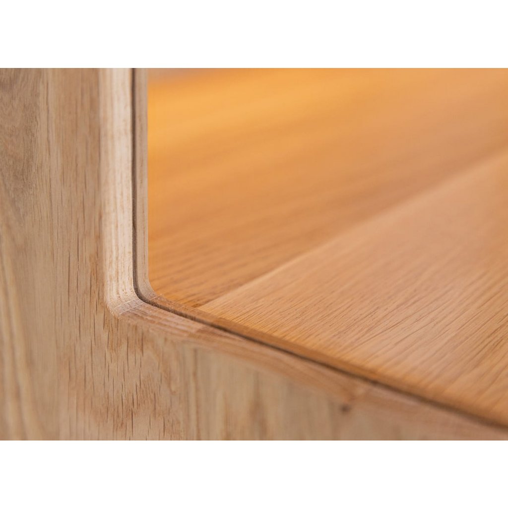 Pozoruhodný je materiál, ze kterého byl nábytek vyroben. Je to přírodní dub, který je odolný a tvrdý, a proto je taková i dřevěná vitrína z něj. Zůstává odolný vůči poškození, díky čemuž zůstává krásný a rozkošný po mnoho let. Jak je povrch zabezpečen? Proces olejování byl použit k odstranění zrn a uzlů a zdůraznil zlatou barvu nábytku.
