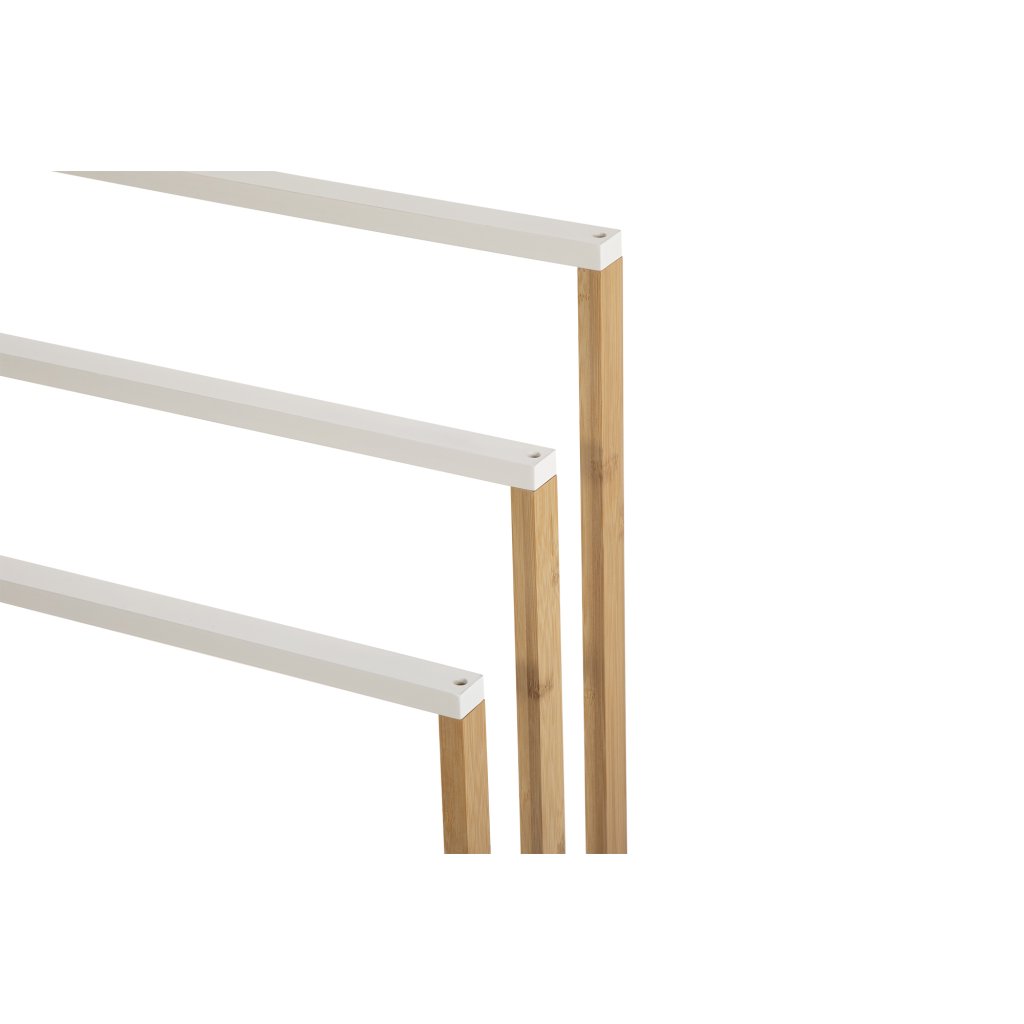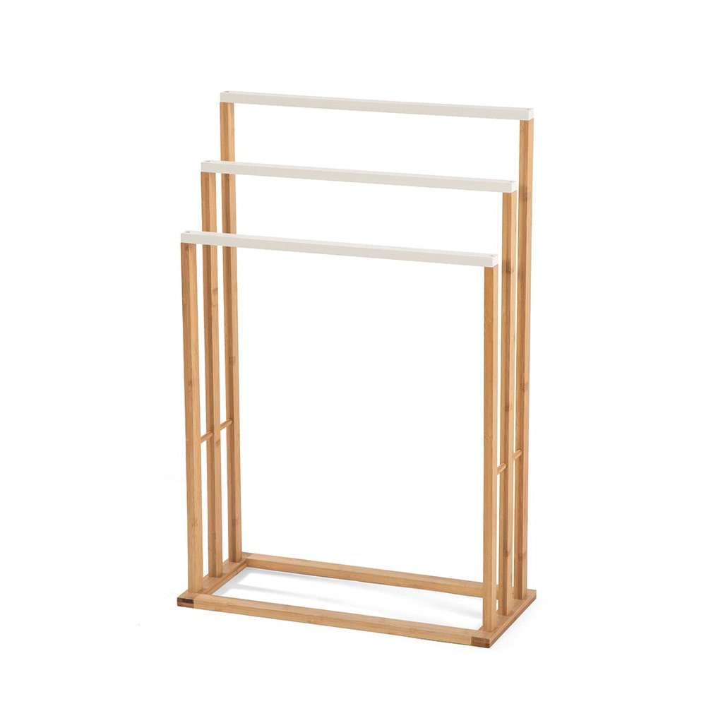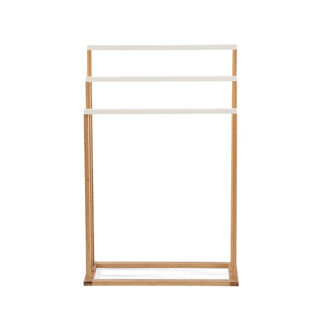 Moderní stojanový věšák na ručníky s praktickým designem. Tři samostatné tyče pro přehledné zavěšení více ručníků. Stabilní konstrukce zajišťuje pevnost a odolnost. Ideální doplněk do koupelny či wellness prostoru. Spojuje funkčnost, jednoduchost a elegantní vzhled.