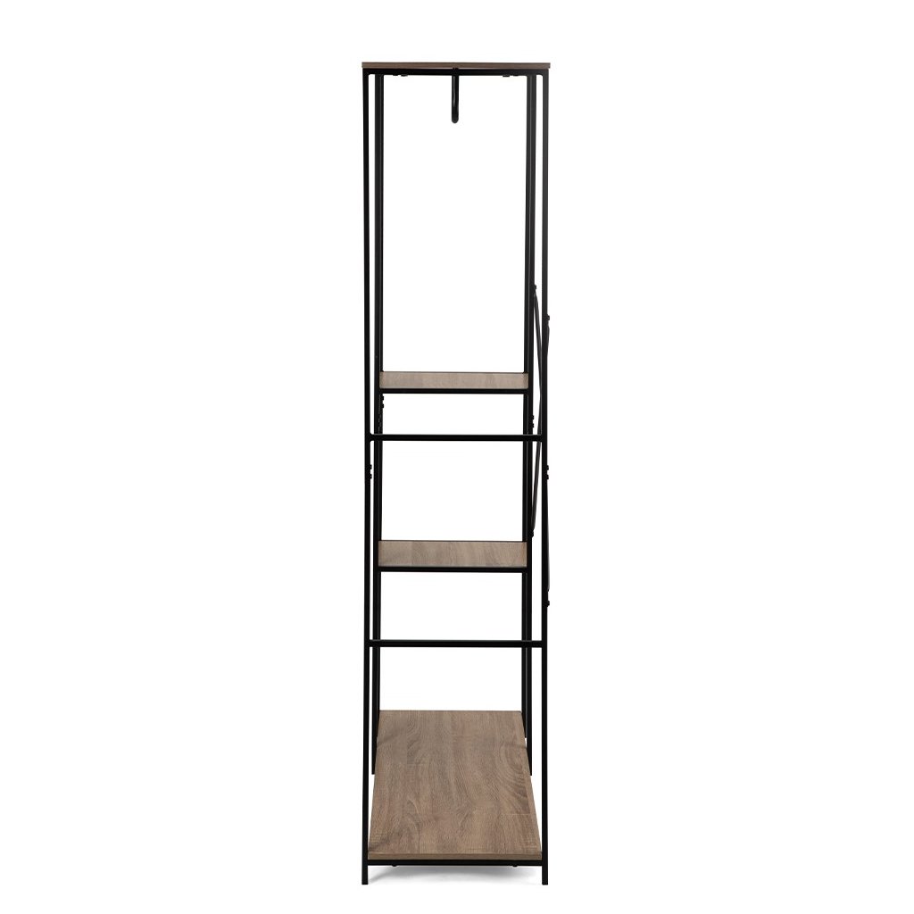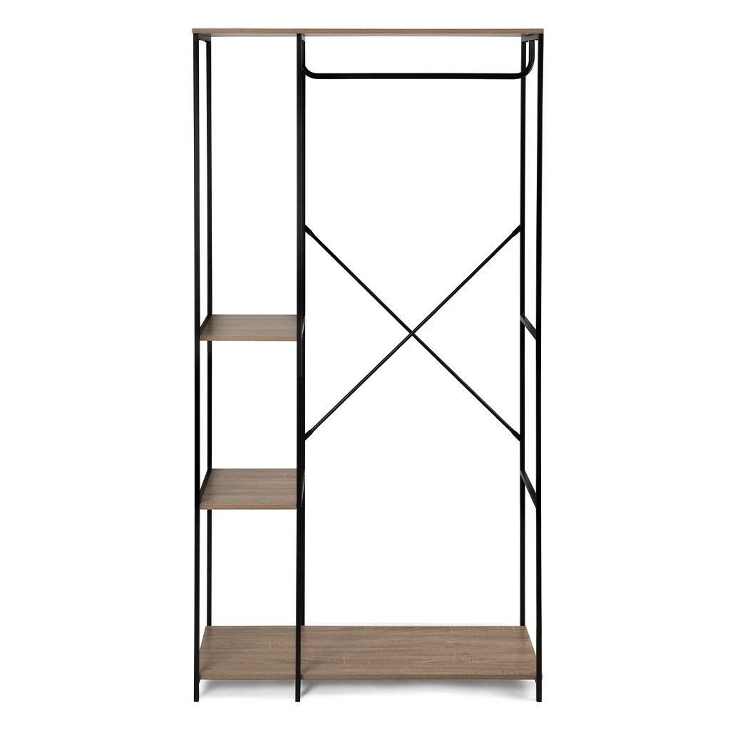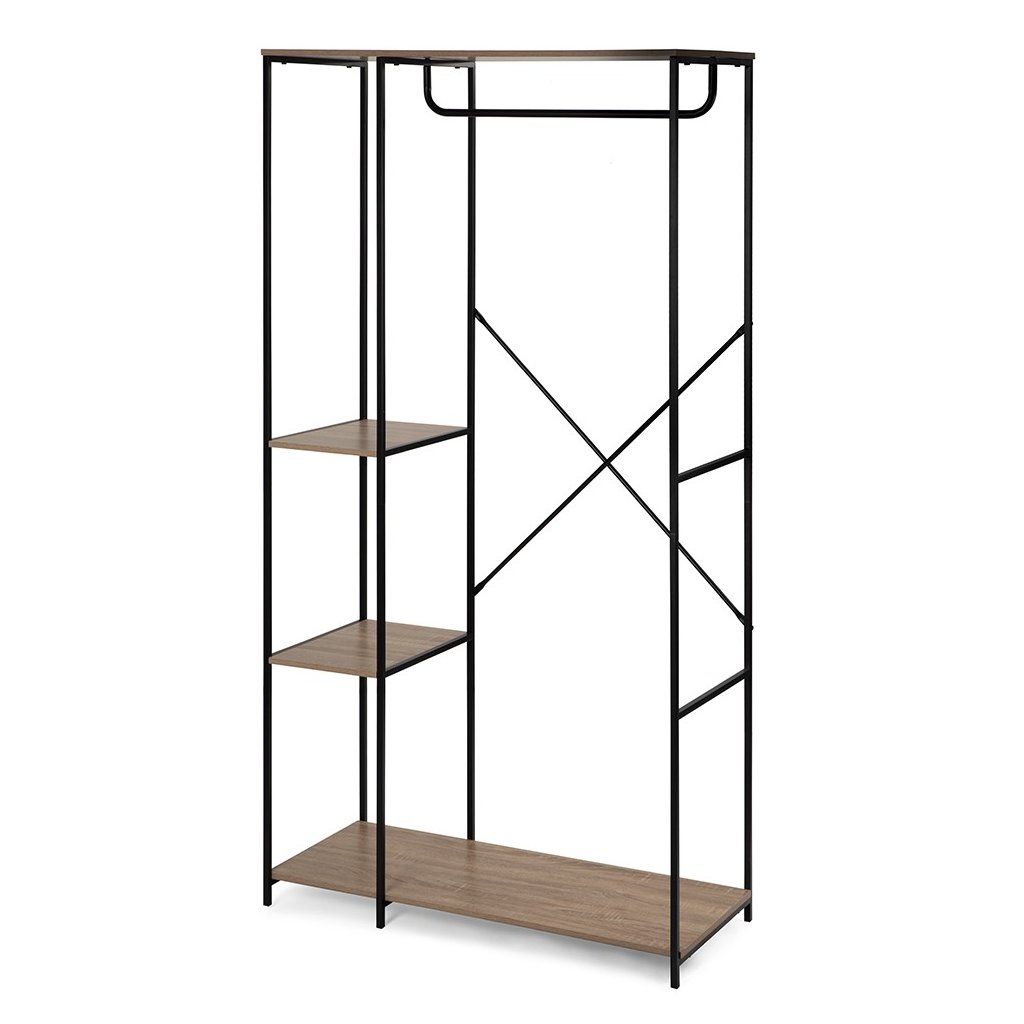 Multifunkční šatní stojan s moderním a minimalistickým designem. Otevřený úložný prostor s tyčí na zavěšení oblečení a třemi policemi na doplňky či boty. Stabilní kovová konstrukce doplněná odolnými deskami. Ideální řešení do předsíně, ložnice nebo š...