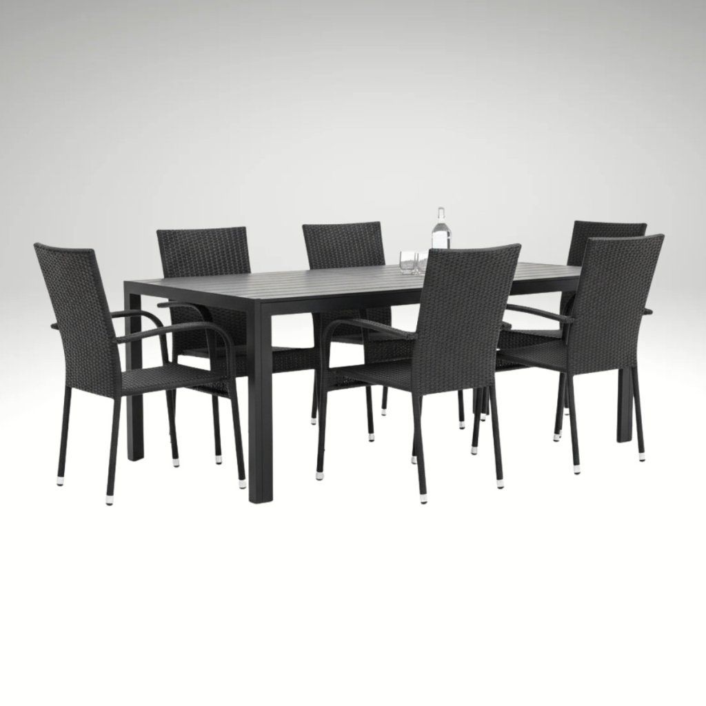 - Set pro 6 osob nabízí velký stůl 205 × 90 cm a židle, které lze snadno stohovat.
