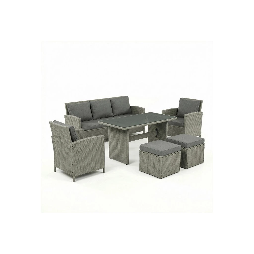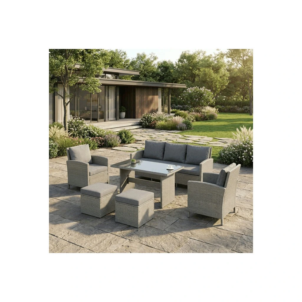 Zahradní sestava s jídelním stolem v šedém provedení kombinuje pevnou kovovou konstrukci s elegantním povrchem z umělého ratanu, který věrně imituje přírodní materiál. Deska stolu je vyrobena z tvrzeného skla, což usnadňuje údržbu a dodává sestavě moderní vzhled. Sedací část tvoří dvě křesla a dvě taburety, všechny vybavené polstrovanými sedáky a opěrkami potaženými příjemnou šedou látkou pro zvýšení komfortu. Konstrukce je navržena tak, aby zajistila stabilitu a dlouhou životnost i při venkovním použití. Celkový design sestavy je ideální pro relaxaci i stolování na zahradě či terase.