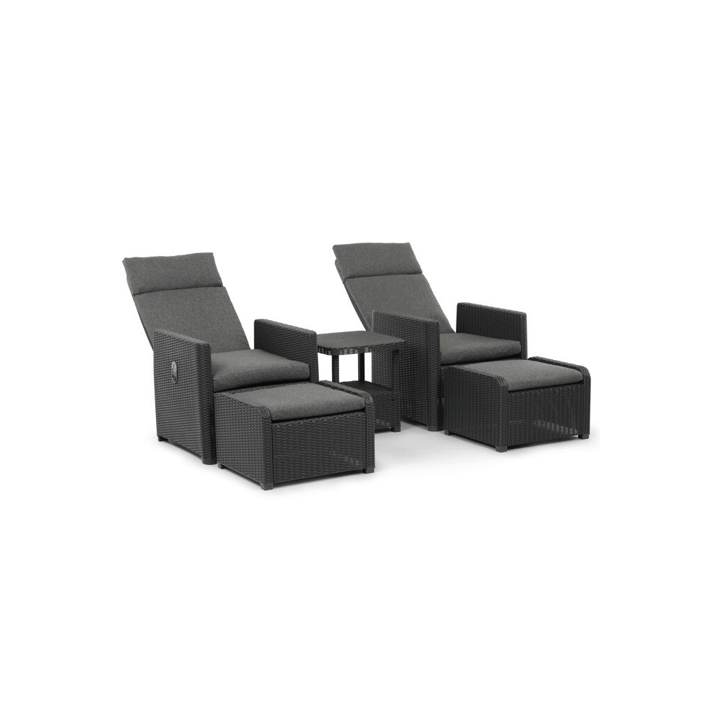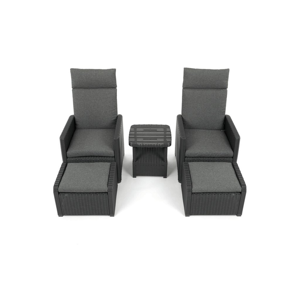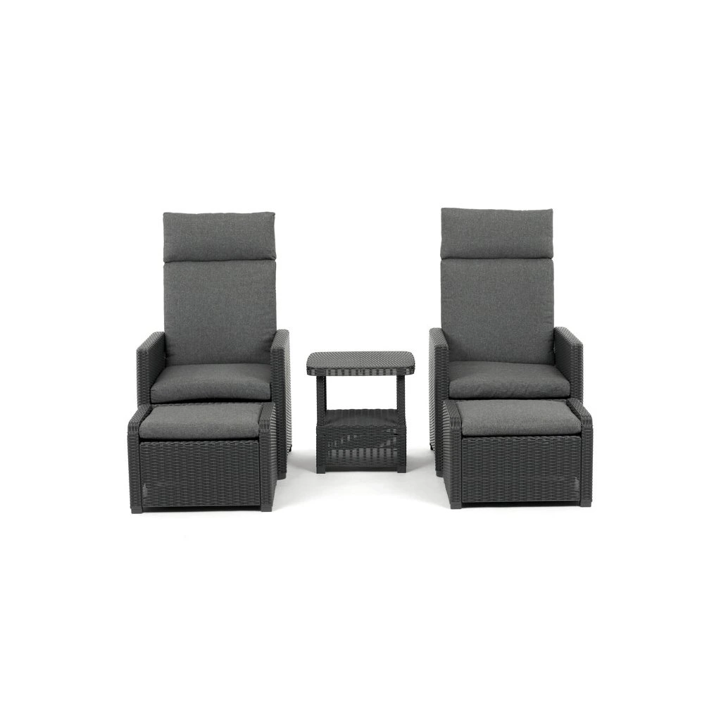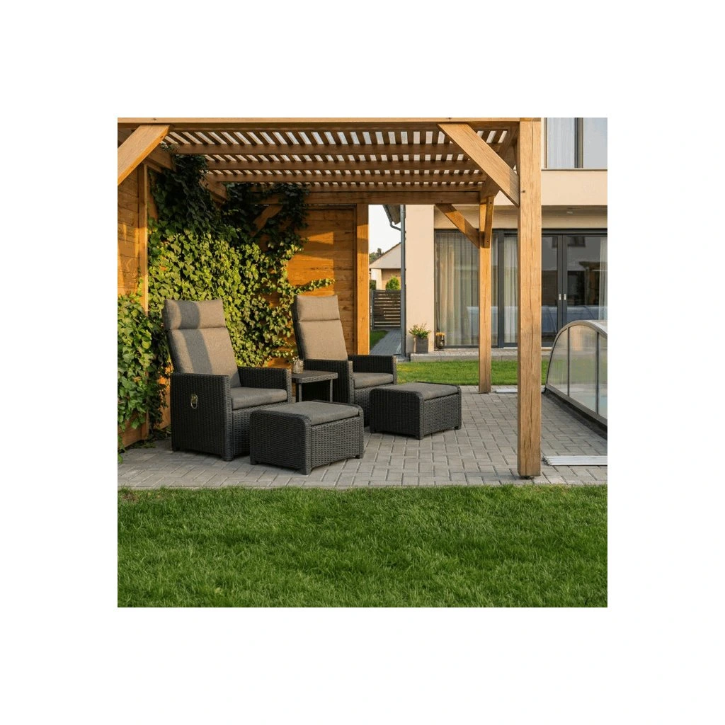 Zahradní set 1+2 v šedém provedení kombinuje pevný kovový rám s výplní z polyratanu které zajišťuje snadnou údržbu a dlouhou životnost i při venkovním použití. Sada obsahuje dvě polohovací křesla s nastavitelným sklonem opěradla pro maximální komfort a dva bonusové taburety, které lze využít jako podnožky nebo další sedací plochy. Součástí je také praktický stolek s deskou z umělého ratanu, který doplňuje celkový vzhled a funkčnost setu. Ideální volba pro relaxaci na zahradě, terase či balkóně.