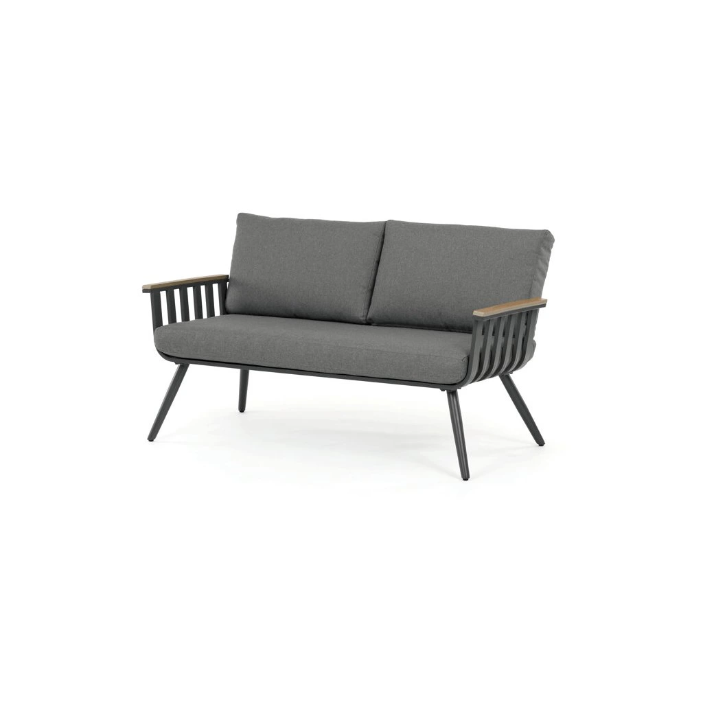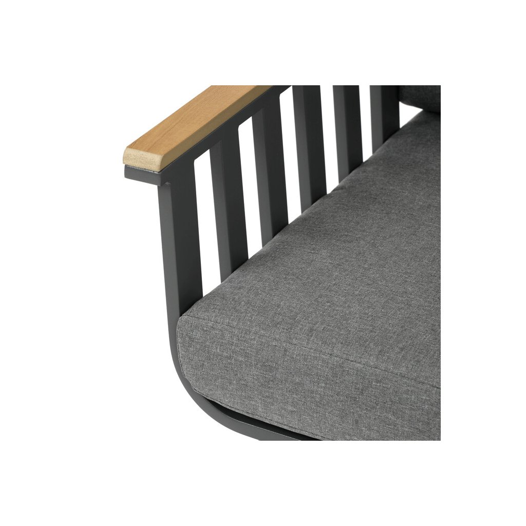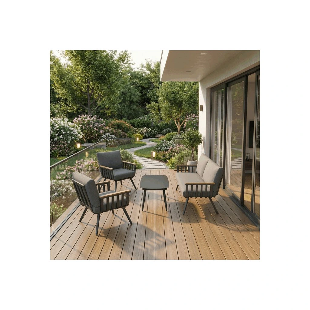 Zahradní set v šedém provedení kombinuje pevný hliníkový rám s odolnými polywoodovými prvky v dekoru divokého dubu, které zajišťují dlouhou životnost i při venkovním použití. Součástí sestavy jsou pohodlná křesla a dvoumístná lavice s polstrováním v neutrální šedé barvě, které podporují komfort během odpočinku. Deska stolu je vyrobena z bezpečnostního skla, které snadno udržuje čistotu a doplňuje moderní vzhled celé sestavy. Konstrukce nábytku je navržena pro stabilitu a odolnost vůči povětrnostním vlivům, což umožňuje využití na terase, zahradě či balkóně. Díky kombinaci materiálů a designu se set hodí do různých venkovních prostorů, kde poskytuje praktické i estetické řešení pro posezení.