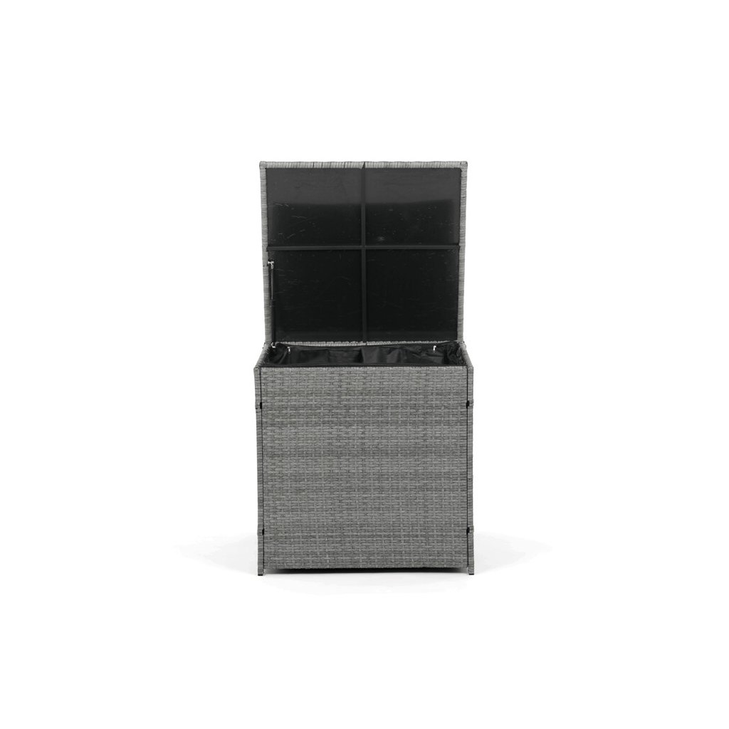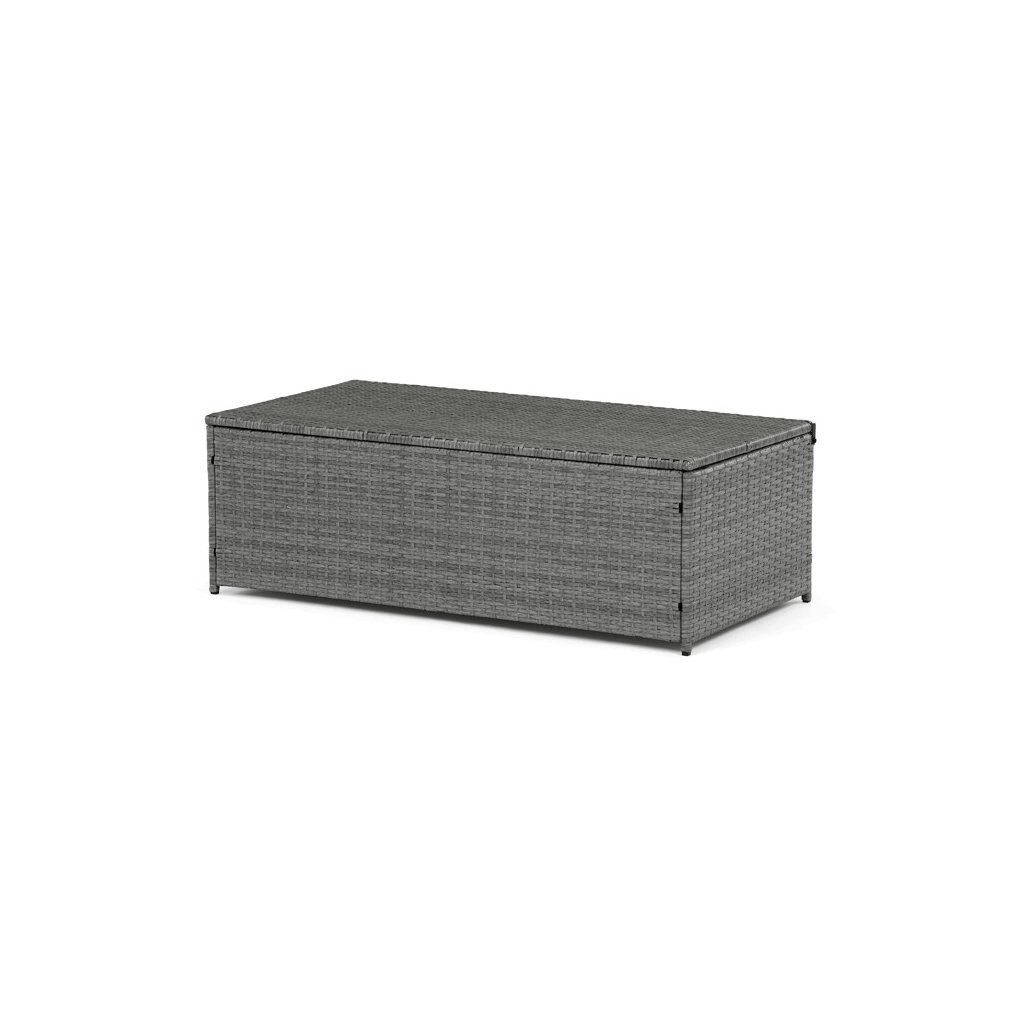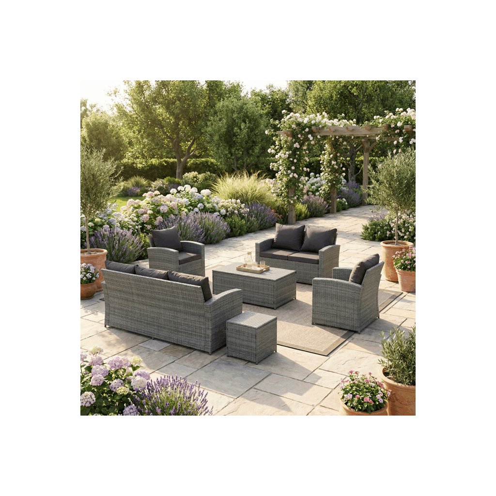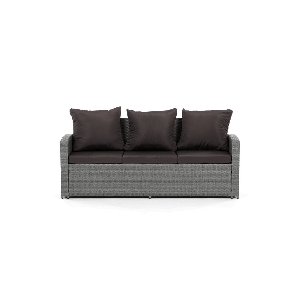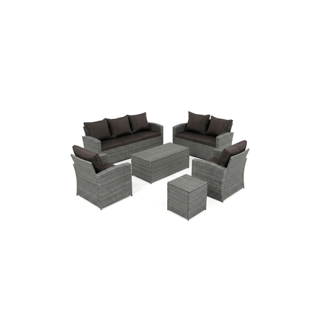 Zahradní sestava kombinuje moderní design s praktickými funkcemi pro pohodlné venkovní posezení. Pevný rám z kovu je opleten kvalitním šedým polyratanem, který je odolný vůči povětrnostním vlivům a snadno se udržuje. Sestava obsahuje dvěi samostatná křesla dvoumístnou a trojmístnou pohovku, všechny vybavené tmavě šedými polstrovanými sedáky a opěrkami pro zvýšení komfortu. Součástí je také stolek s víkem, pod kterým se nachází úložný prostor vhodný pro uskladnění polštářů nebo drobných zahradních doplňků. Variabilní konfigurace umožňuje sestavu přizpůsobit různým prostorům a potřebám, přičemž stabilní konstrukce zajišťuje dlouhodobou životnost a komfortní užívání.