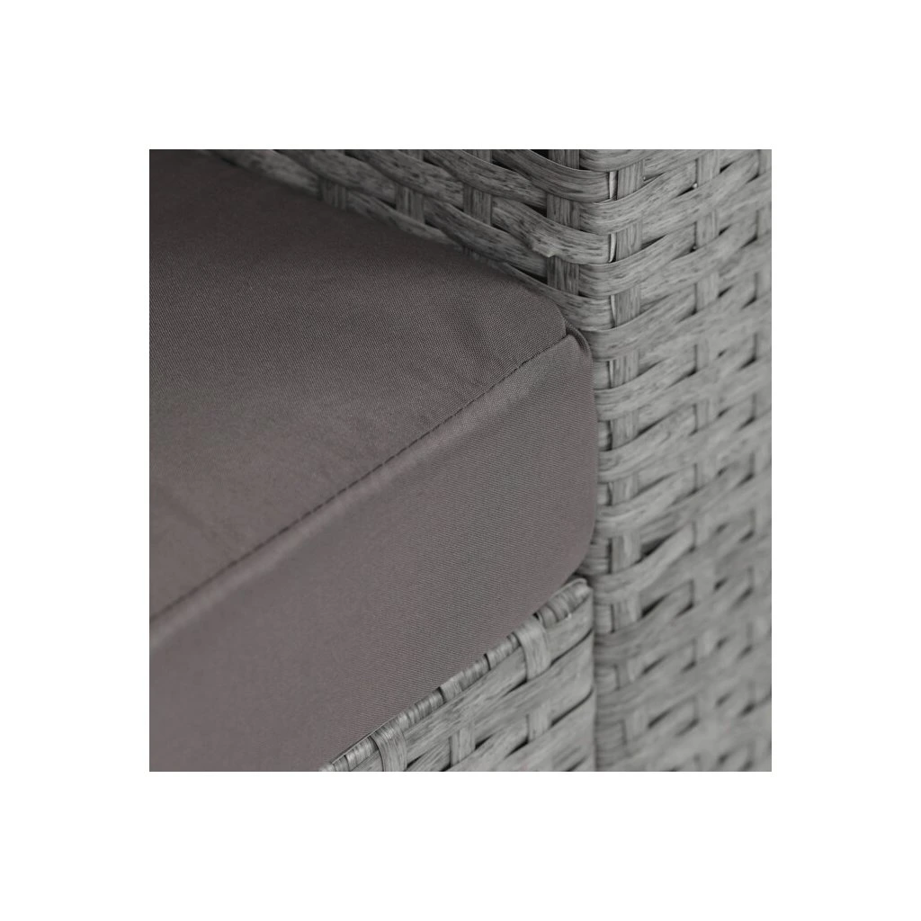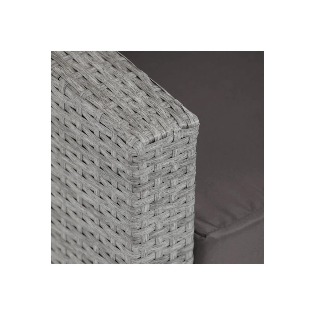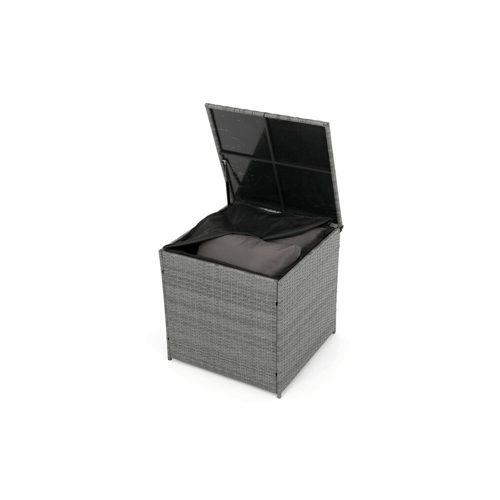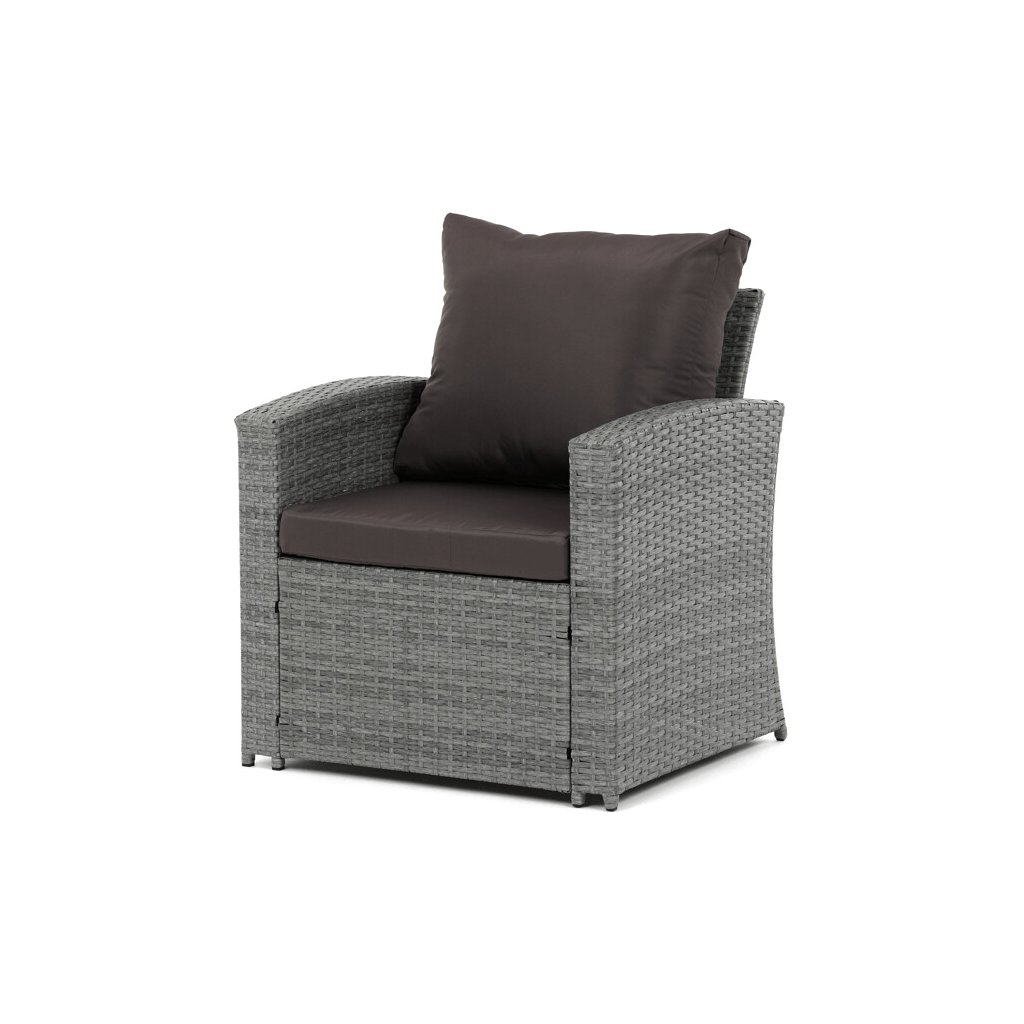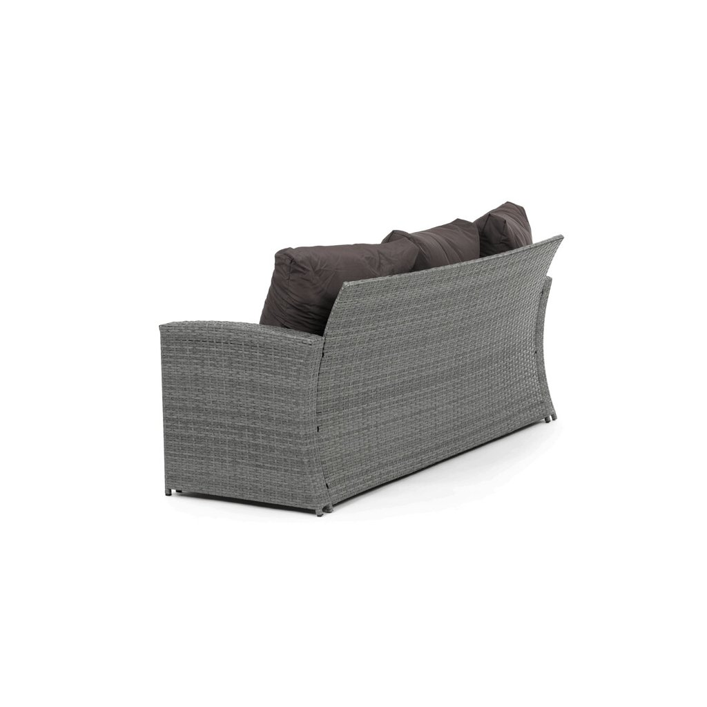 Zahradní sestava kombinuje moderní design s praktickými funkcemi pro pohodlné venkovní posezení. Pevný rám z kovu je opleten kvalitním šedým polyratanem, který je odolný vůči povětrnostním vlivům a snadno se udržuje. Sestava obsahuje dvěi samostatná křesla dvoumístnou a trojmístnou pohovku, všechny vybavené tmavě šedými polstrovanými sedáky a opěrkami pro zvýšení komfortu. Součástí je také stolek s víkem, pod kterým se nachází úložný prostor vhodný pro uskladnění polštářů nebo drobných zahradních doplňků. Variabilní konfigurace umožňuje sestavu přizpůsobit různým prostorům a potřebám, přičemž stabilní konstrukce zajišťuje dlouhodobou životnost a komfortní užívání.