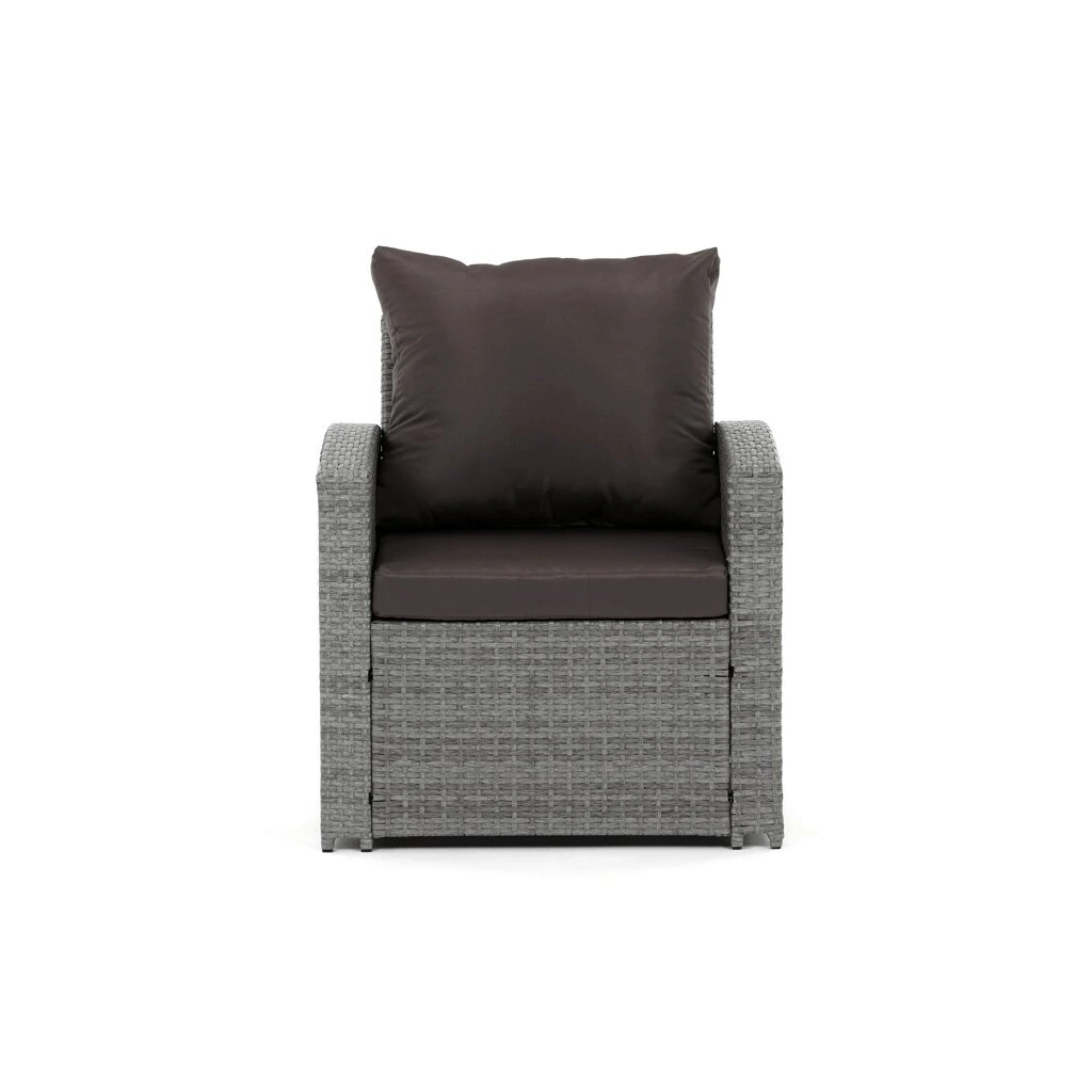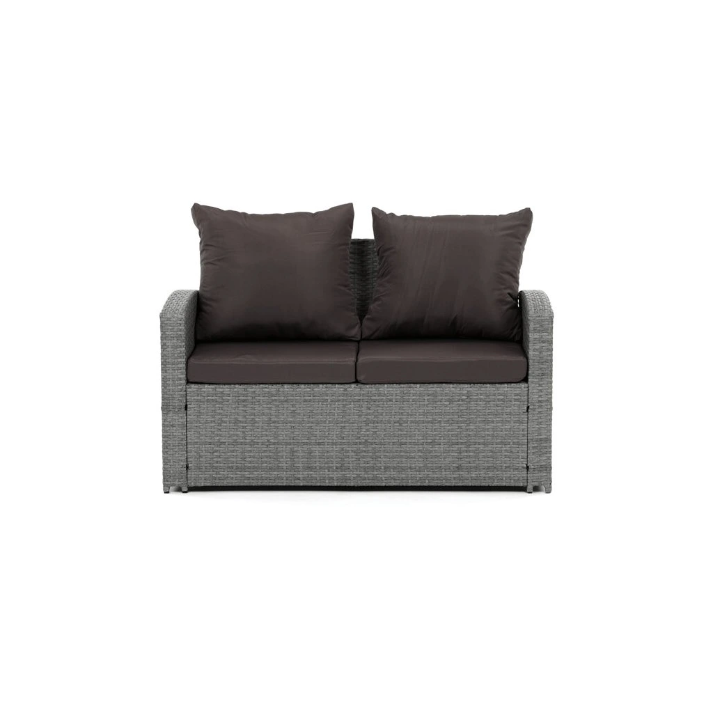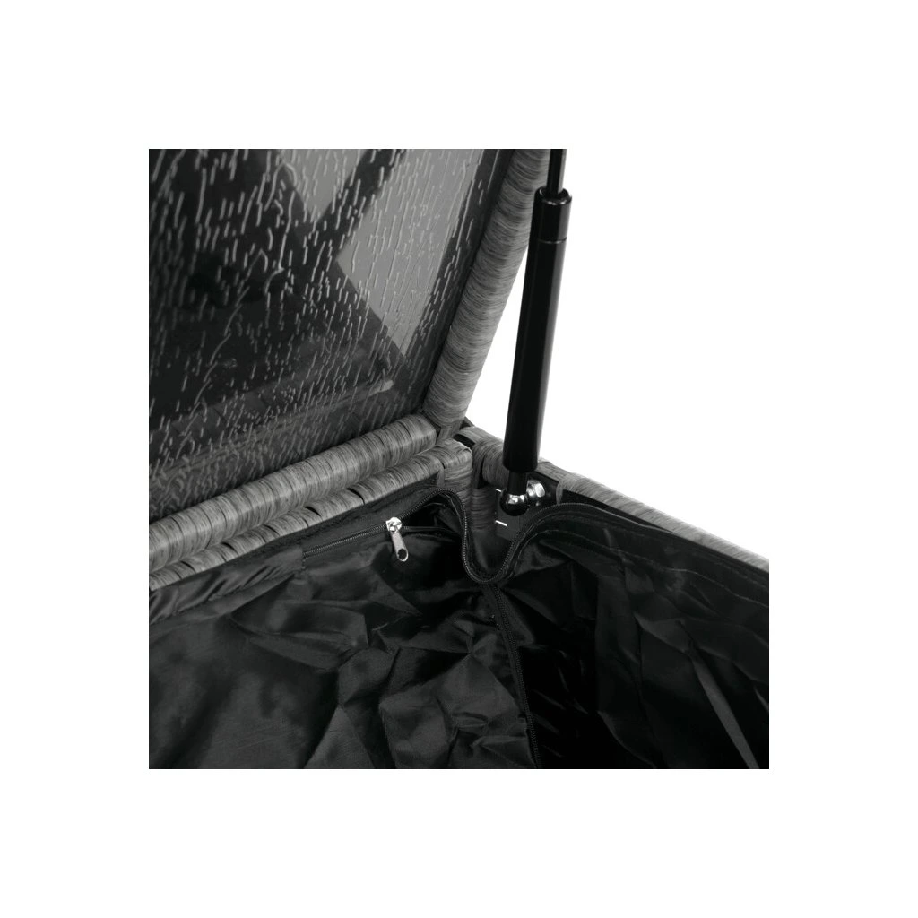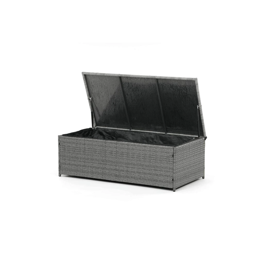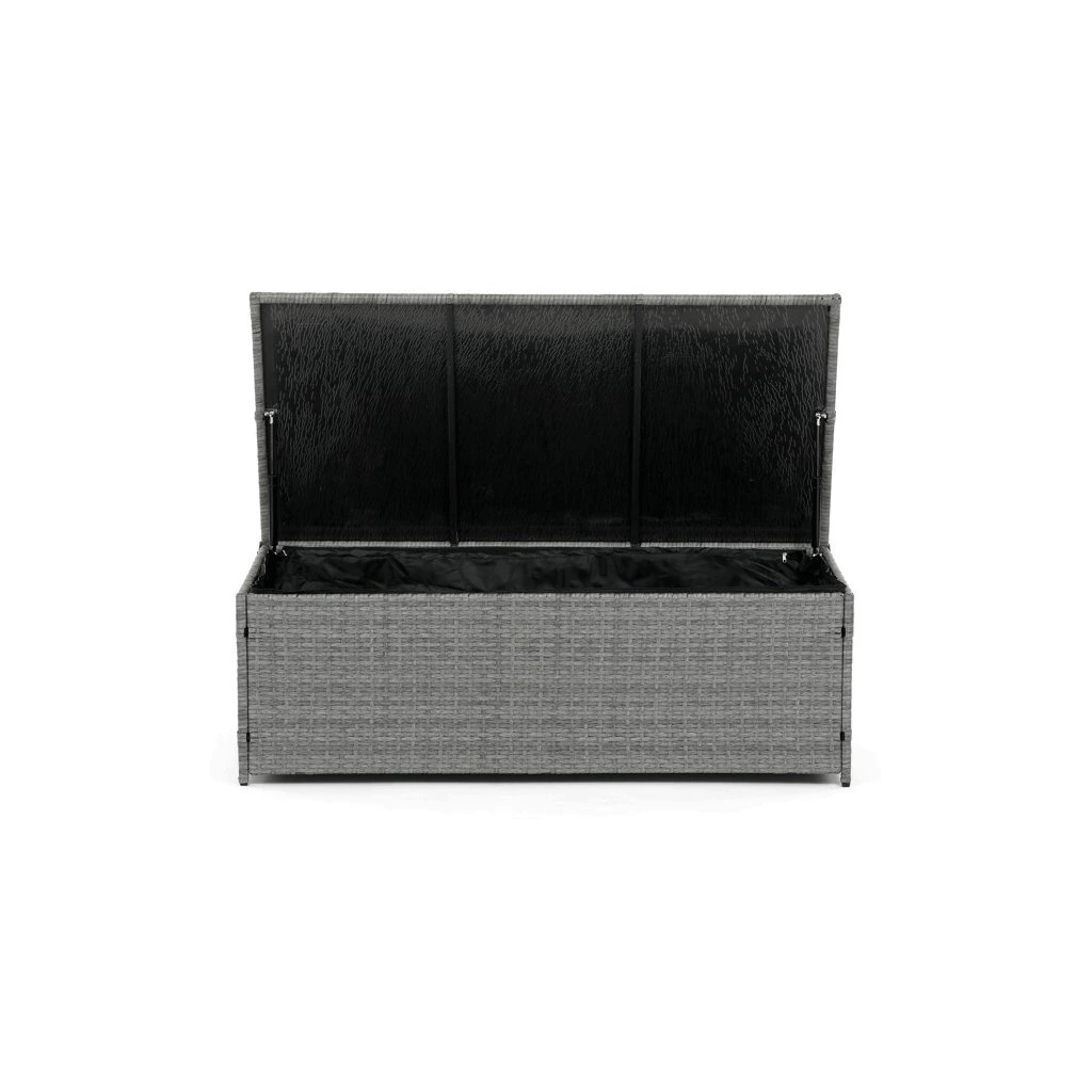 Zahradní sestava kombinuje moderní design s praktickými funkcemi pro pohodlné venkovní posezení. Pevný rám z kovu je opleten kvalitním šedým polyratanem, který je odolný vůči povětrnostním vlivům a snadno se udržuje. Sestava obsahuje dvěi samostatná křesla dvoumístnou a trojmístnou pohovku, všechny vybavené tmavě šedými polstrovanými sedáky a opěrkami pro zvýšení komfortu. Součástí je také stolek s víkem, pod kterým se nachází úložný prostor vhodný pro uskladnění polštářů nebo drobných zahradních doplňků. Variabilní konfigurace umožňuje sestavu přizpůsobit různým prostorům a potřebám, přičemž stabilní konstrukce zajišťuje dlouhodobou životnost a komfortní užívání.