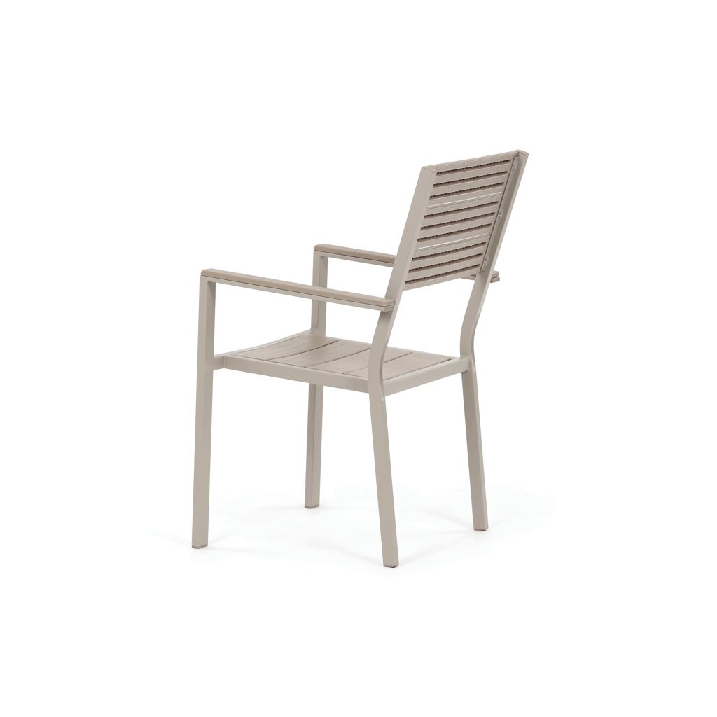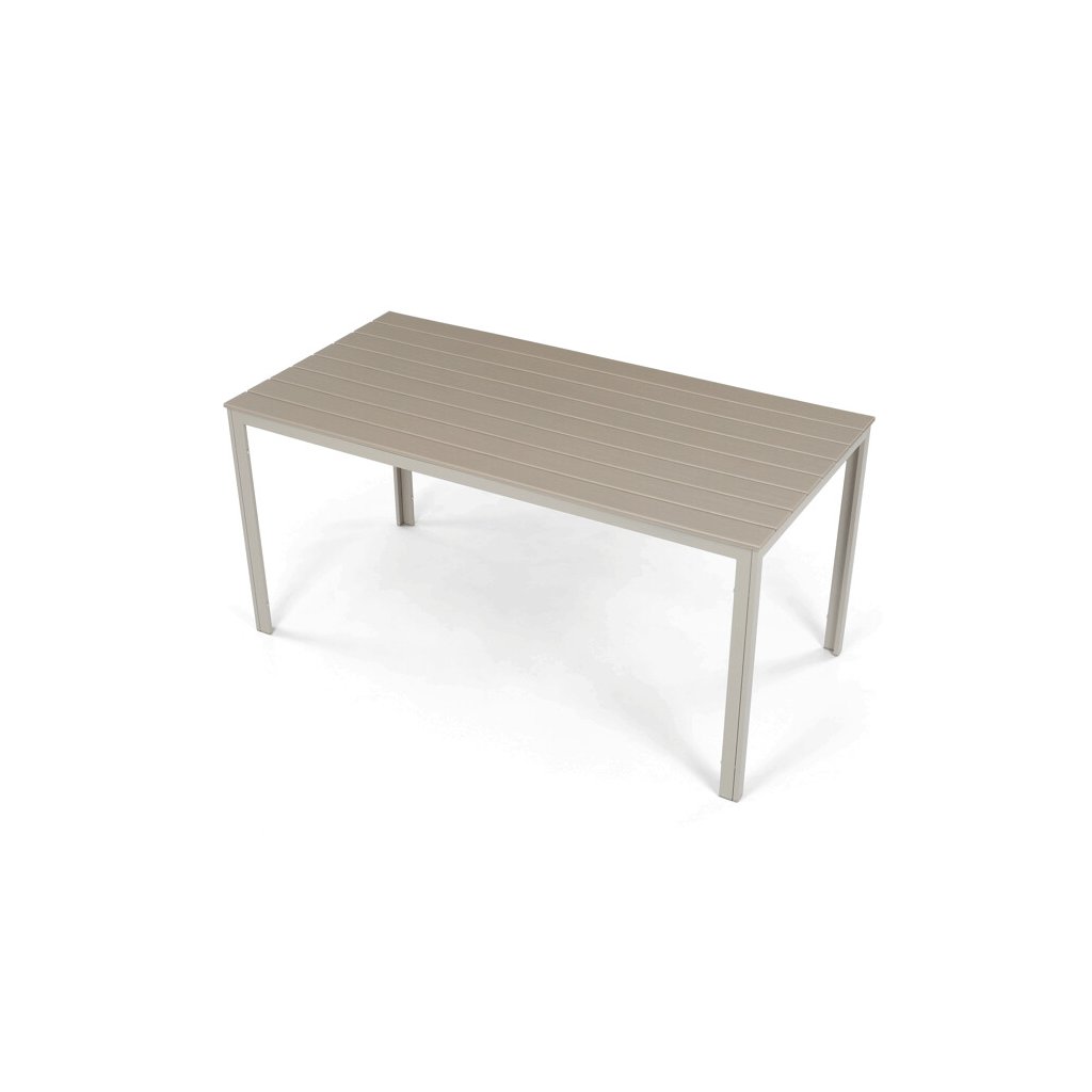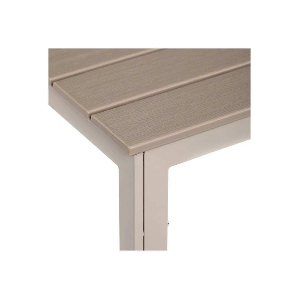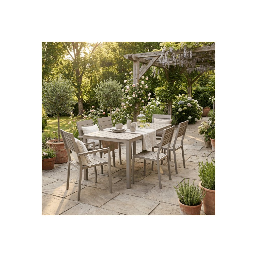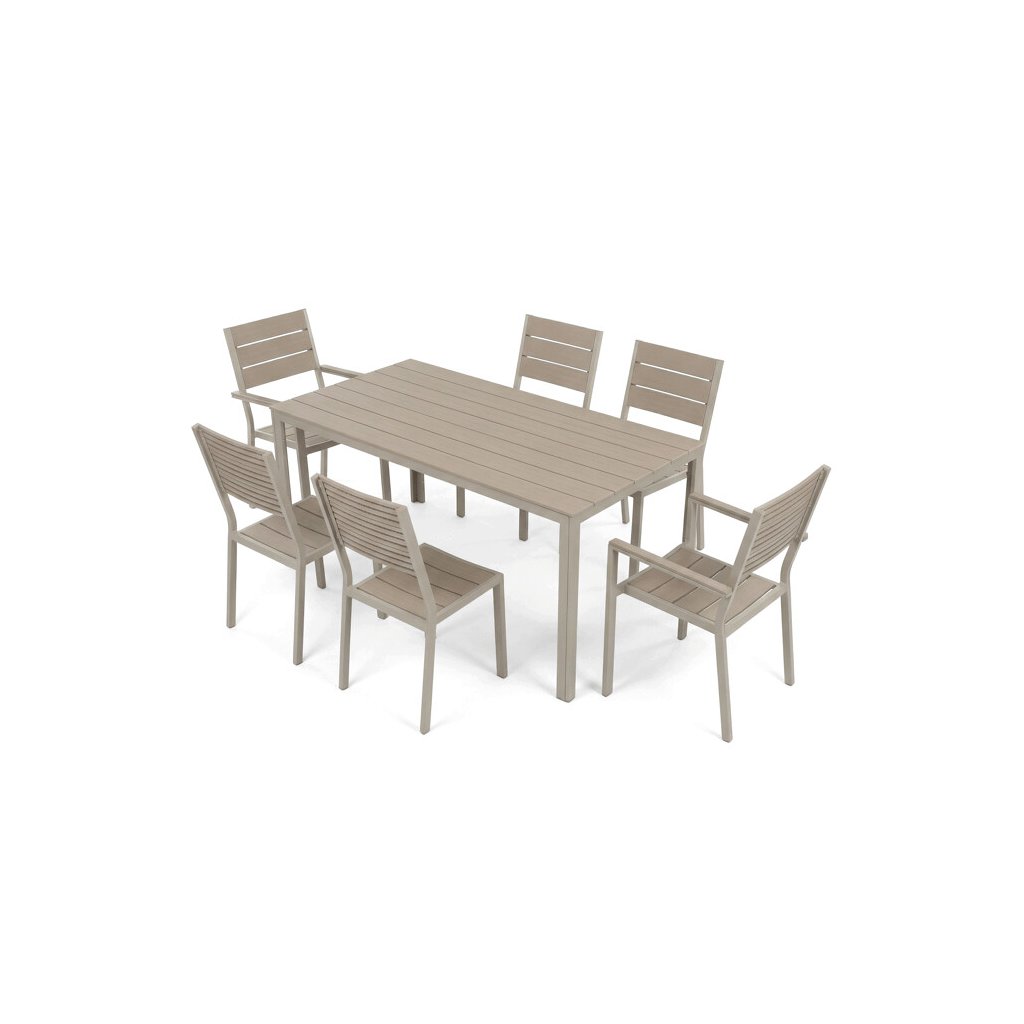 Zahradní sestava nabízí praktické a pevné řešení pro venkovní posezení. Stůl o rozměrech 156 × 78 cm má desku z polywoodu, materiálu odolného vůči povětrnostním vlivům a snadno udržovatelného, který věrně napodobuje vzhled dřeva. Rám stolu i židlí je vyroben z kovu v béžovém odstínu s práškovou povrchovou úpravou, která zajišťuje stabilitu a dlouhou životnost. Sada obsahuje šest židlí, z nichž dvě mají opěrky a područky pro pohodlnější sezení, zatímco ostatní jsou bez područek, což umožňuje variabilní uspořádání. Design s vodorovnými lamelami na sedácích a opěradlech podtrhuje moderní a zároveň nadčasový vzhled celé sestavy.