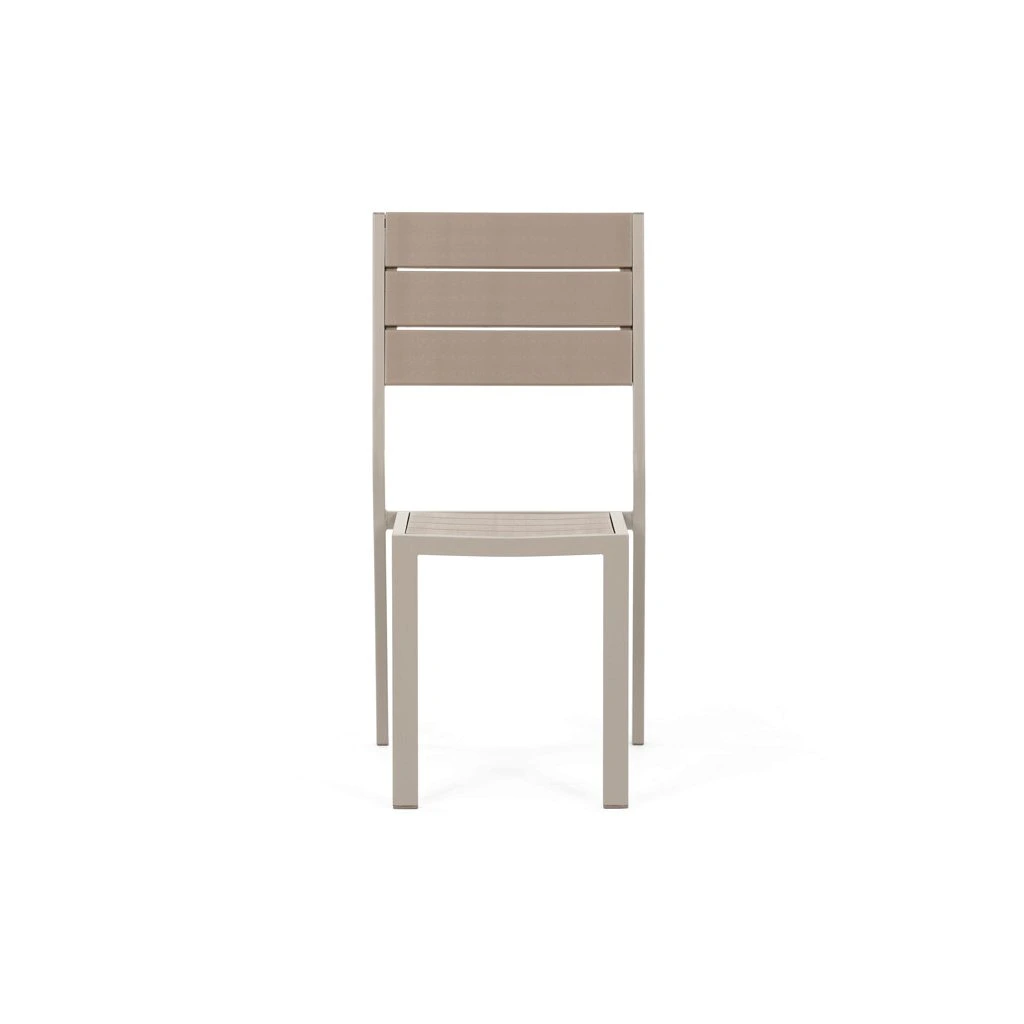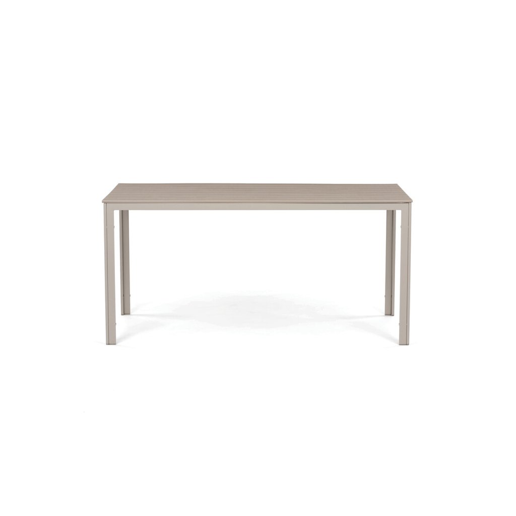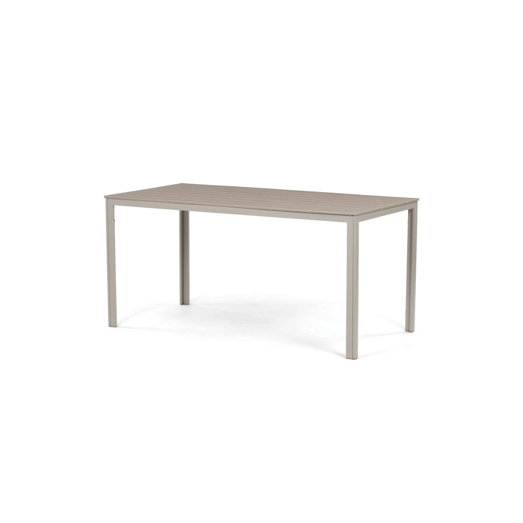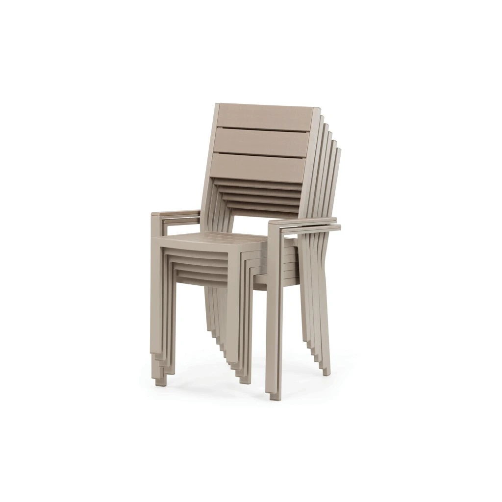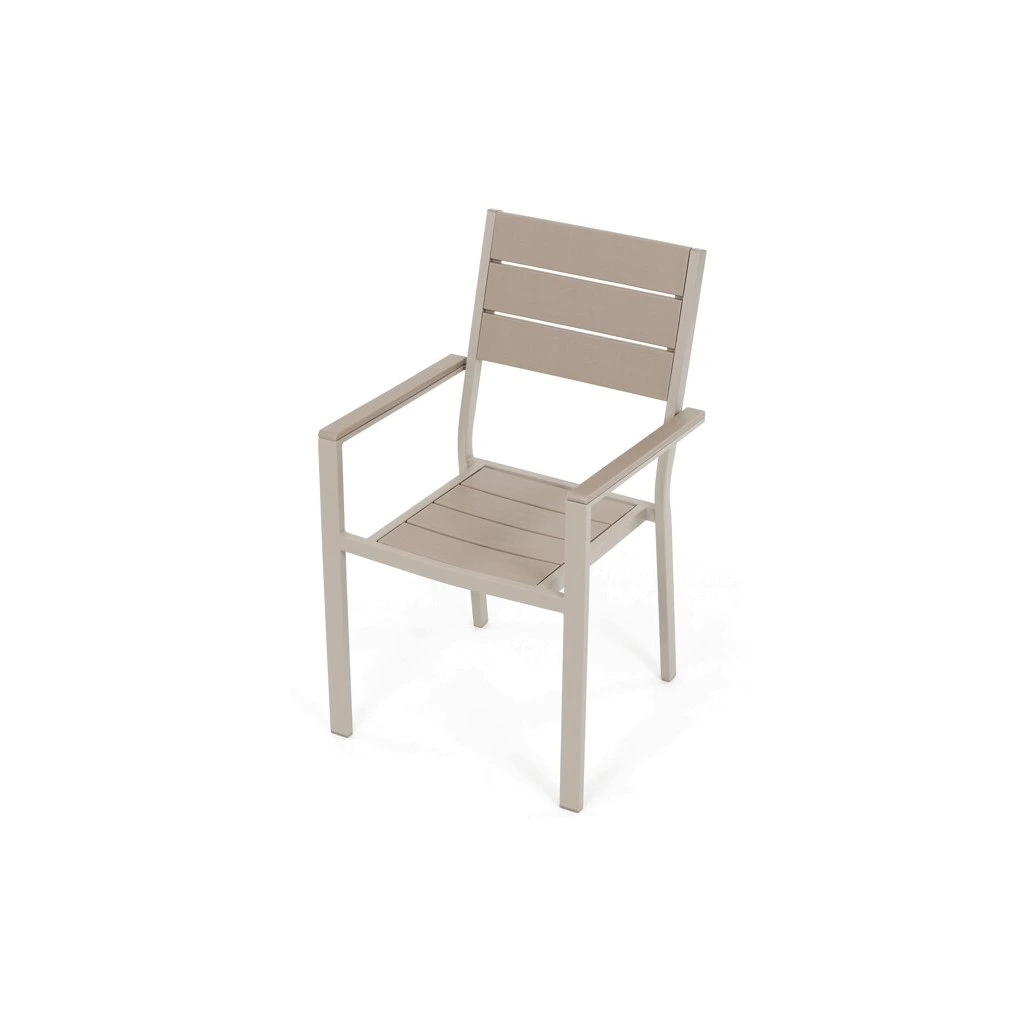 Zahradní sestava nabízí praktické a pevné řešení pro venkovní posezení. Stůl o rozměrech 156 × 78 cm má desku z polywoodu, materiálu odolného vůči povětrnostním vlivům a snadno udržovatelného, který věrně napodobuje vzhled dřeva. Rám stolu i židlí je vyroben z kovu v béžovém odstínu s práškovou povrchovou úpravou, která zajišťuje stabilitu a dlouhou životnost. Sada obsahuje šest židlí, z nichž dvě mají opěrky a područky pro pohodlnější sezení, zatímco ostatní jsou bez područek, což umožňuje variabilní uspořádání. Design s vodorovnými lamelami na sedácích a opěradlech podtrhuje moderní a zároveň nadčasový vzhled celé sestavy.