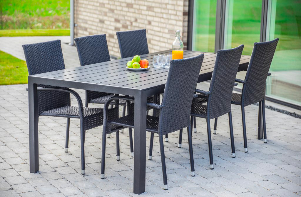 - Prostorný stůl 205x90 cm a 8 stohovatelných židlí, které šetří místo, když je zrovna nepotřebujete.