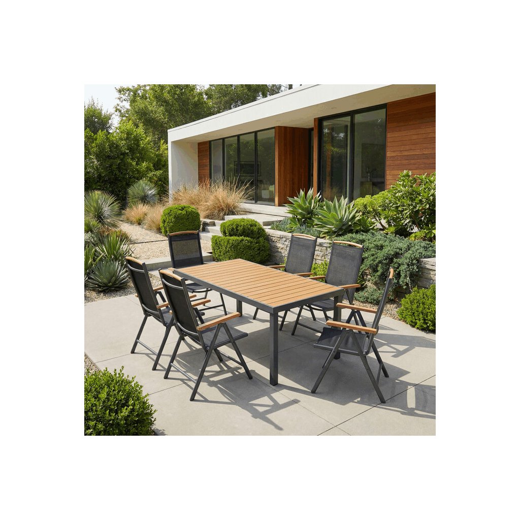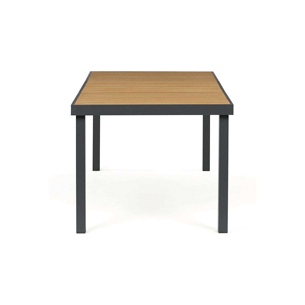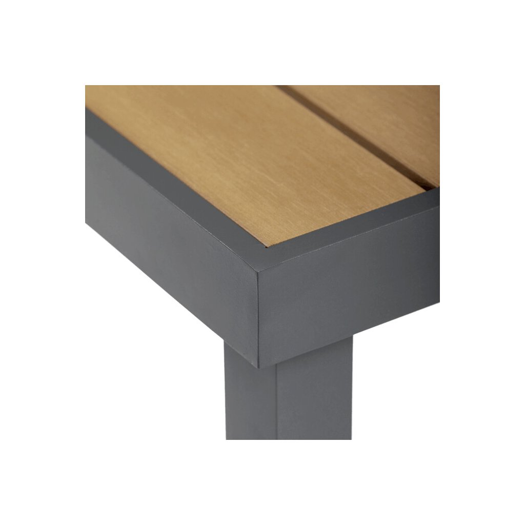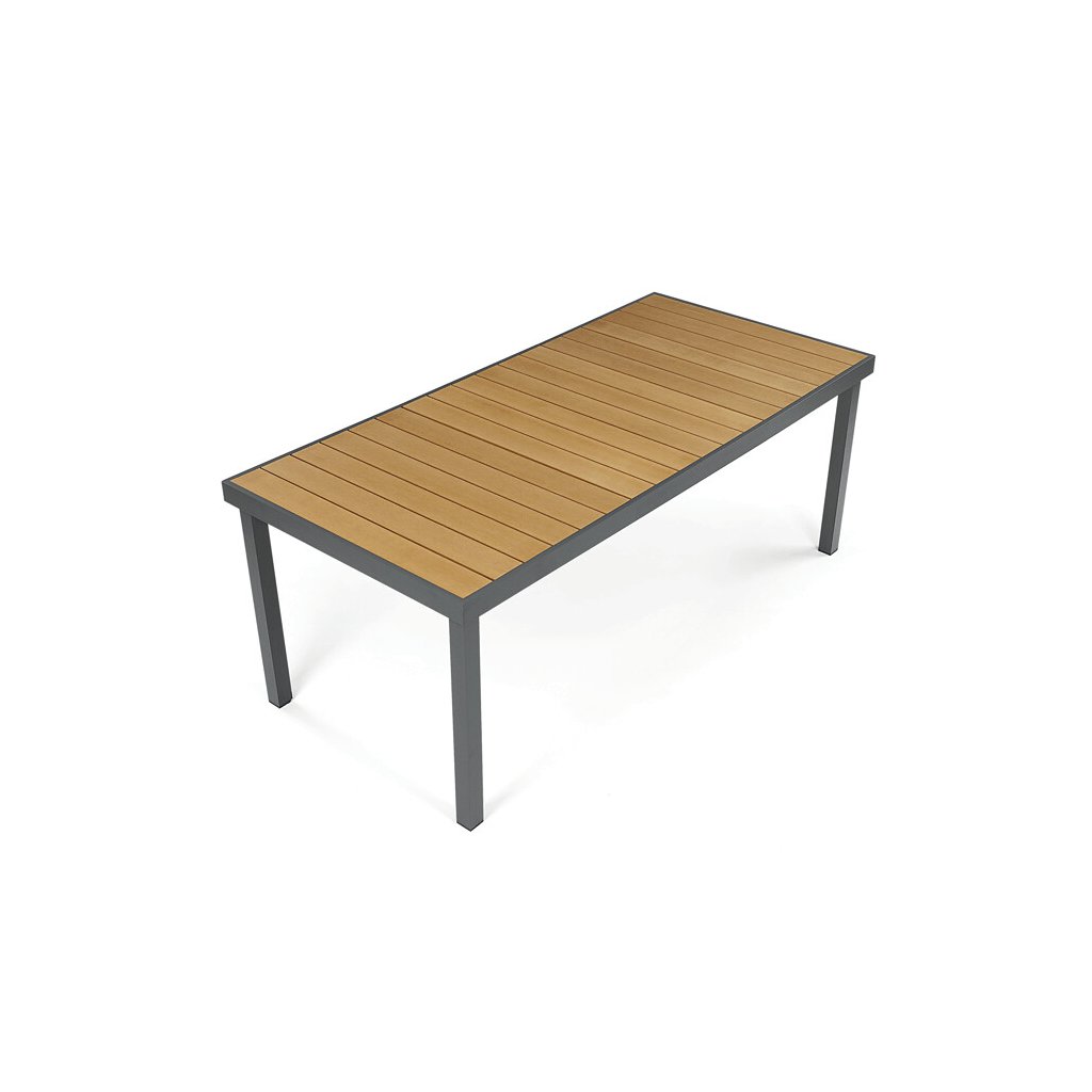 Zahradní stůl o rozměrech 190x90 cm kombinuje pevnou hliníkovou konstrukci v šedém odstínu s vysoce odolnou deskou z polywoodu v přírodních barvách, která je navržena pro dlouhou životnost a snadnou údržbu. Rektifikační nohy umožňují vyrovnání stolu na nerovném terénu, což zajišťuje stabilitu a komfort při používání. Deska stolu je tvořena z materiálu připomínajícího dřevo, který odolává povětrnostním vlivům a zachovává si estetický vzhled i při venkovním použití. Konstrukce je lehká, ale pevná, což usnadňuje manipulaci a zároveň poskytuje dostatečnou nosnost pro běžné zahradní aktivity. Tento stůl je vhodný pro různé venkovní prostory, kde je kladen důraz na funkčnost i design.