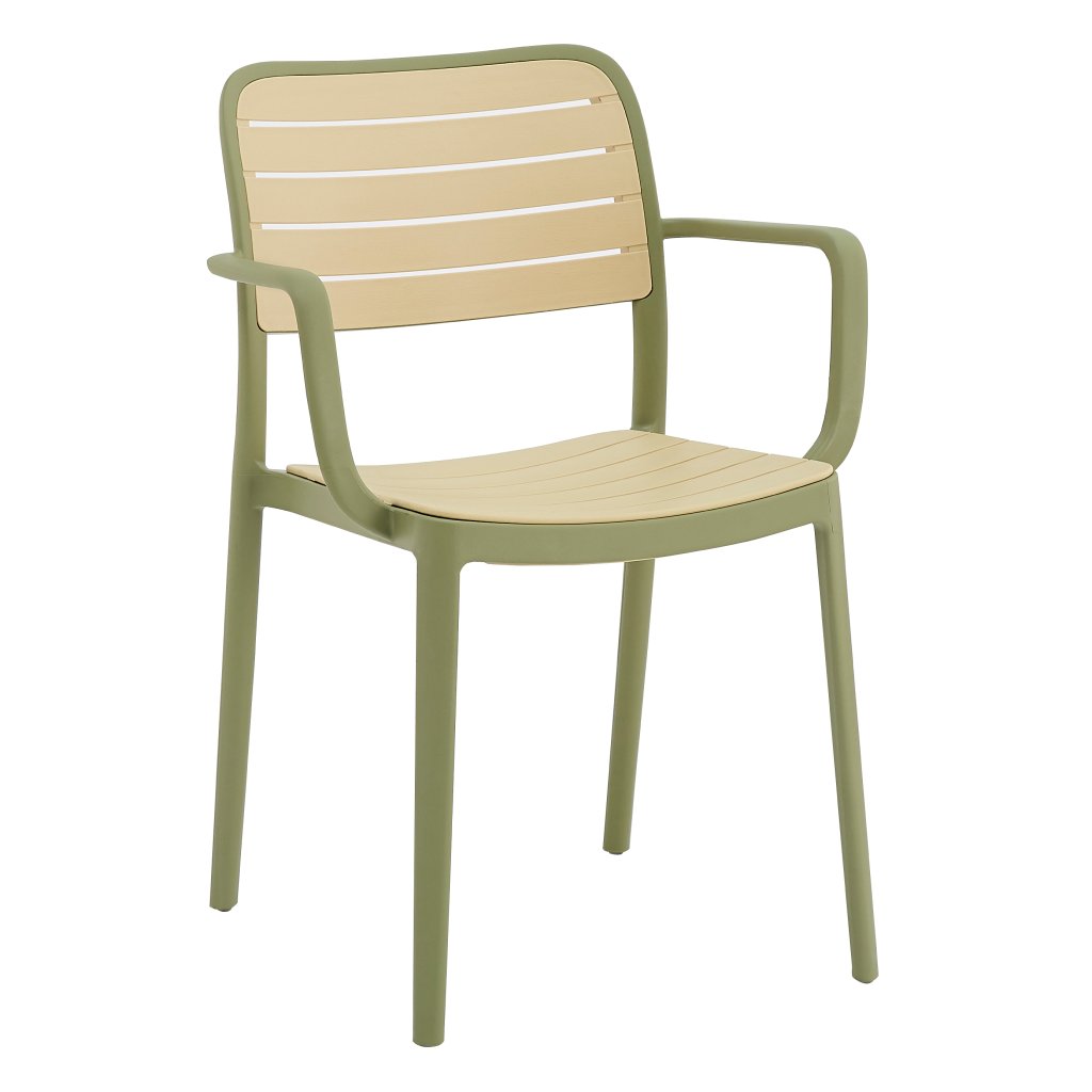 Stohovatelná venkovní židle. Materiál: plast Barva: bílá/béžová Rozměry (ŠxHxV): 58x55x81,5 cm Výška sedu: 46 cm Hloubka sedu: 43 cm Šířka sezení: 43 cm Výška zad: 39 cm...